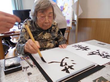 今回は「習字は小学生の頃以来だよ」というお客様のご参加があり、皆様注目していると、楷書のような字体でお書きになり皆様びっくり…。