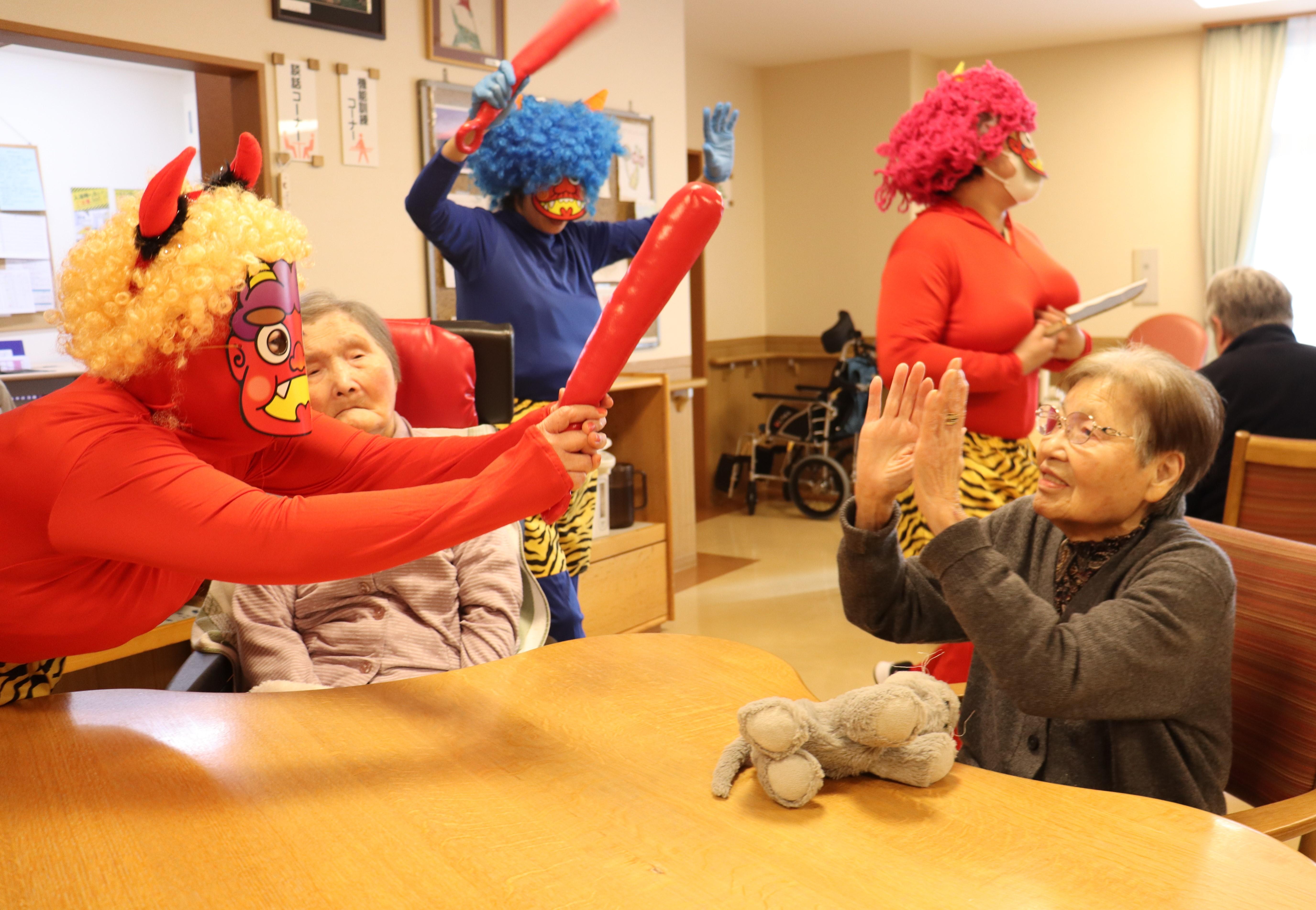 各フロアに分かれて豆まきを行いました!4匹の鬼が各フロアに登場すると、お客様の歓声が上がりました。思い思いに、鬼に豆をぶつけていました!お面を被った鬼が誰なのか、皆様興味津々の様子で盛り上がりました!!