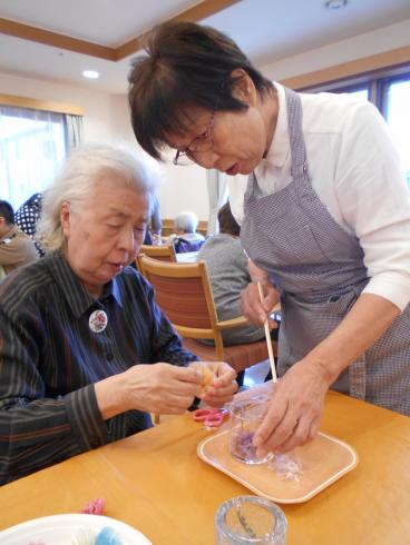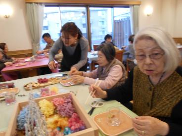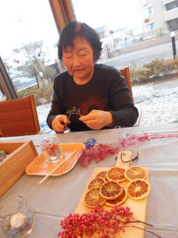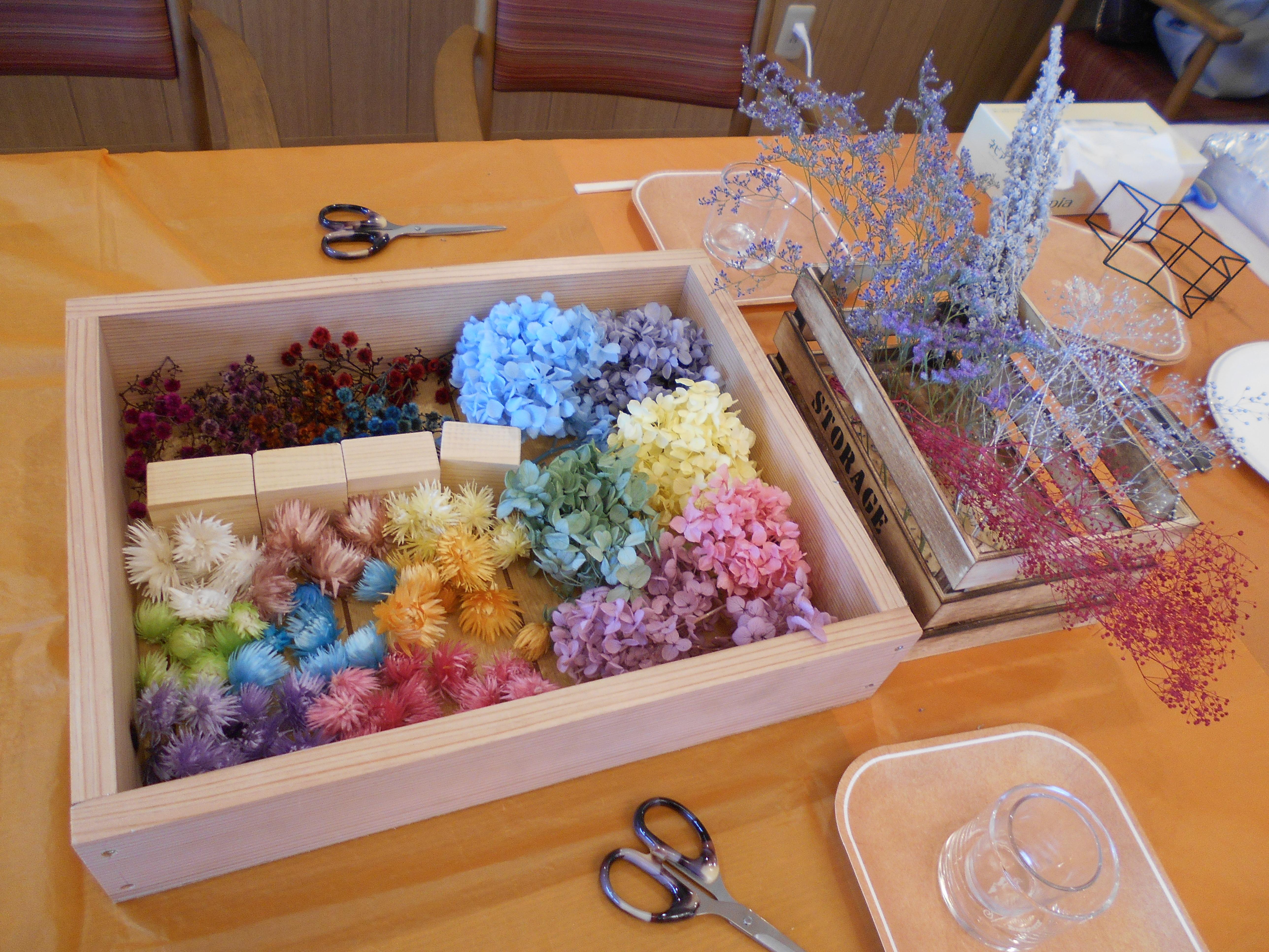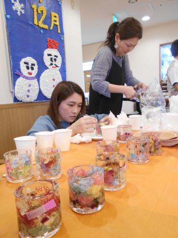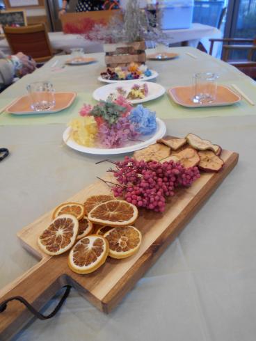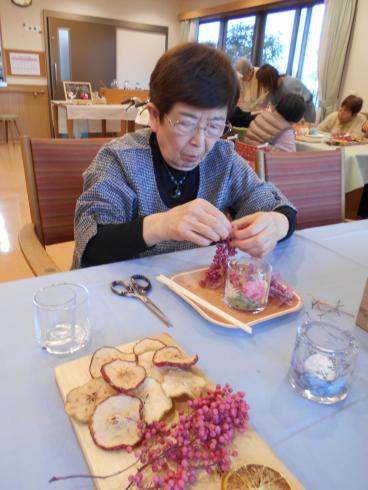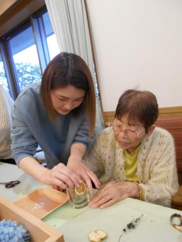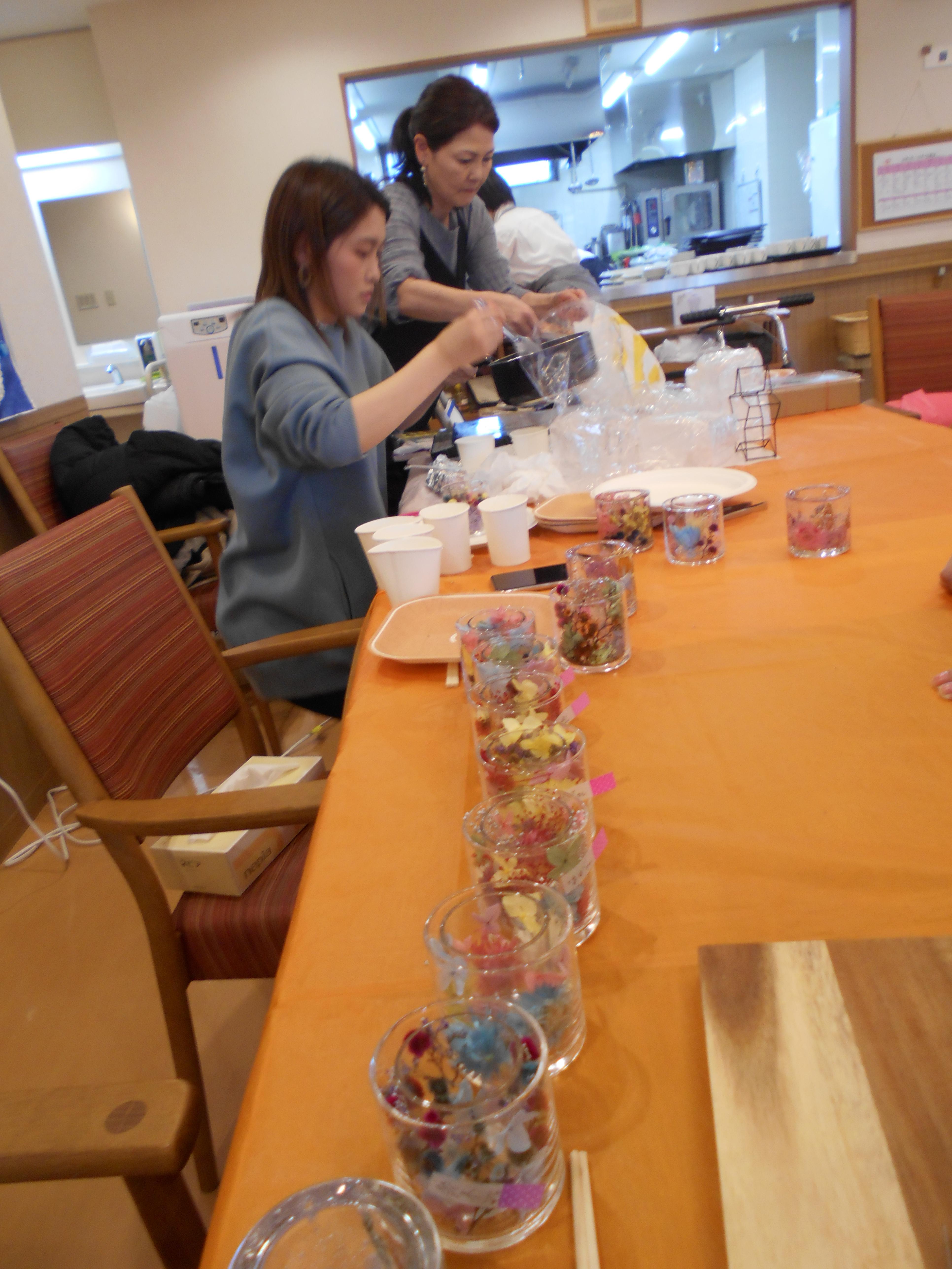 今回のサロンイベントは、いつも本格コーヒーを施設で提供してくださっている喫茶アドフル様のご紹介です。キャンドル等の雑貨制作の先生「アンシャンテ」様にお越しいただき、ドライフラワーを使ったキャンドルの制作を教えて頂きました。