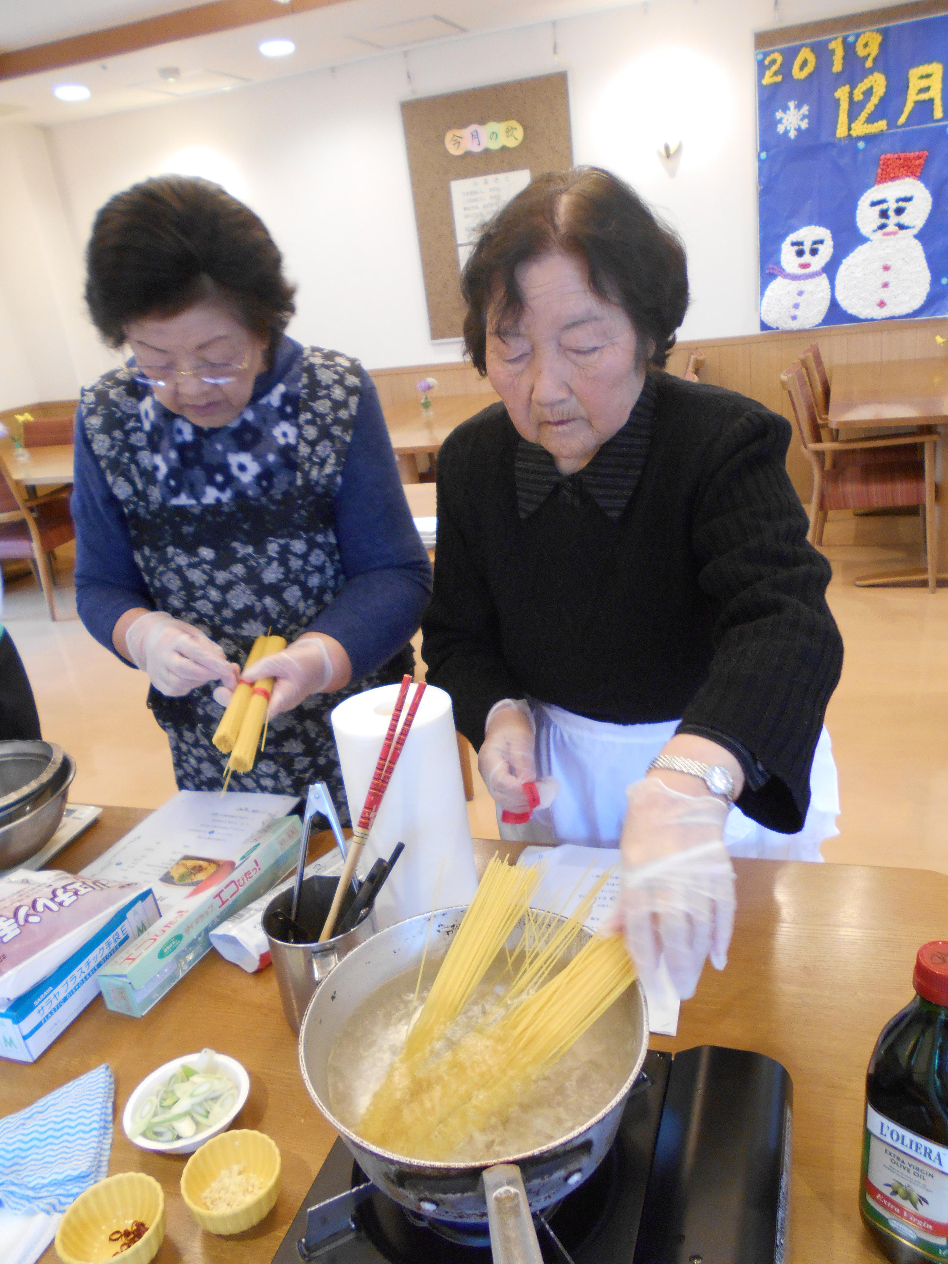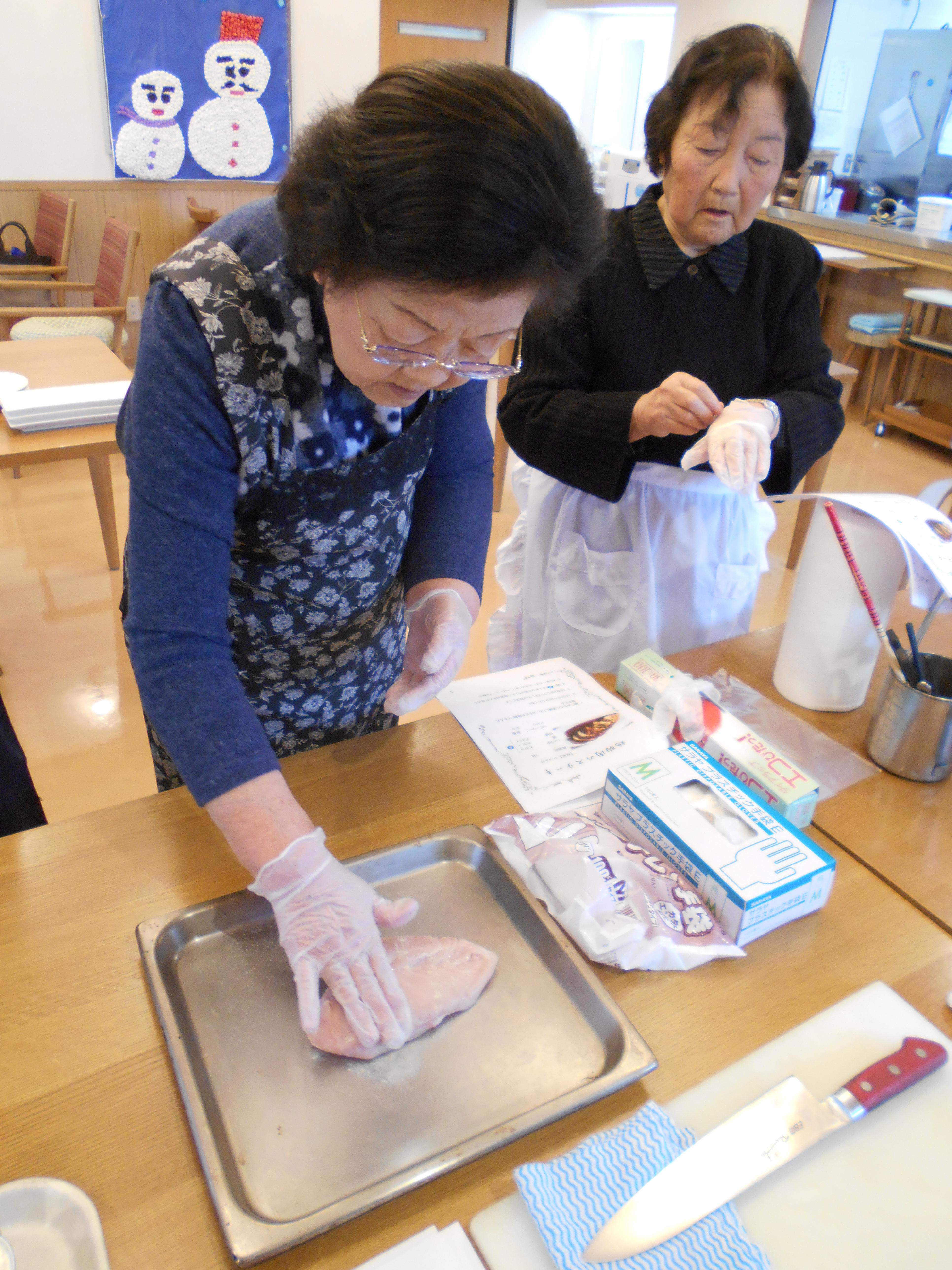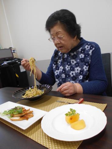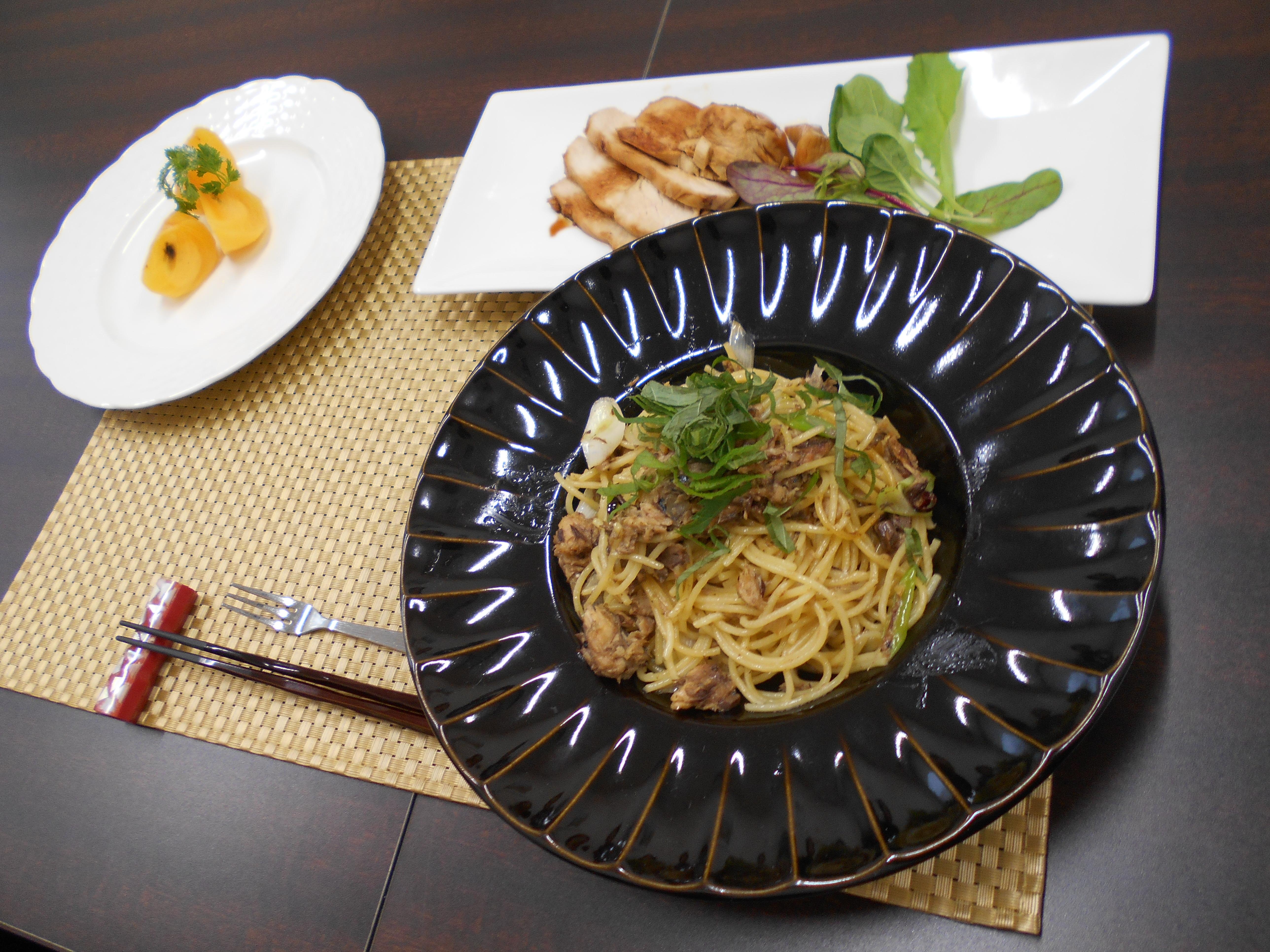 鯖缶を使ったパスタ、鶏胸肉を使ったステーキ、かきのデザートの三種を作って頂きました。