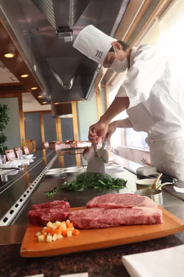 郡山の景色を眺めながら、目の前の鉄板でシェフが調理し、出来立てのお料理をご提供!!