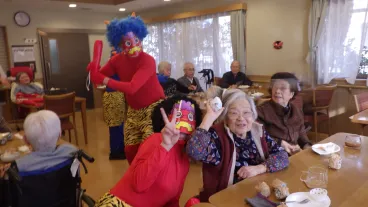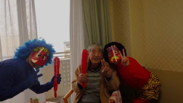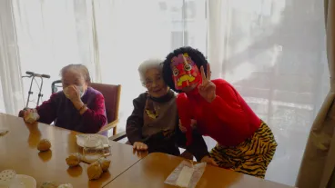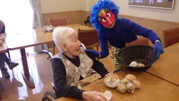 事前にお客様と一緒に作って頂いた、豆を見立てた豆ボールを鬼目がけて投げ込むお客様。