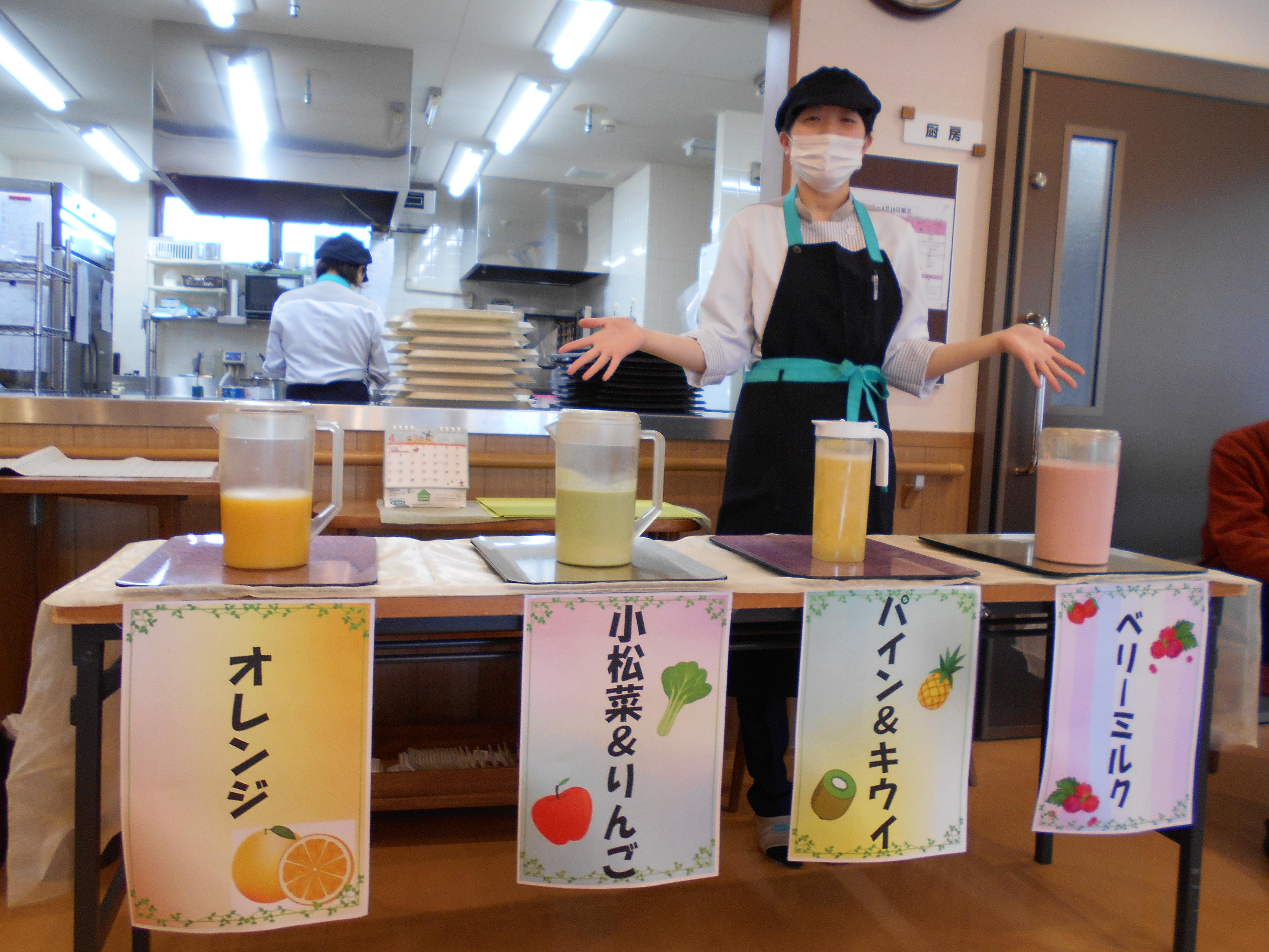 朝のラジオ体操の後に玄関先で日光浴をするのが日課になる季節ですが、今回は食堂でジュースバーを開催することとなりました。