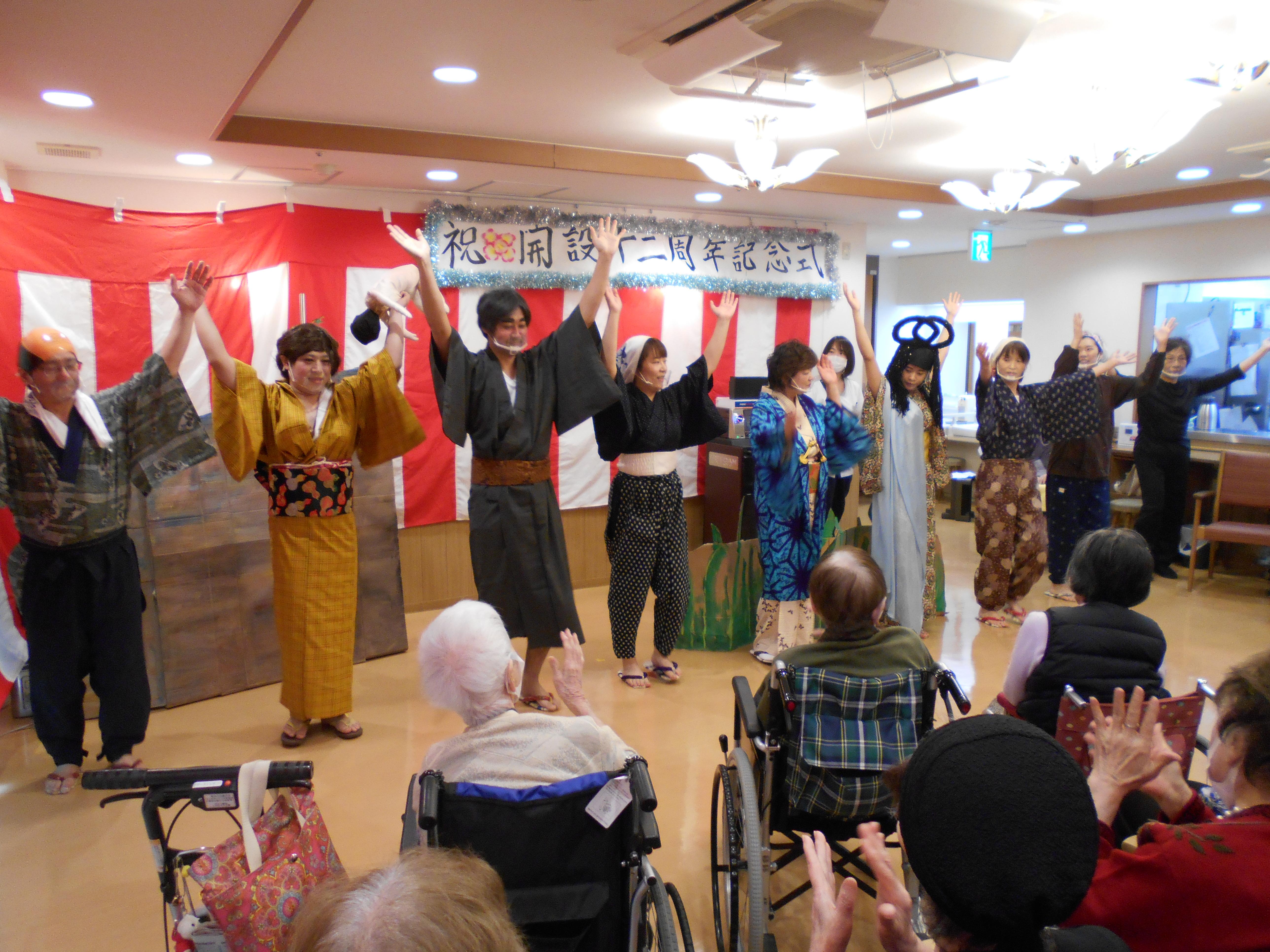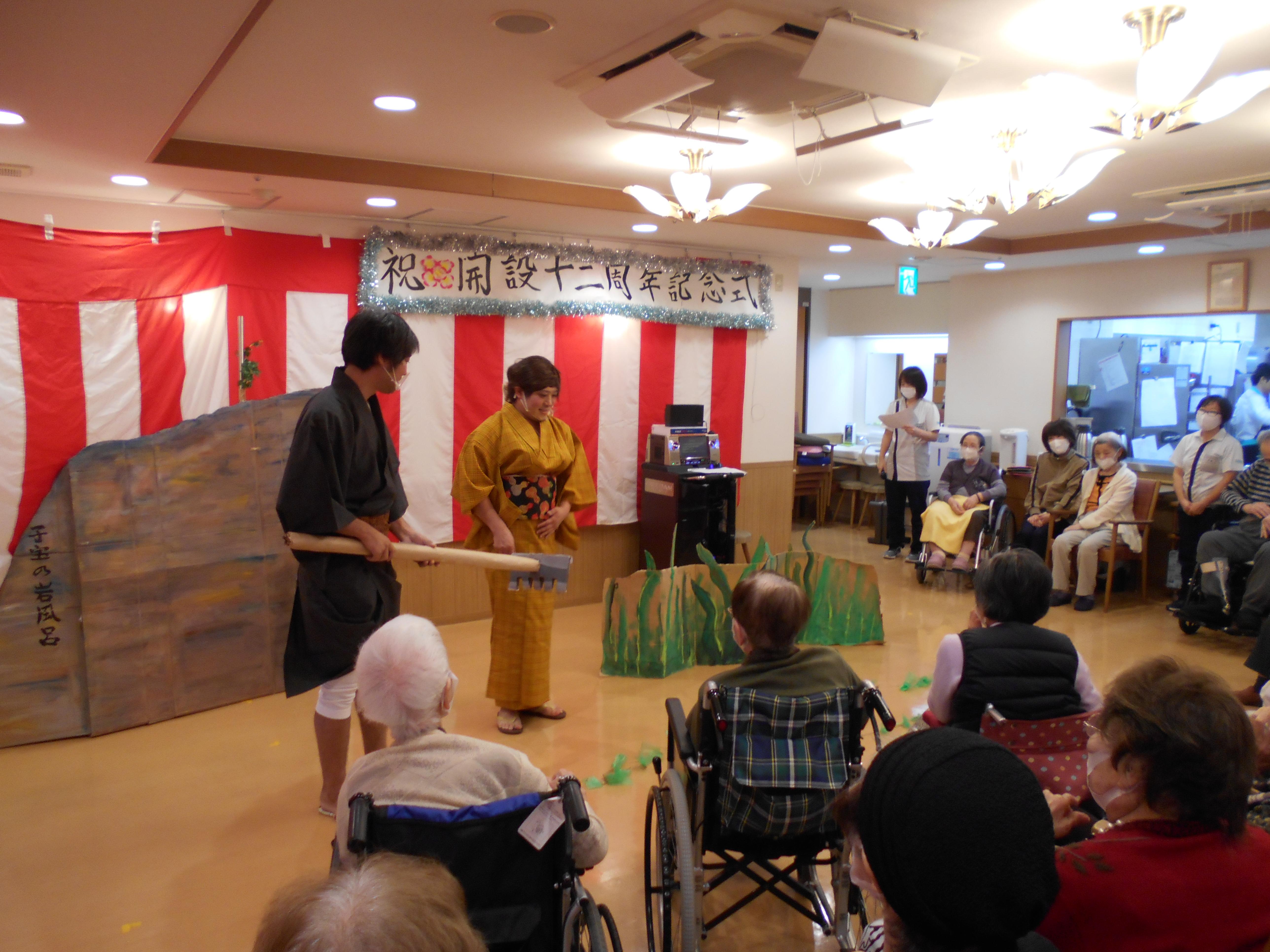 今回は入居されている皆様に楽しんでいただけるように、職員が一生懸命練習をした寸劇を見ていただきました。