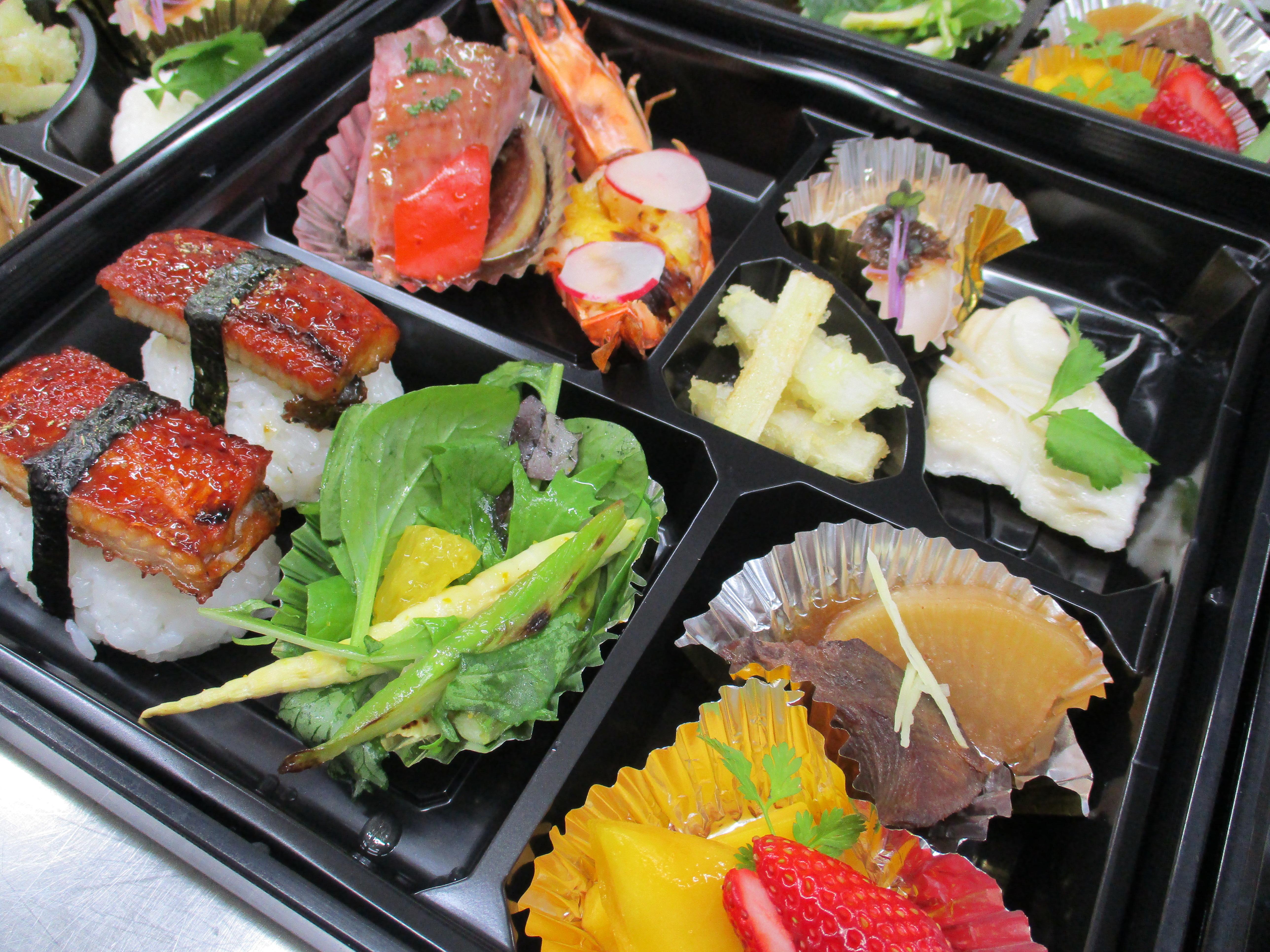 今月のプレミアム弁当のメニューは、うなぎ飯・牛たたきフォアグラのせ・季節の焼き野菜サラダ・海老の黄金焼き・帆立の田楽じゅうねん味噌・牛タンの角煮・真鯛の酒蒸し・うどの天ぷら・季節のフルーツ(マンゴー・いちご)でした!