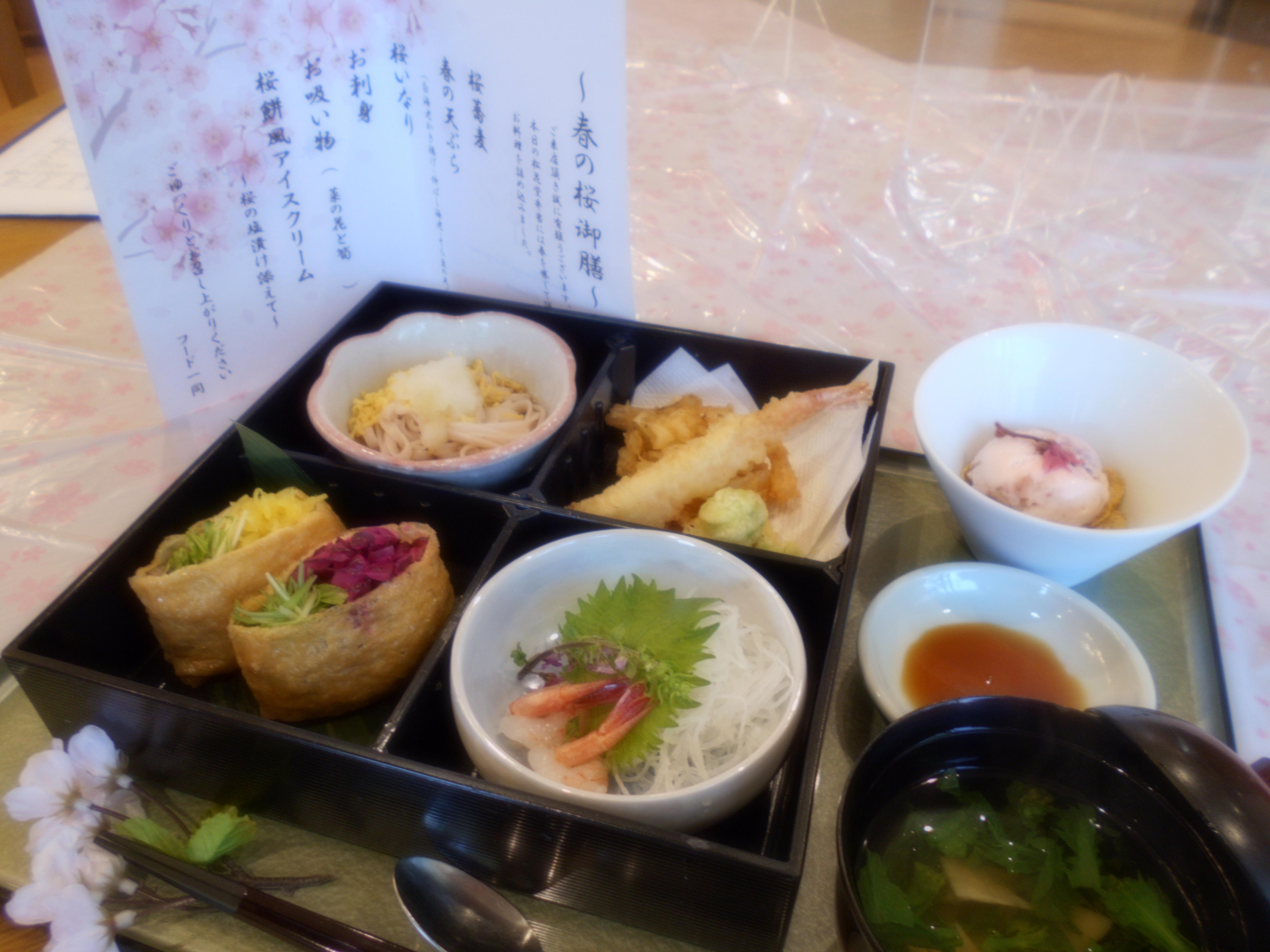 桜御膳のメニューは、桜蕎麦・春のてんぷら(白海老かき揚げ、伸ばし海老、そら豆の天ぷら)・桜いなり・お刺身・お吸い物・桜餅風アイスクリームでした!