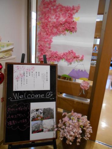 食堂に入る廊下にも桜を飾り、雰囲気を演出しました。