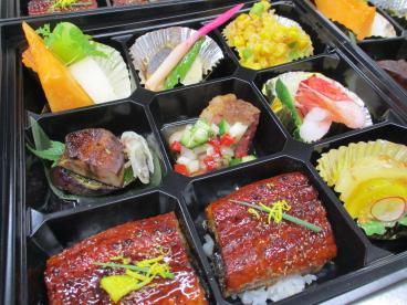 メニューは、うな重・和牛ステーキ彩りあん・フォアグラと茄子のはさみ焼き・白身魚の煮付け・お刺身盛り合わせ・とうもろこしと枝豆の天ぷら・オーガニック自家栽培じゃが芋サラダ・すまし汁・季節のフルーツでした!