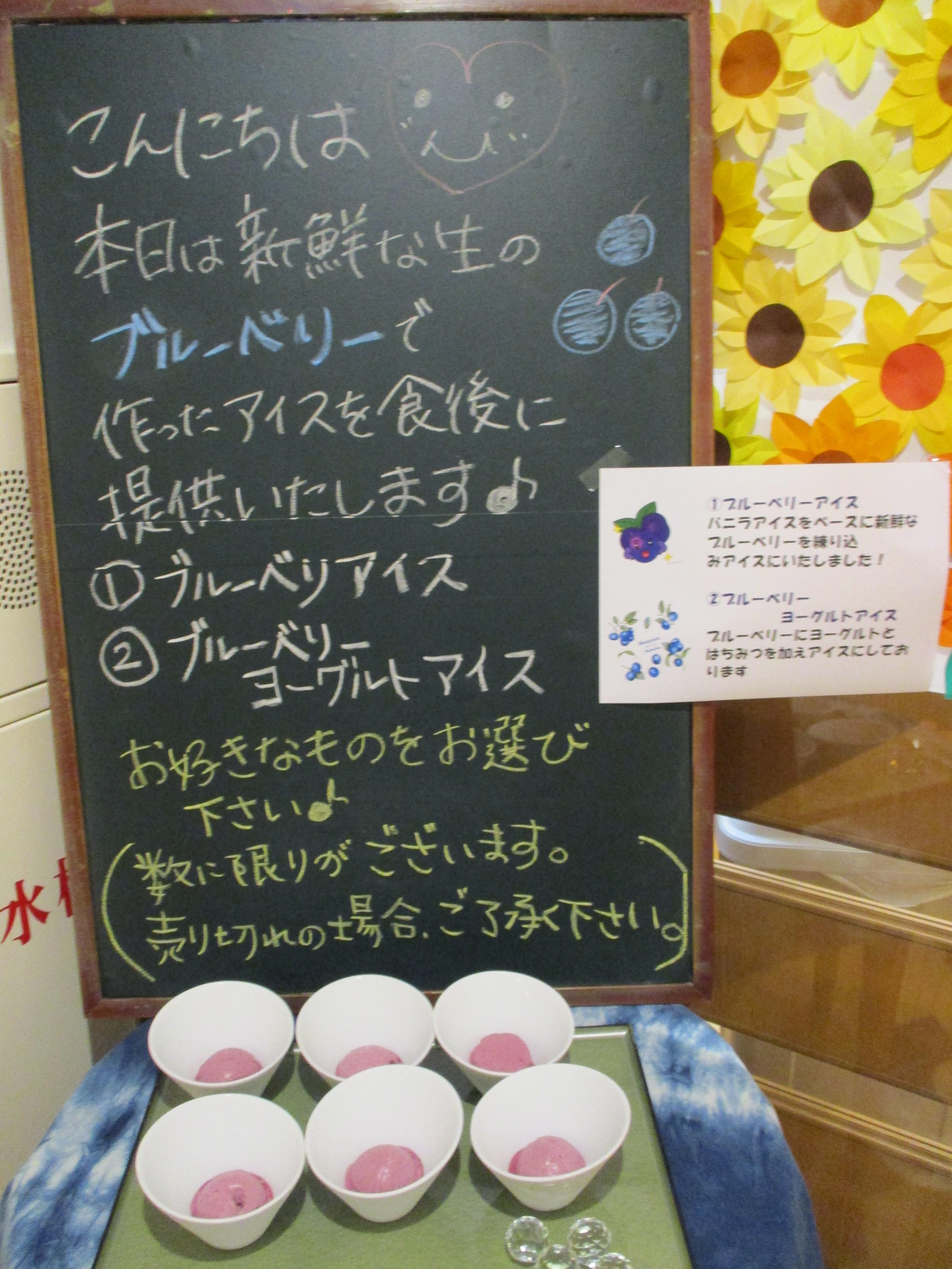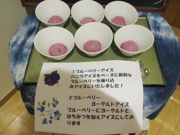 二品目は、アイスにして召し上がっていただきました。ブルーベリーアイスとブルーベリーヨーグルトアイスの二種類を準備して、お好きな物を選んでいただきました。