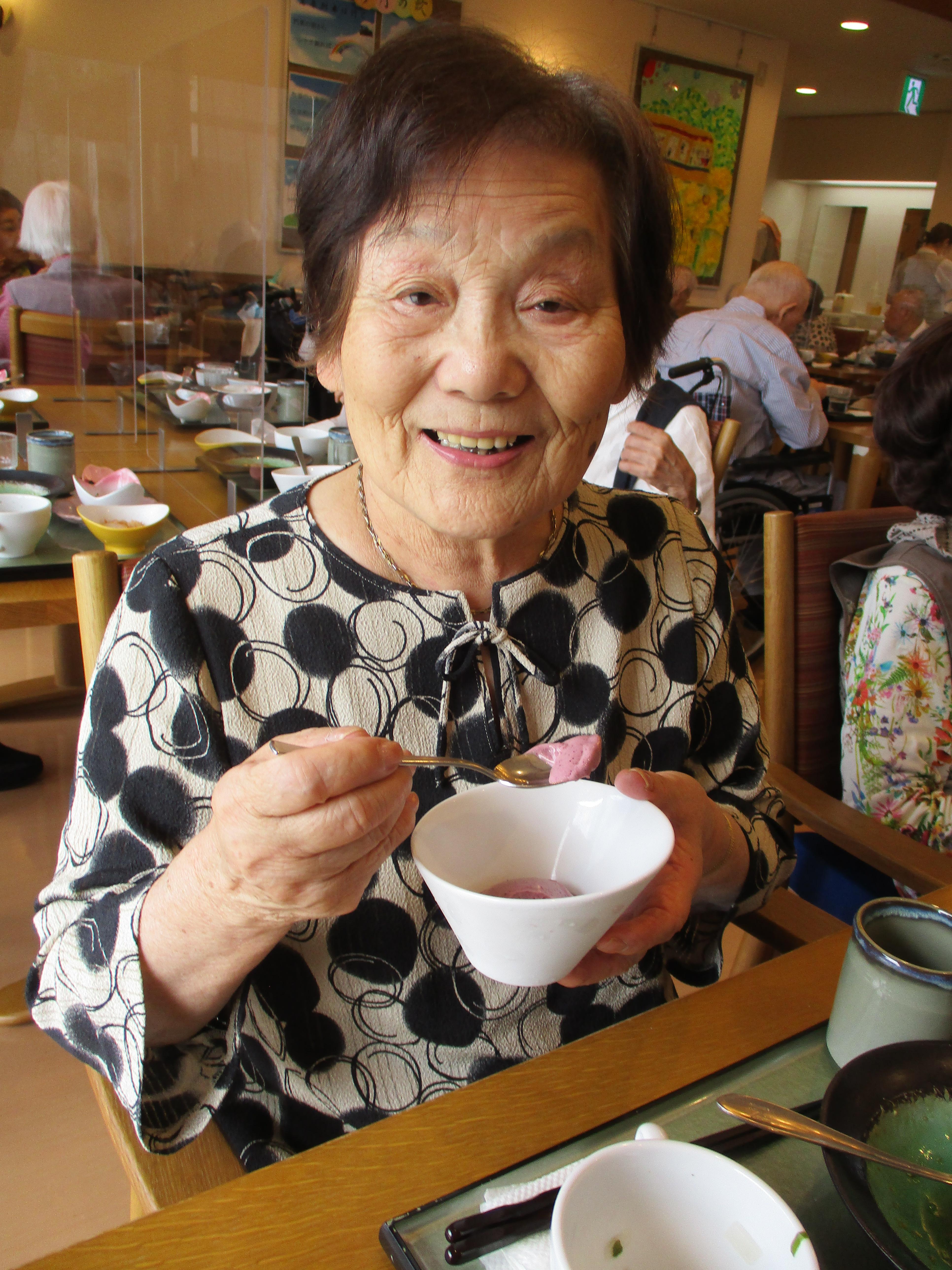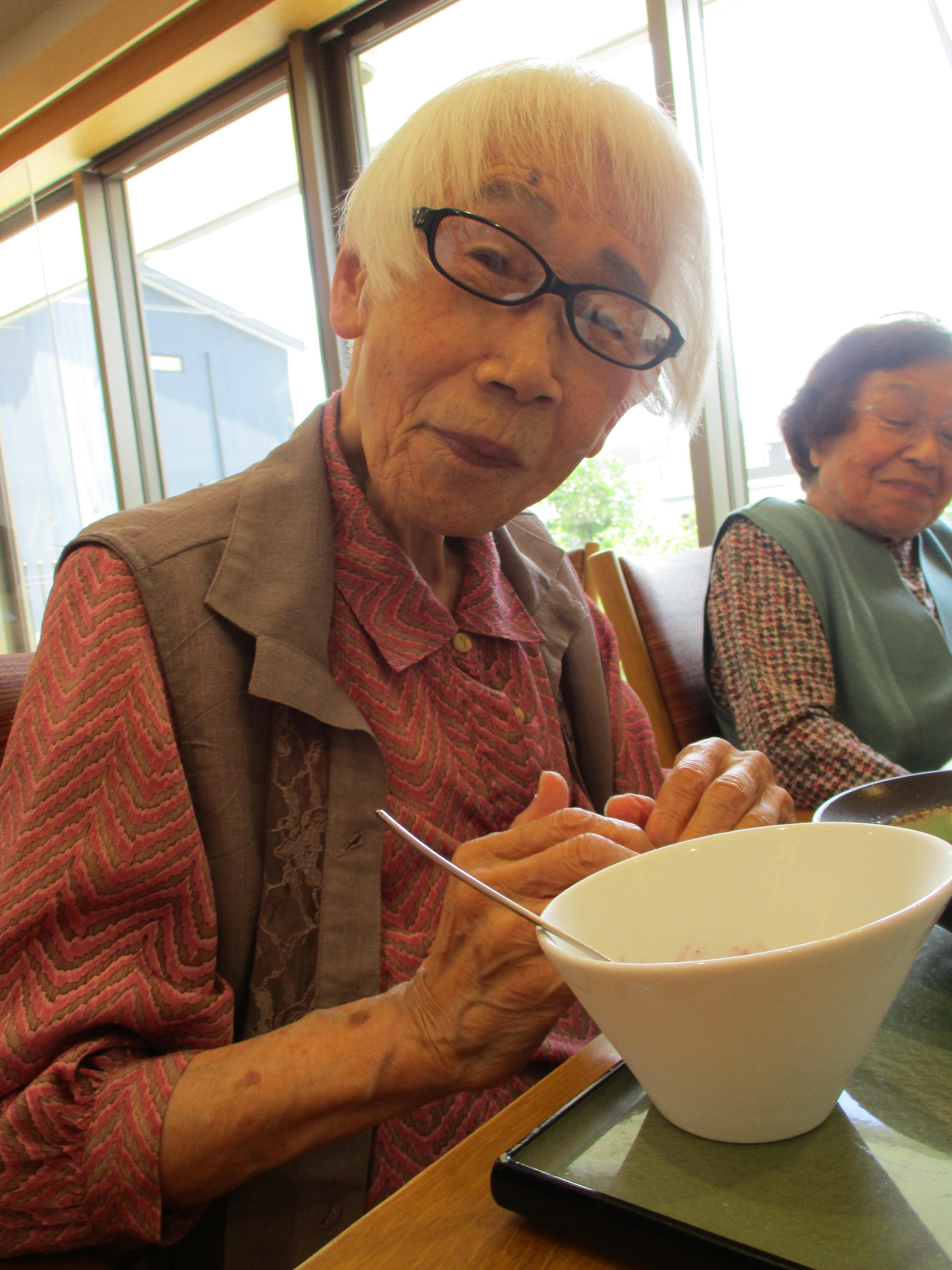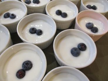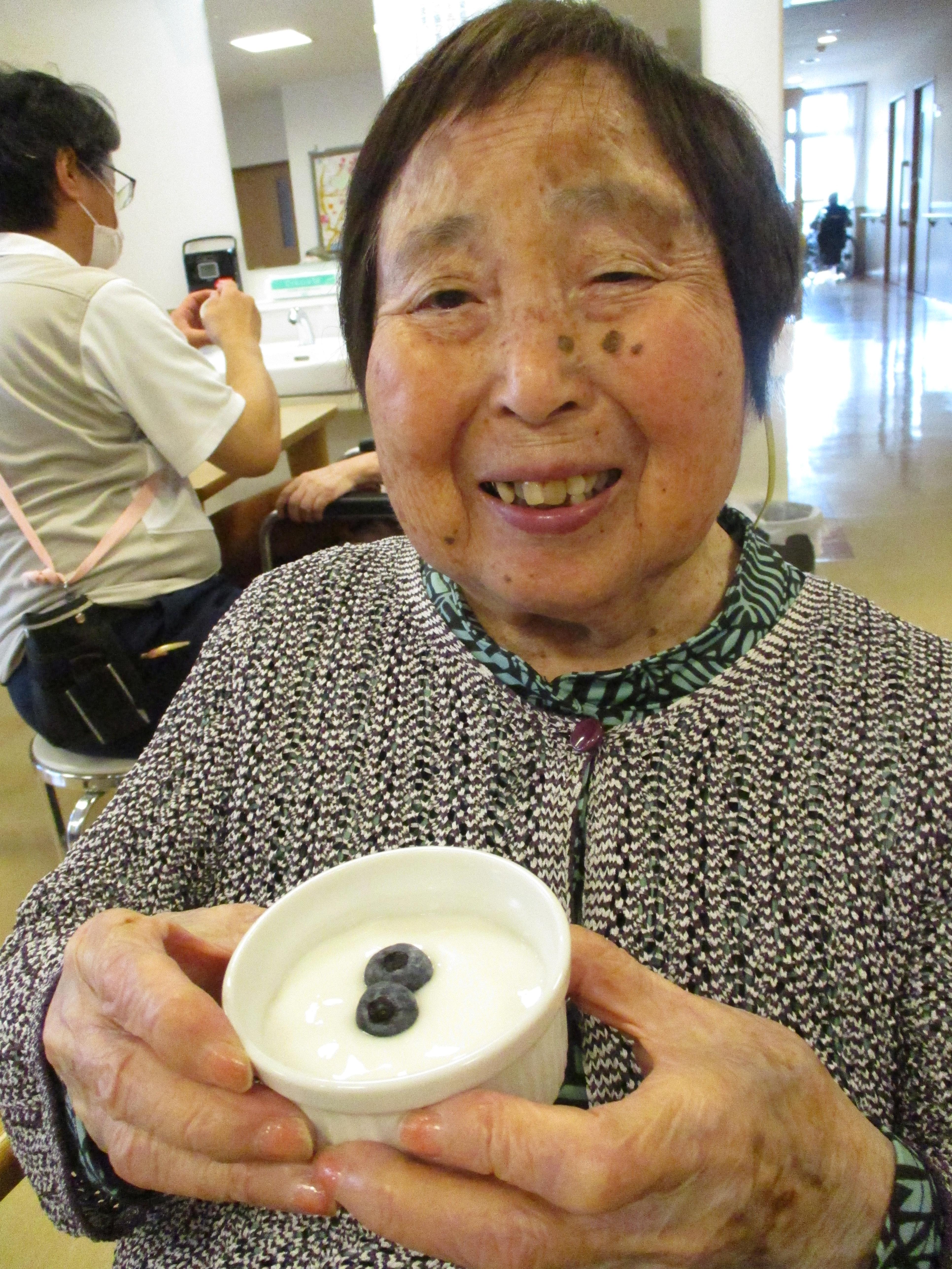 一品目は、フルーチェのトッピングとして、ブルーベリーを添えて召し上がっていただきました。