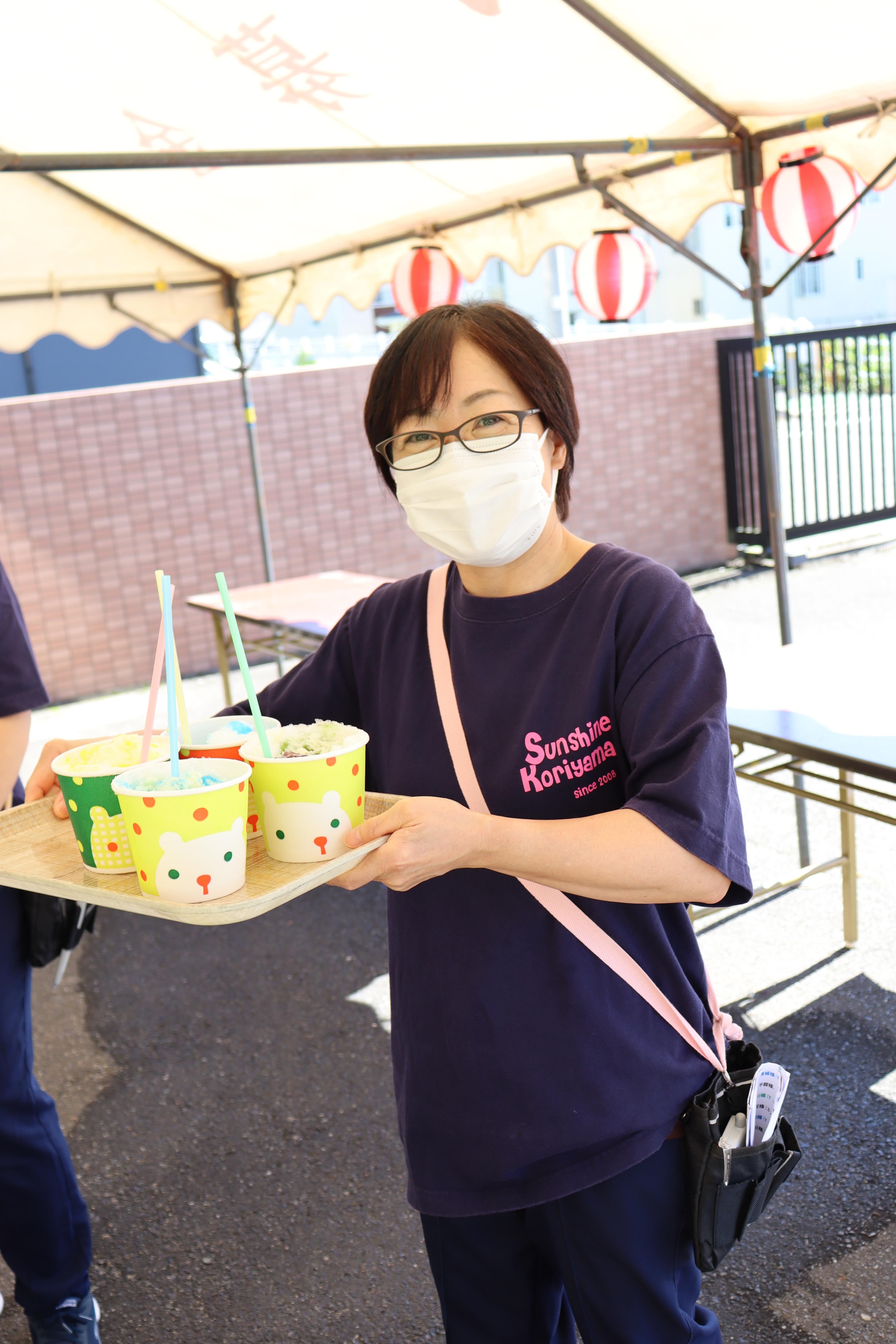 昼食は串焼きや焼きそば、フランクフルトに豚汁、デザートはかき氷もあり、外の風を感じながら召し上がっていただきました!気温も上がってきたので、食堂でも召し上がっていただきました。皆様、「お腹いっぱい」と満足されていました。