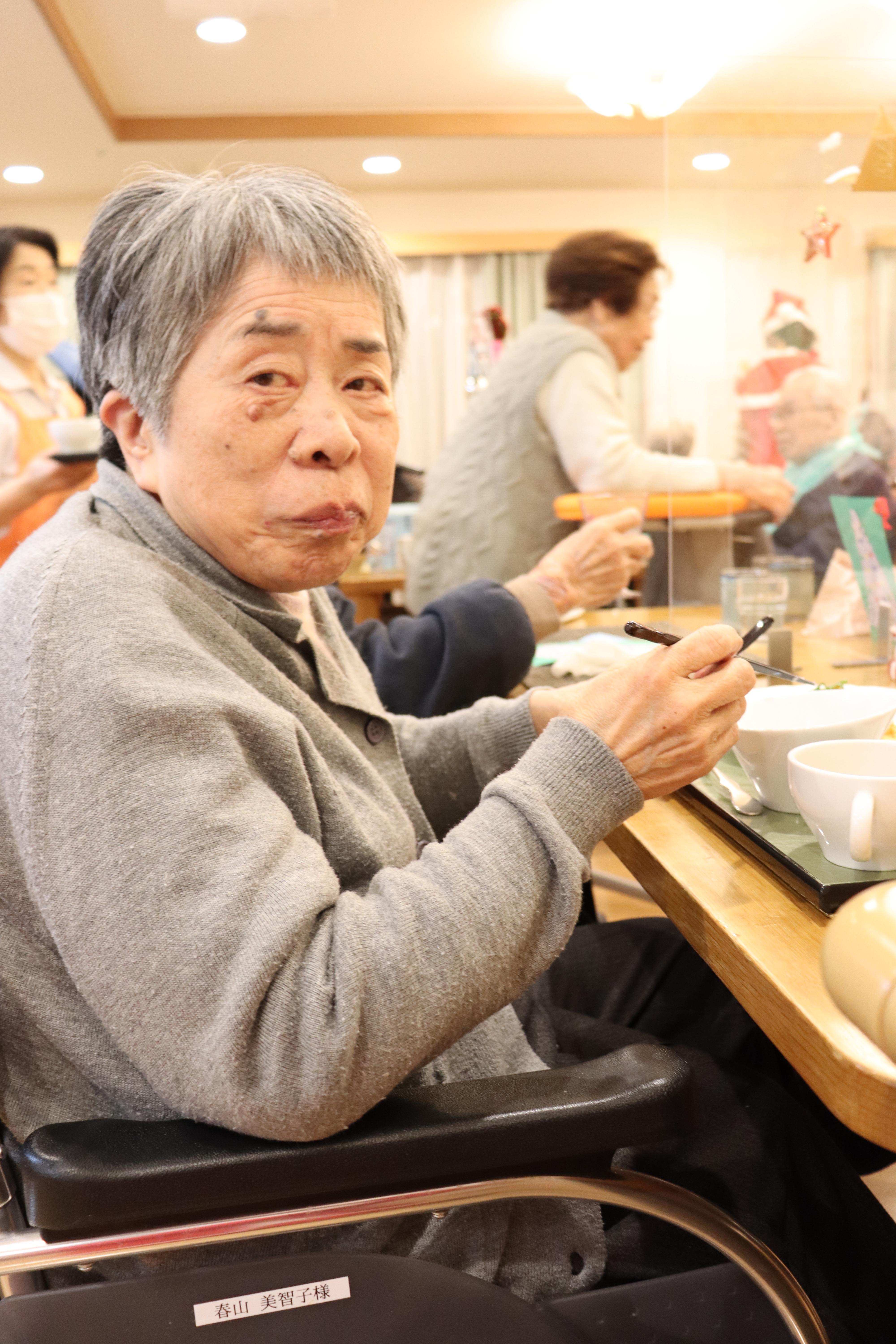 クリスマスディナーを召し上がっていただきました。メニューは、カニのトマトクリームスパゲティ・クリスマスチキン・手作りパン(くるみとクリームチーズ)・冬野菜のコンソメスープ・5種類のホットサラダ・フルーツカクテルでした!クリスマスチキンは柔らかく、手作りパンは出来立てで美味しかったです!