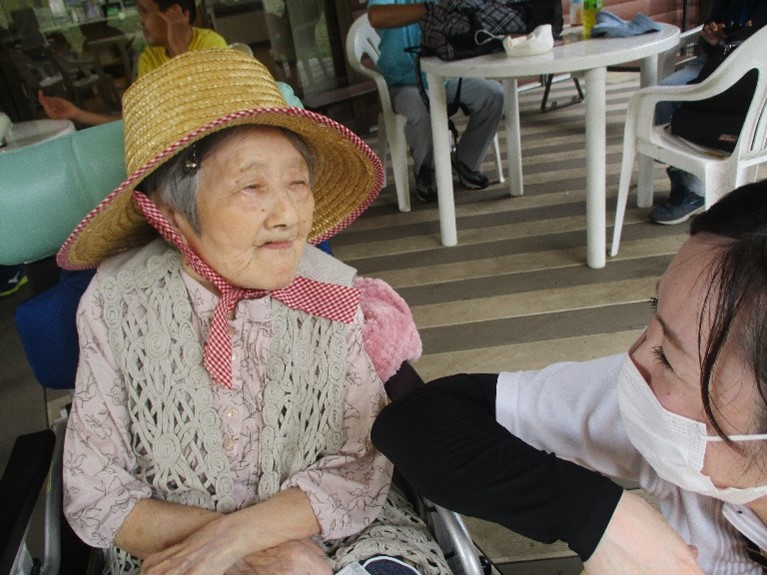 いざ出発すると、突然の雷、雨にうたれ、これはドライブに変更かと思いきや、5分と経たないうちに雨も止み、車から降りる事ができました。夏の天気とセミの声をしっかり感じ取り、自然と触れ合って参りました。風が吹くと「気持ちがいい。」や、行き交う子供達をみて、「かわいい。」などという言葉も聞かれ、お客様の表情にも楽し気な変化がみられました。