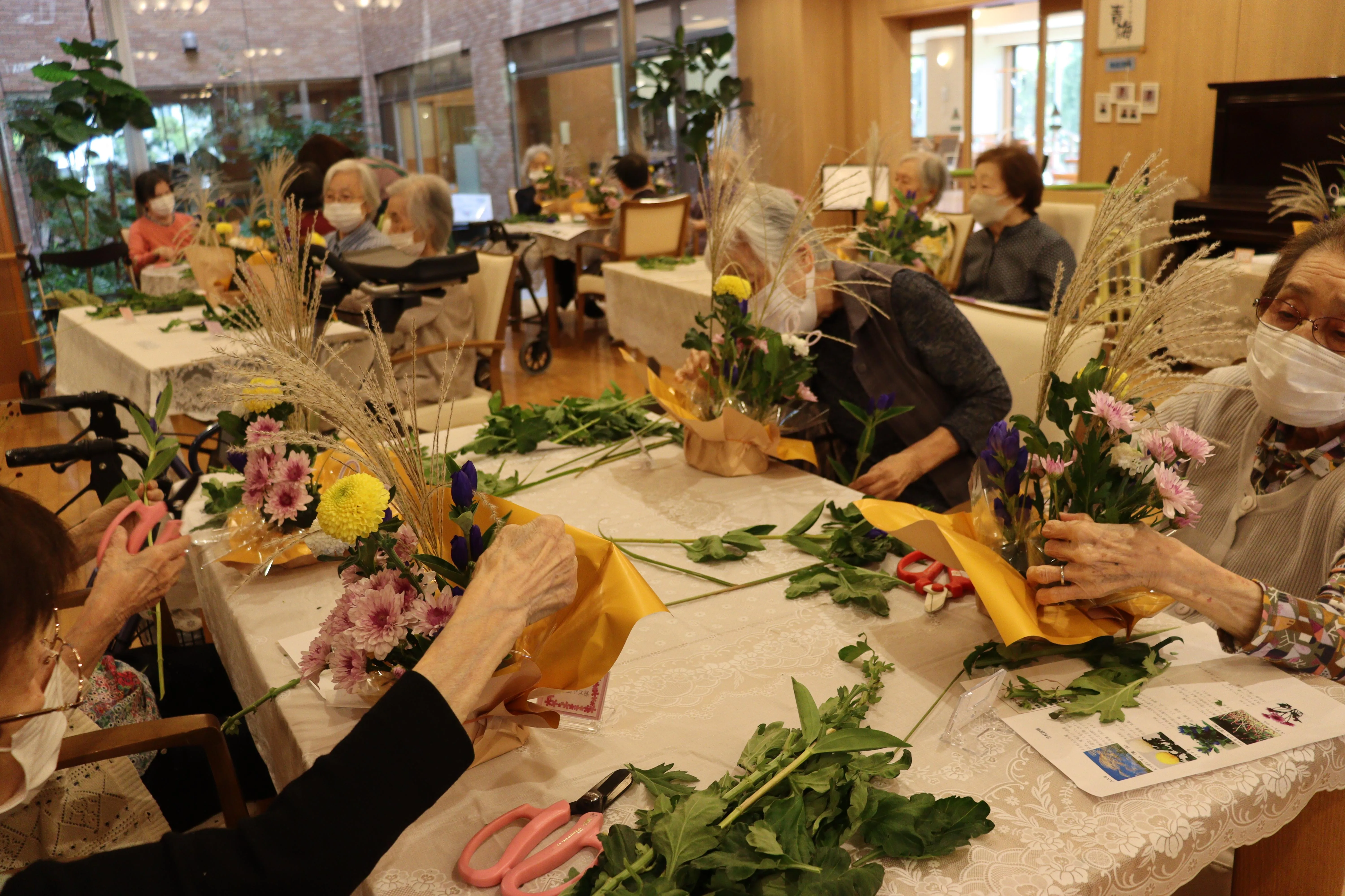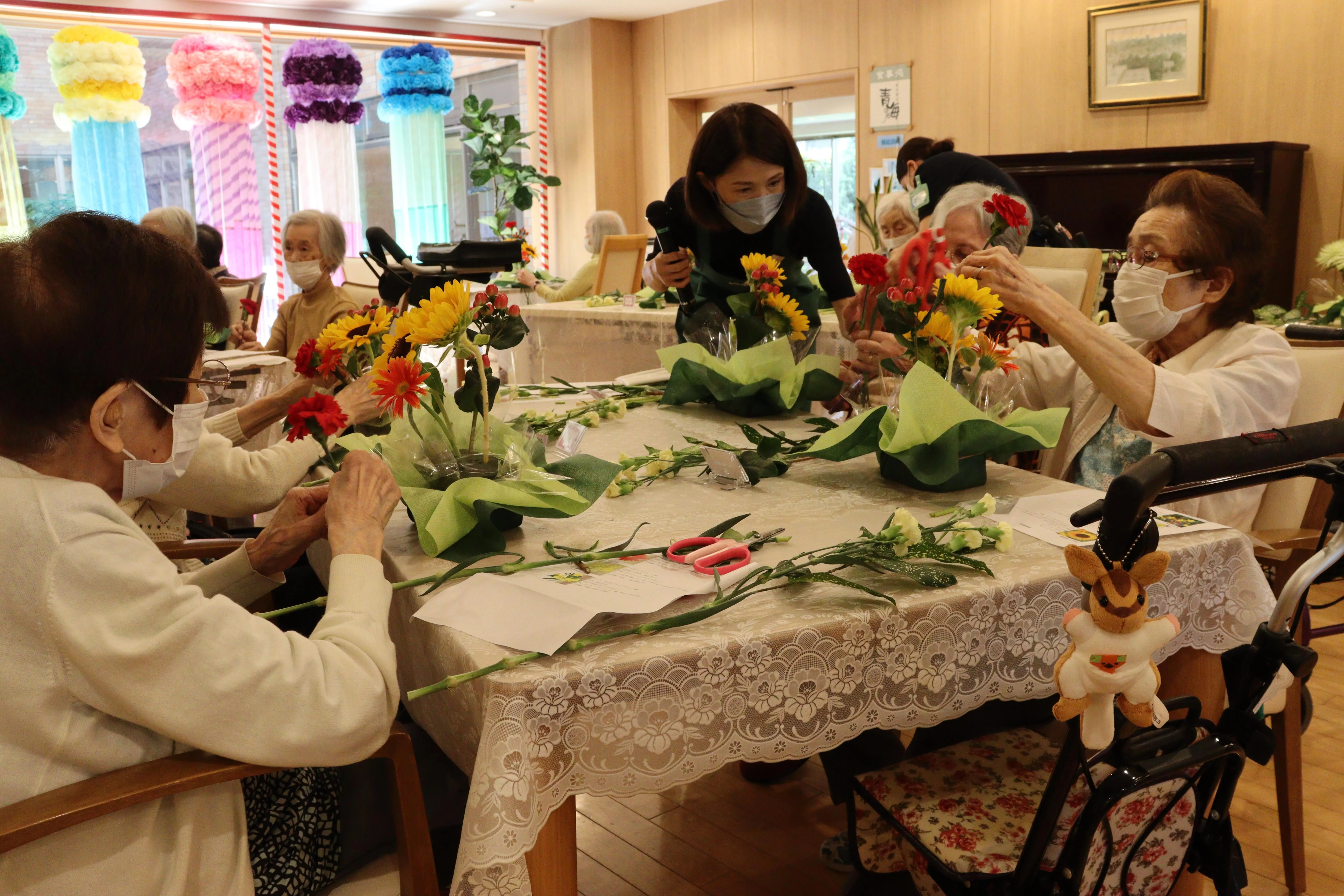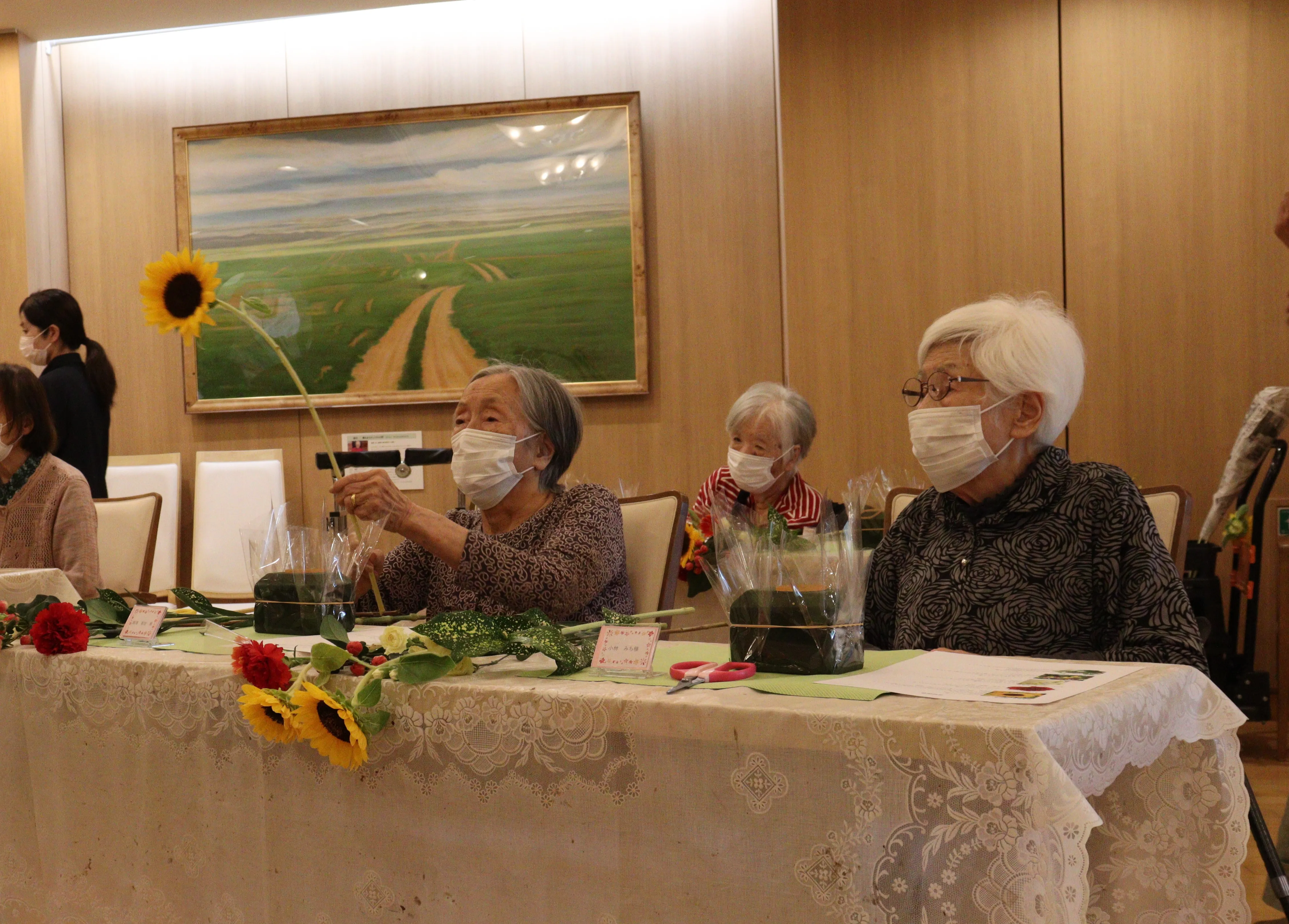 ツクイ・サンシャイン町田東館では講師の方をお招きし、フラワーアレンジメントの教室を開催しております。毎月季節感のある花材を用いて作成し、沢山のお客様にご参加いただいている人気のお教室でもあります。同じ花材を使っているのに、出来上がりはそれぞれ個性あふれる作品に仕上がるのも不思議です。