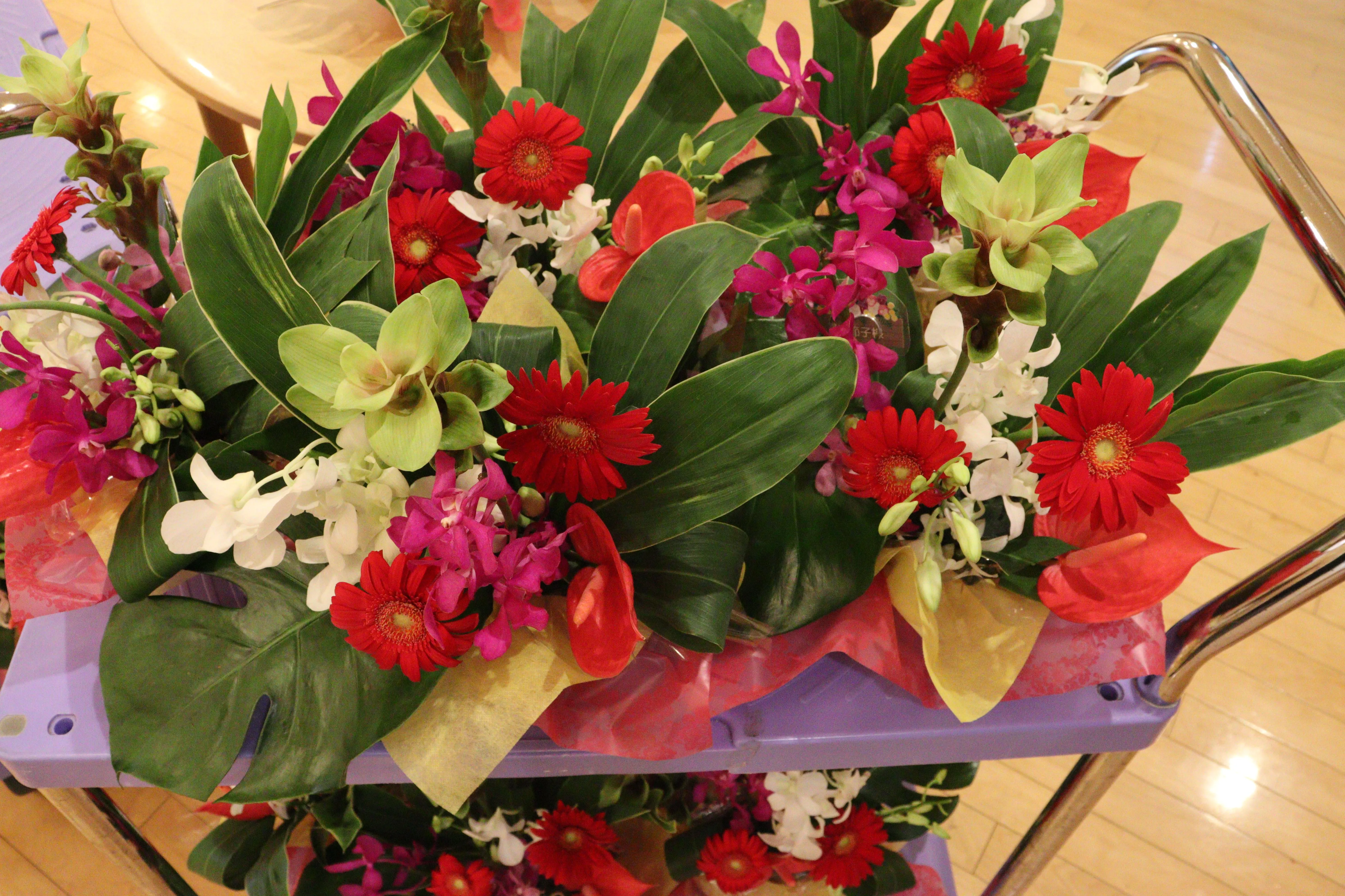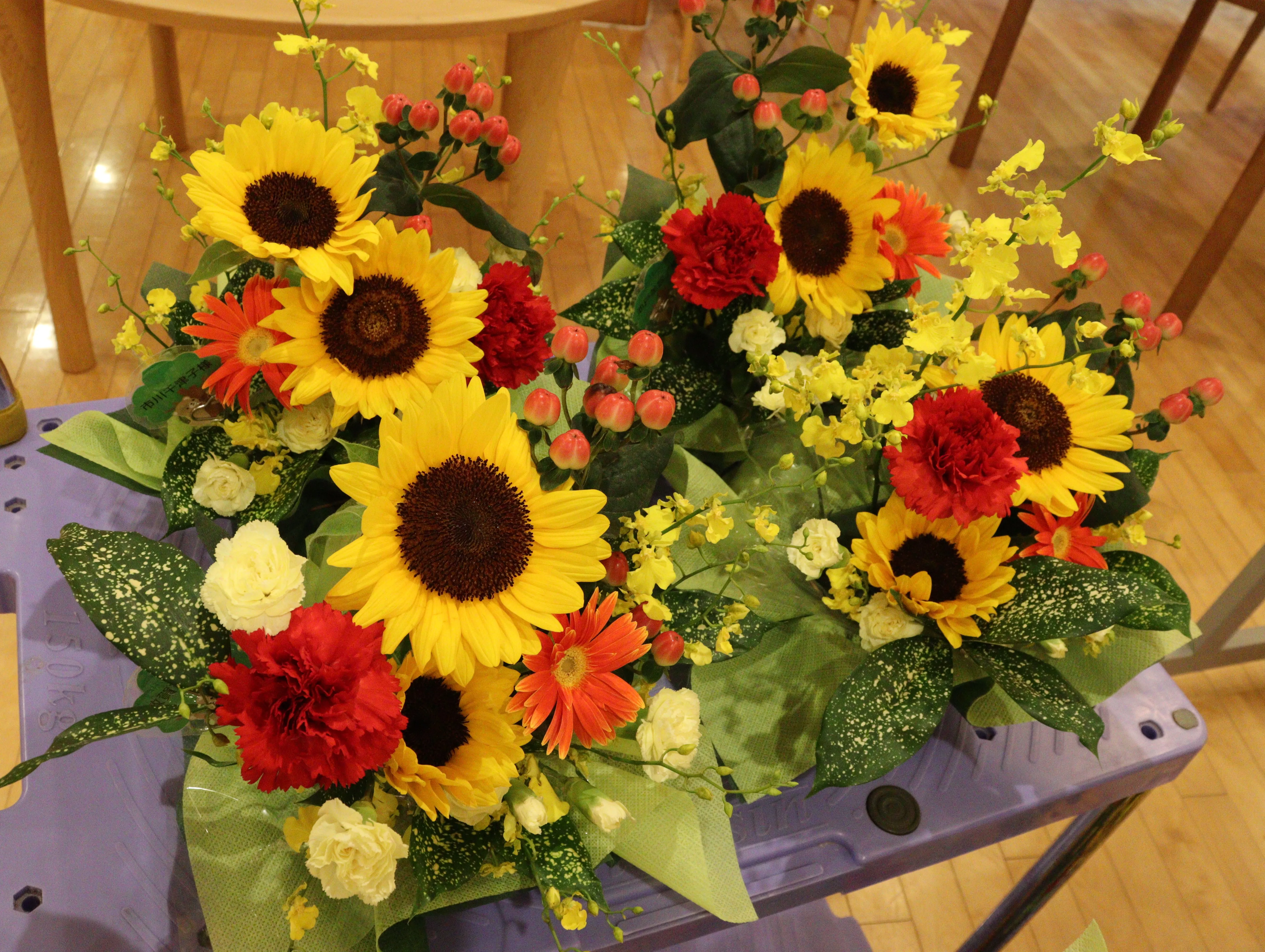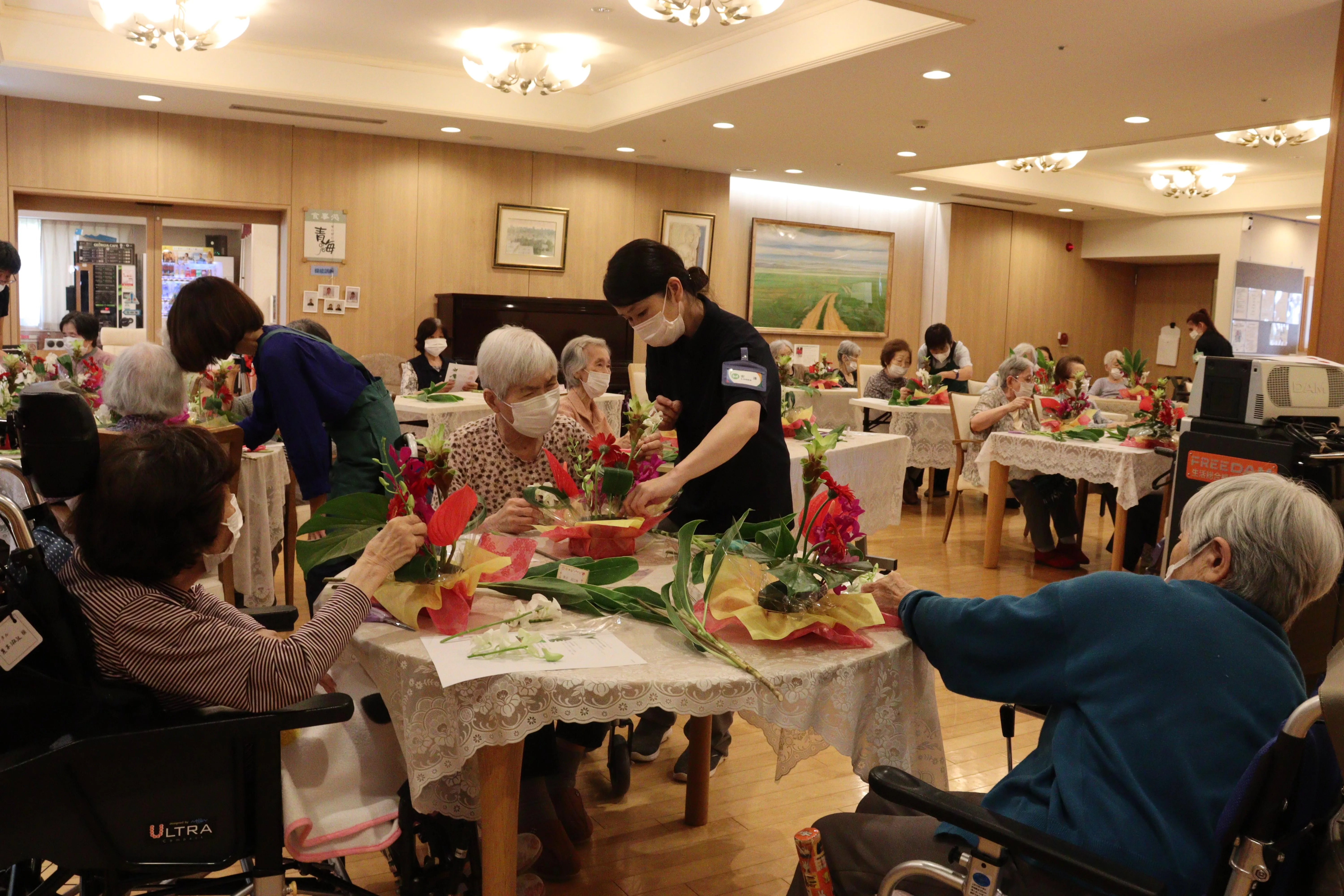 ツクイ・サンシャイン町田東館では講師の方をお招きし、フラワーアレンジメントの教室を開催しております。毎月季節感のある花材を用いて作成し、沢山のお客様にご参加いただいている人気のお教室でもあります。同じ花材を使っているのに、出来上がりはそれぞれ個性あふれる作品に仕上がるのも不思議です。