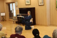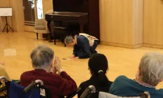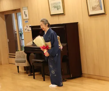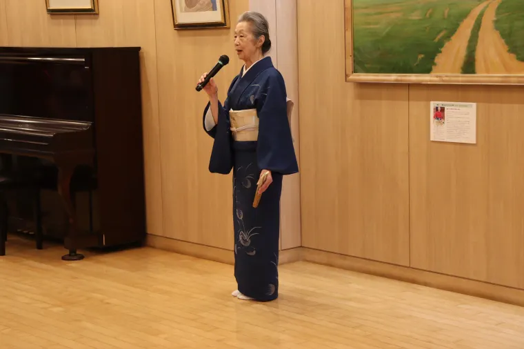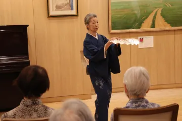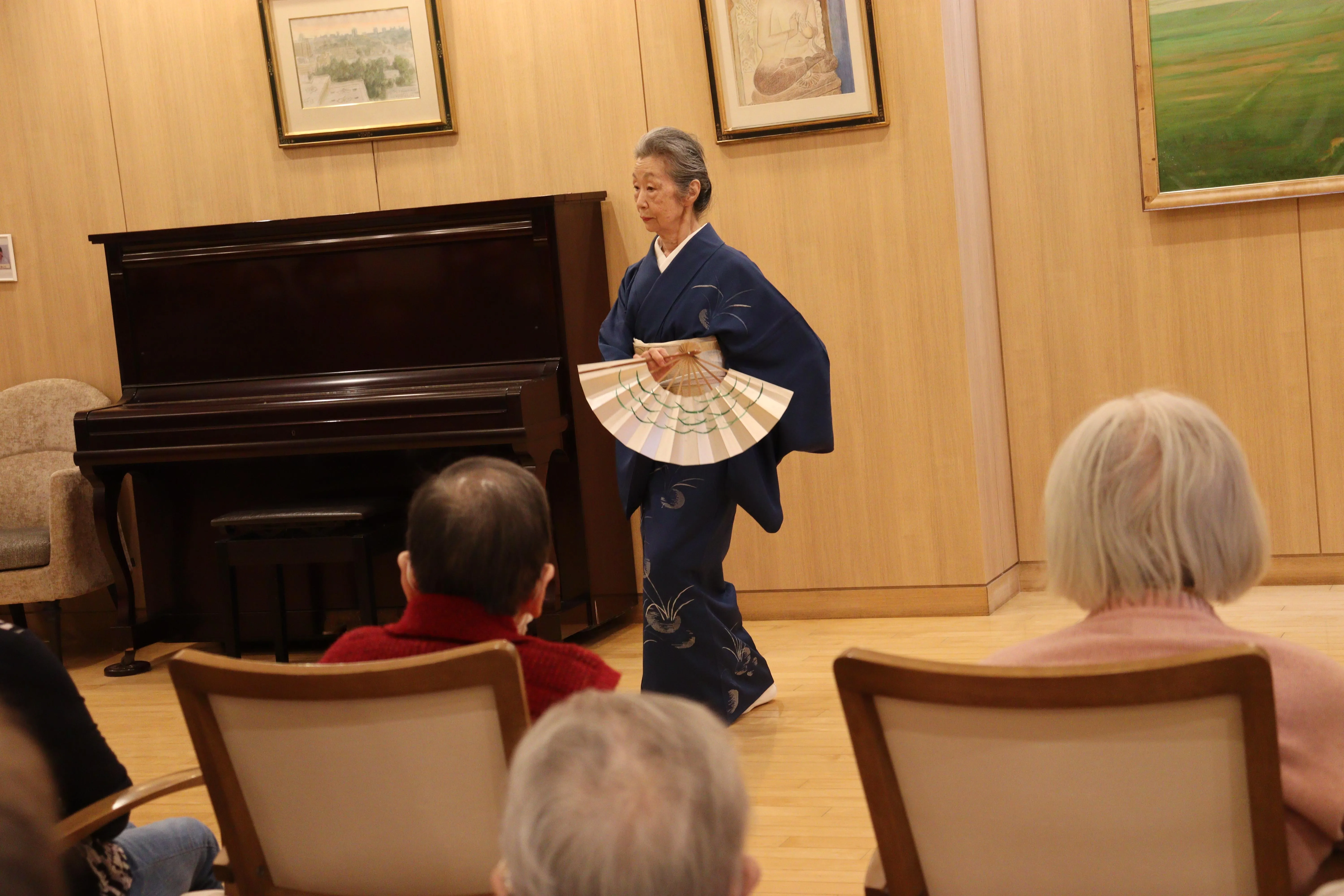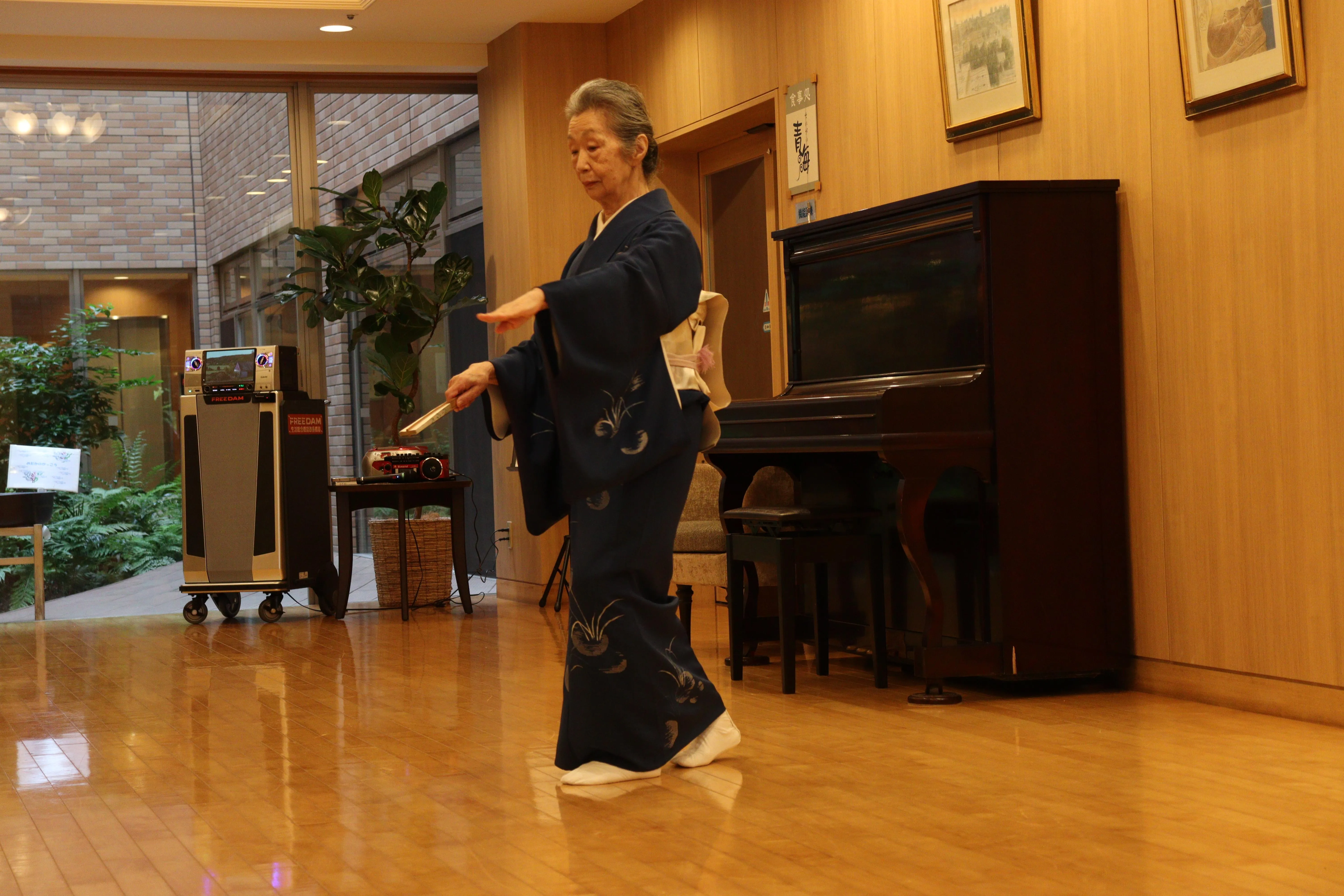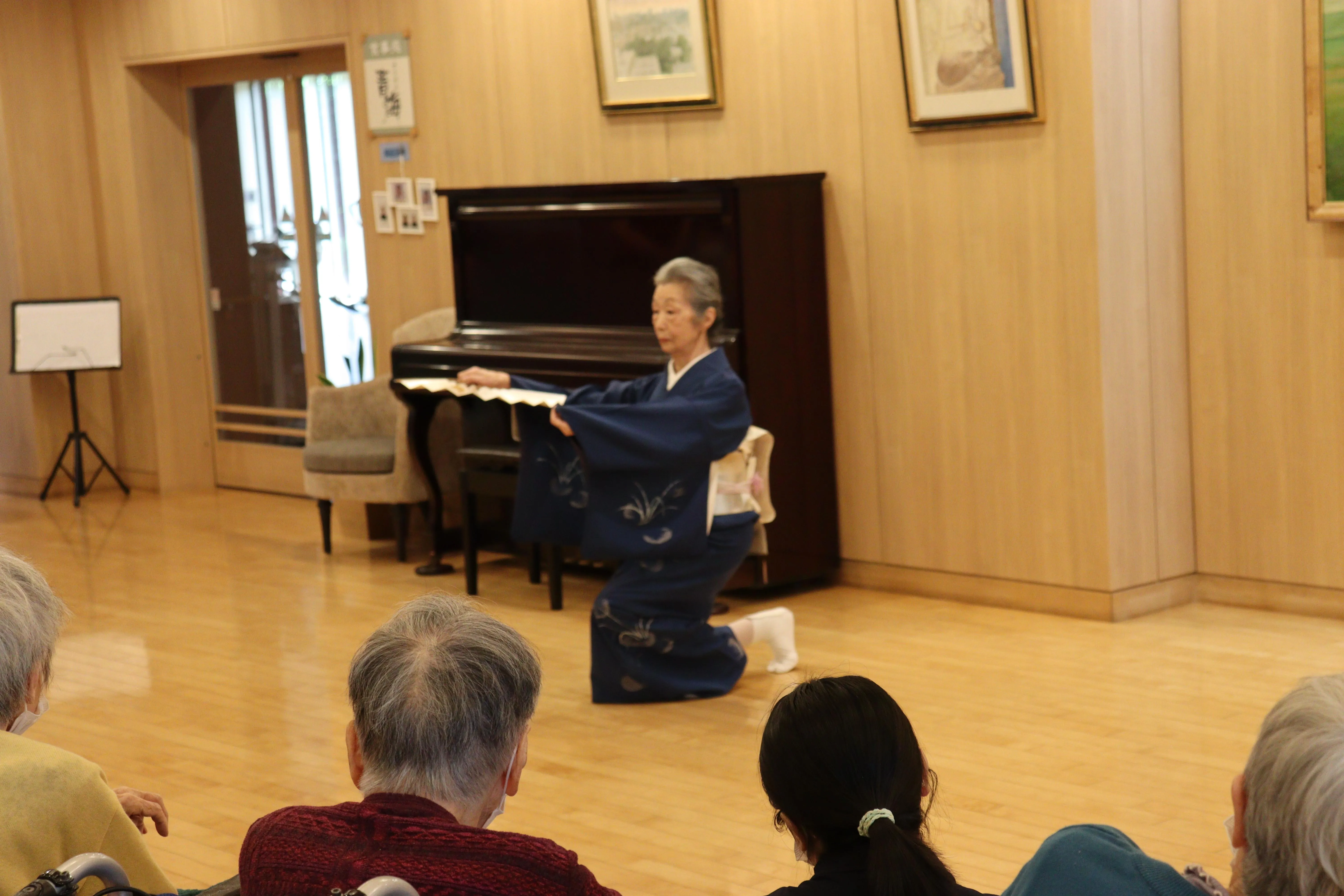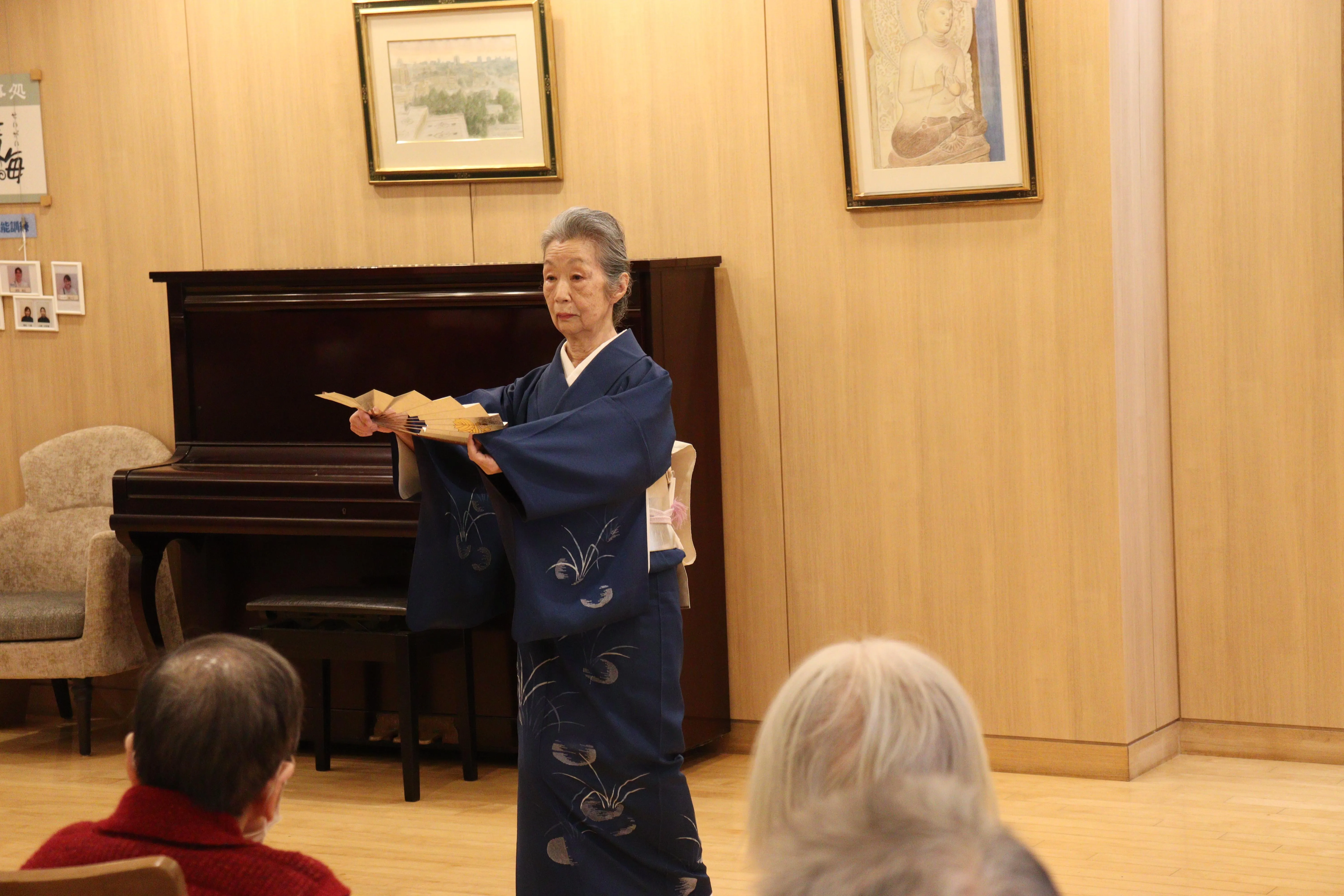 上方舞は地唄を伴い舞われる日本舞踊のひとつで、旋回を中心にした優雅でゆったりとした動き、細やかな表現で繊細な心理描写を特徴とした舞とのこと。「鶴の声」「高砂」の2曲を披露して頂きました。先生は始まる前、「このような施設で踊るのは初めてで緊張している」とのお話しをされていました。お客様からは終演後、「指先の動きが美しい」「お着物の着方が素晴らしい」などなど、たくさんのお言葉を頂きました。吉村先生、本当にありがとうございました!!
