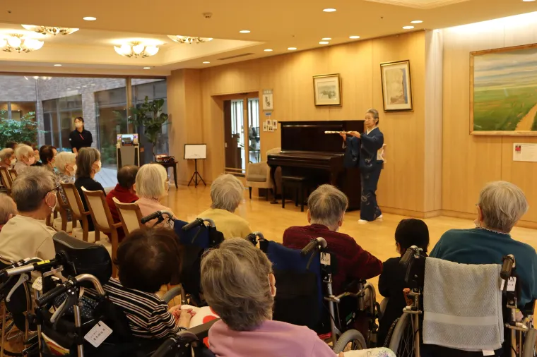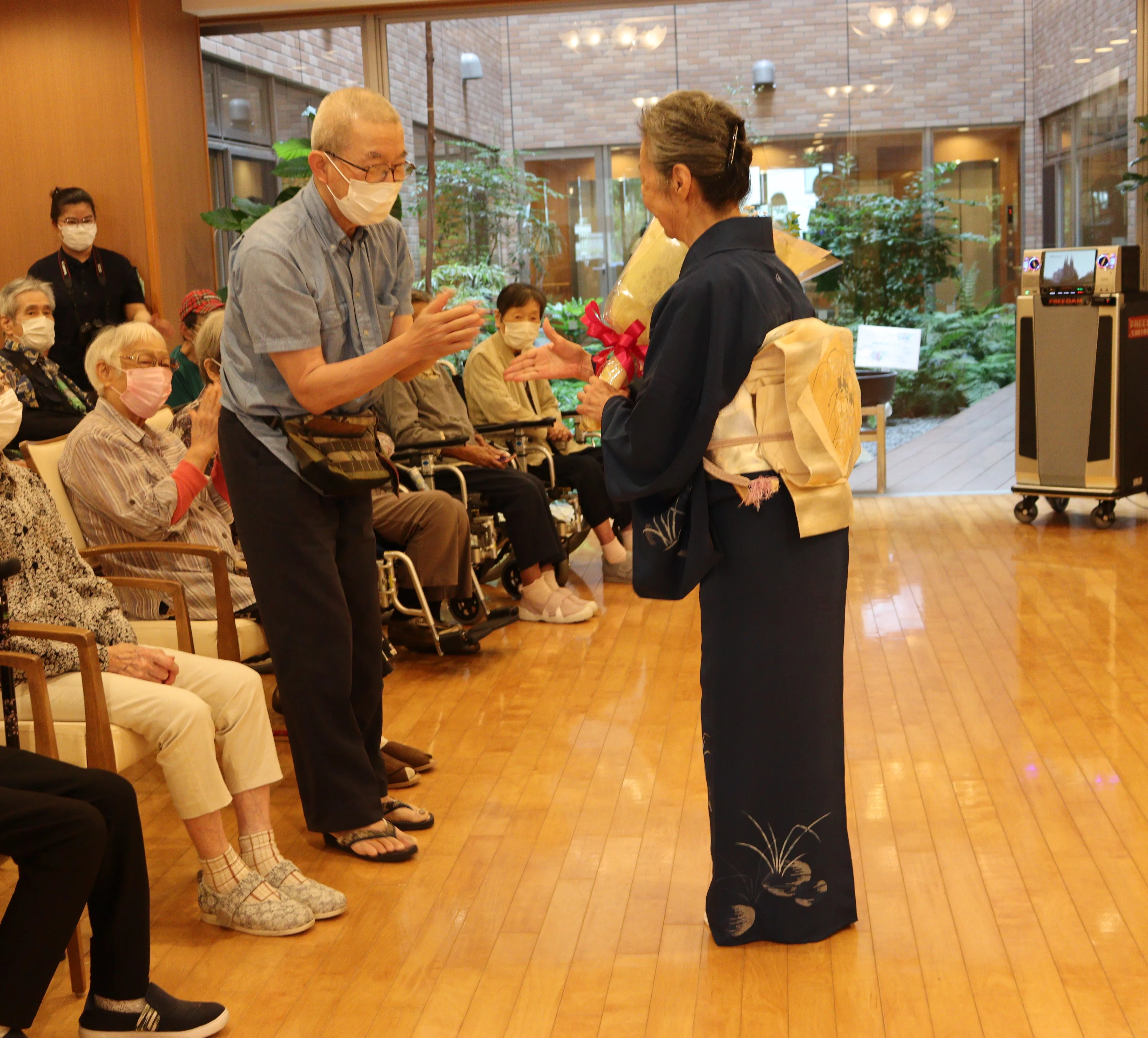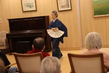 本日のイベントは伝統芸能のひとつ、日本舞踊です。入居されているお客様のご家族のご紹介なのですが、息子様より「母に見せたいがせっかくなので施設の皆様にもどうでしょう」とのご厚意により実現いたしました。本格的な日本舞踊を当施設で行うのは初の試みです。お客様からは「楽しみにしているわ」とのお声掛けをたくさん頂戴しておりました。