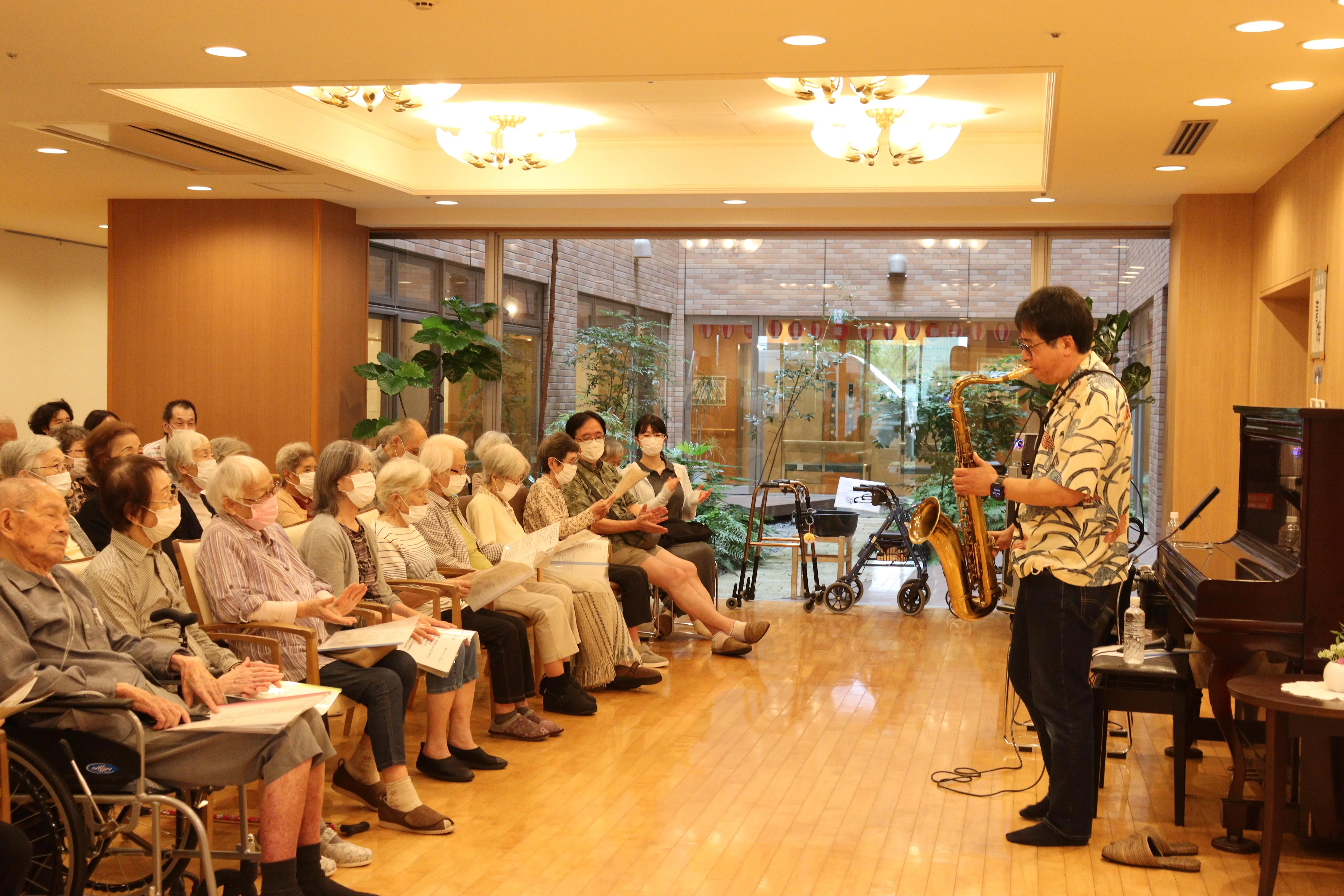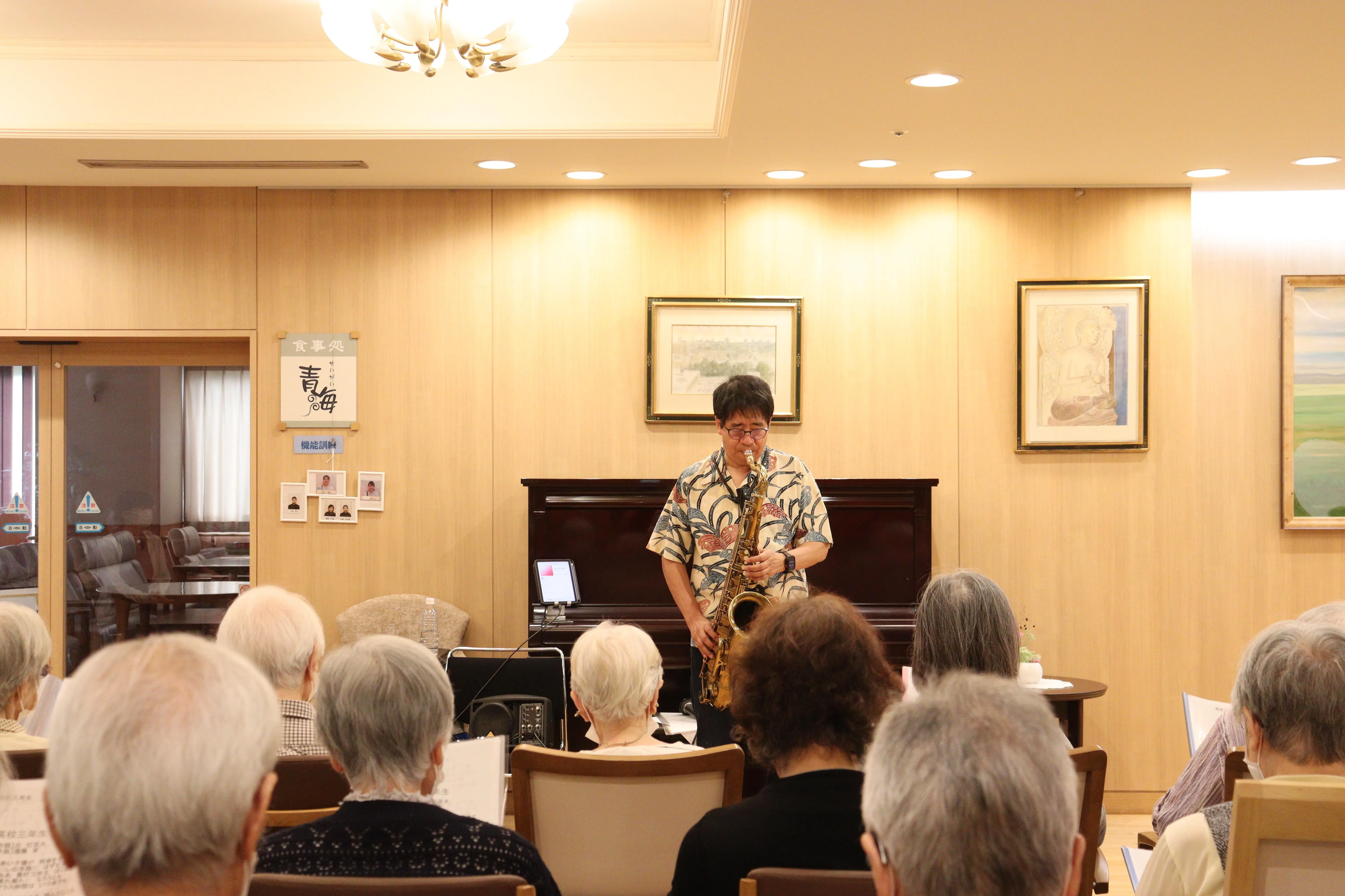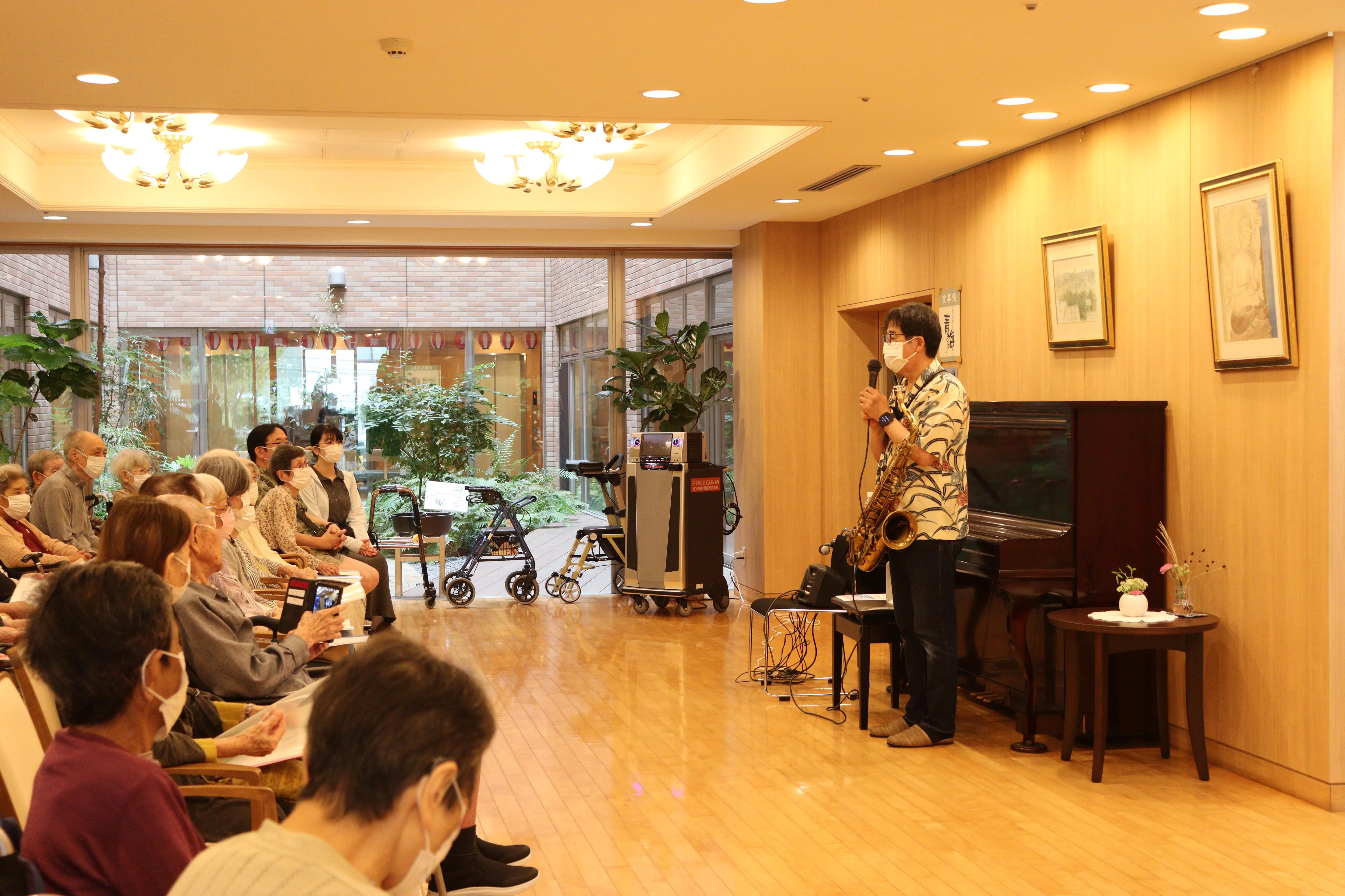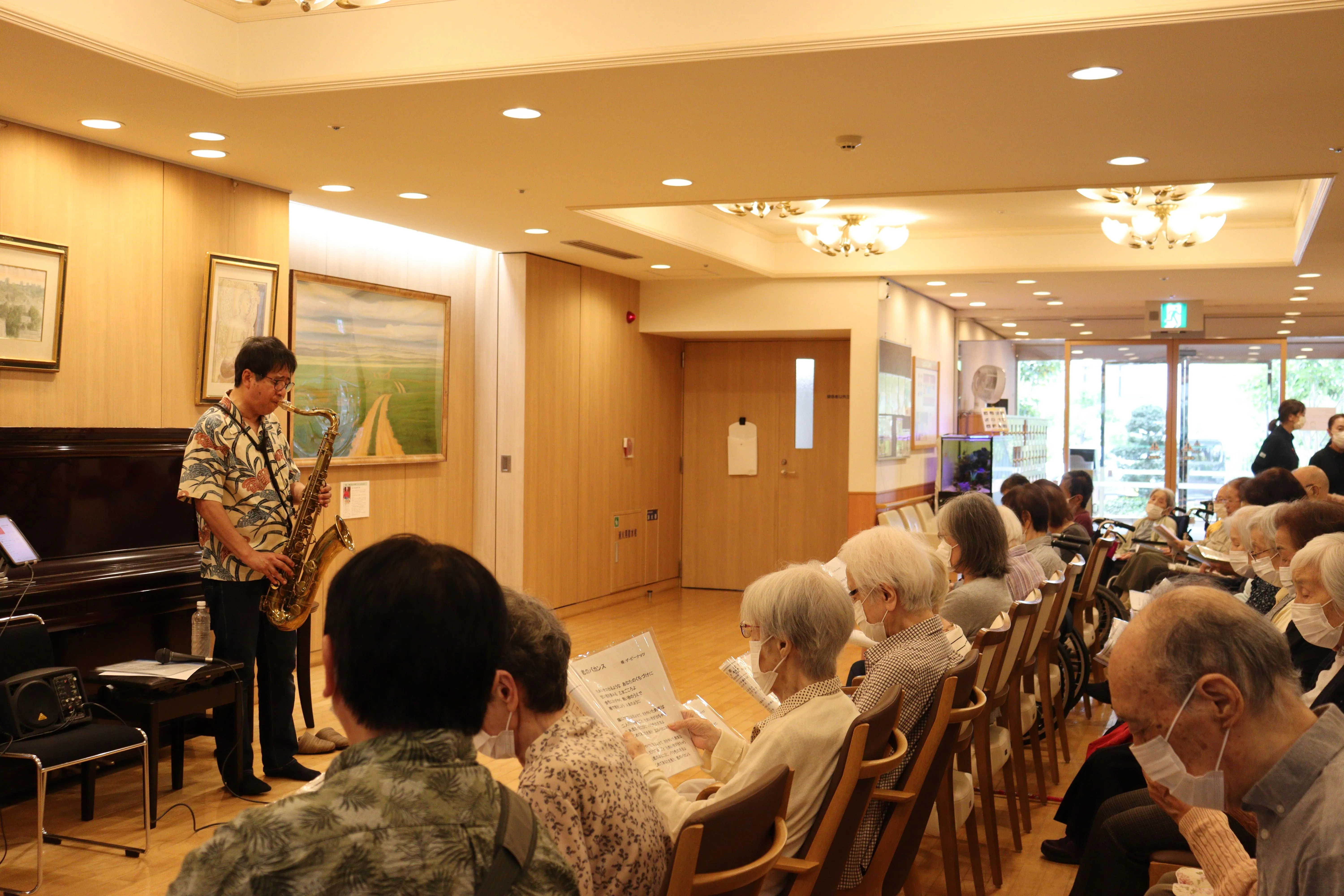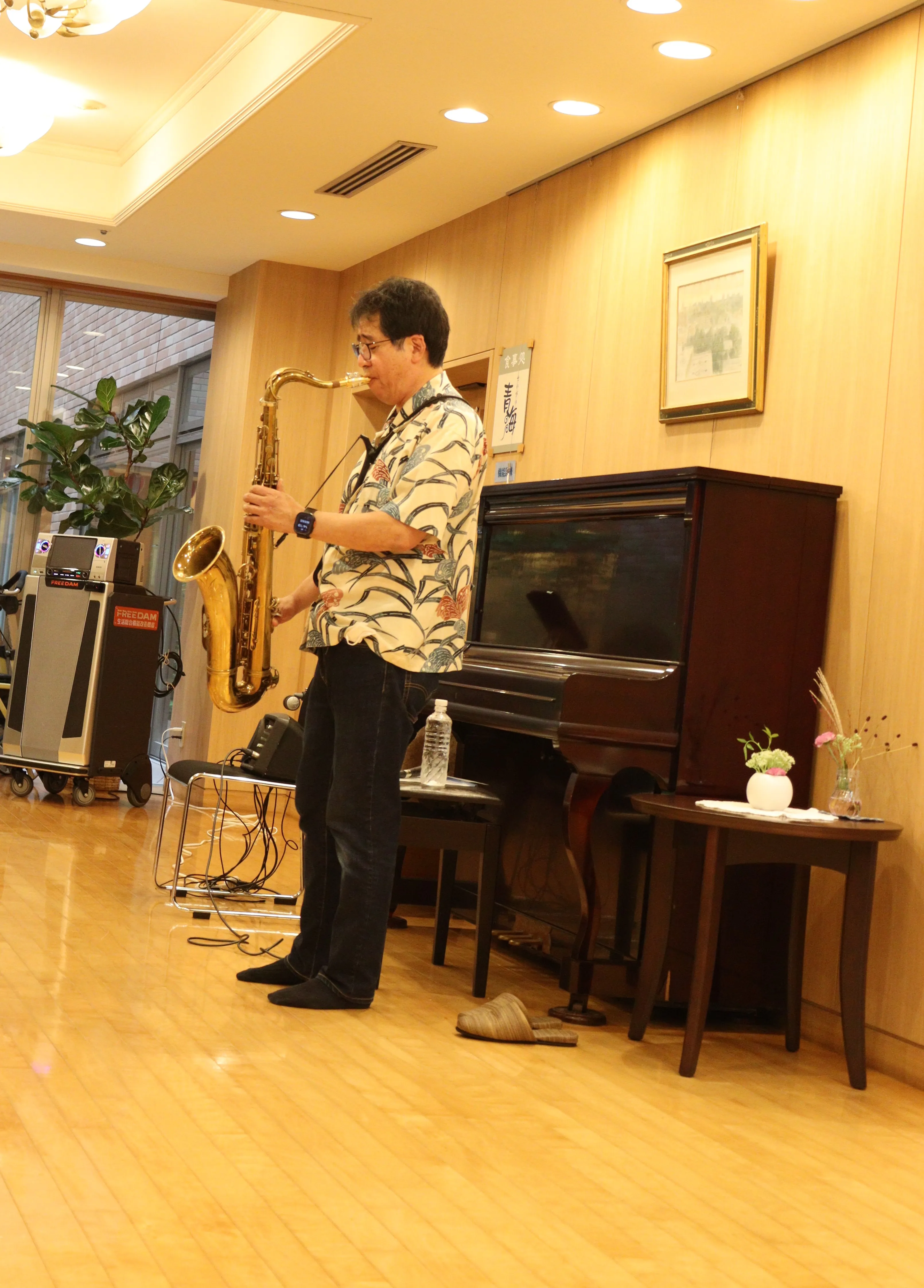 厳しい暑さもようやく落ち着いた10月日曜の昼下がり、サックス演奏のコンサートを開催いたしました。以前にも東館にて演奏して頂いたおなじみの先生です。軽快なトークでお客様を楽しませつつ、「高原列車は行く」、「東京のバスガール」など昭和歌謡を次々に披露して頂きました。皆様大合唱で、最後は松任谷由実さんの曲で締めていただきました。