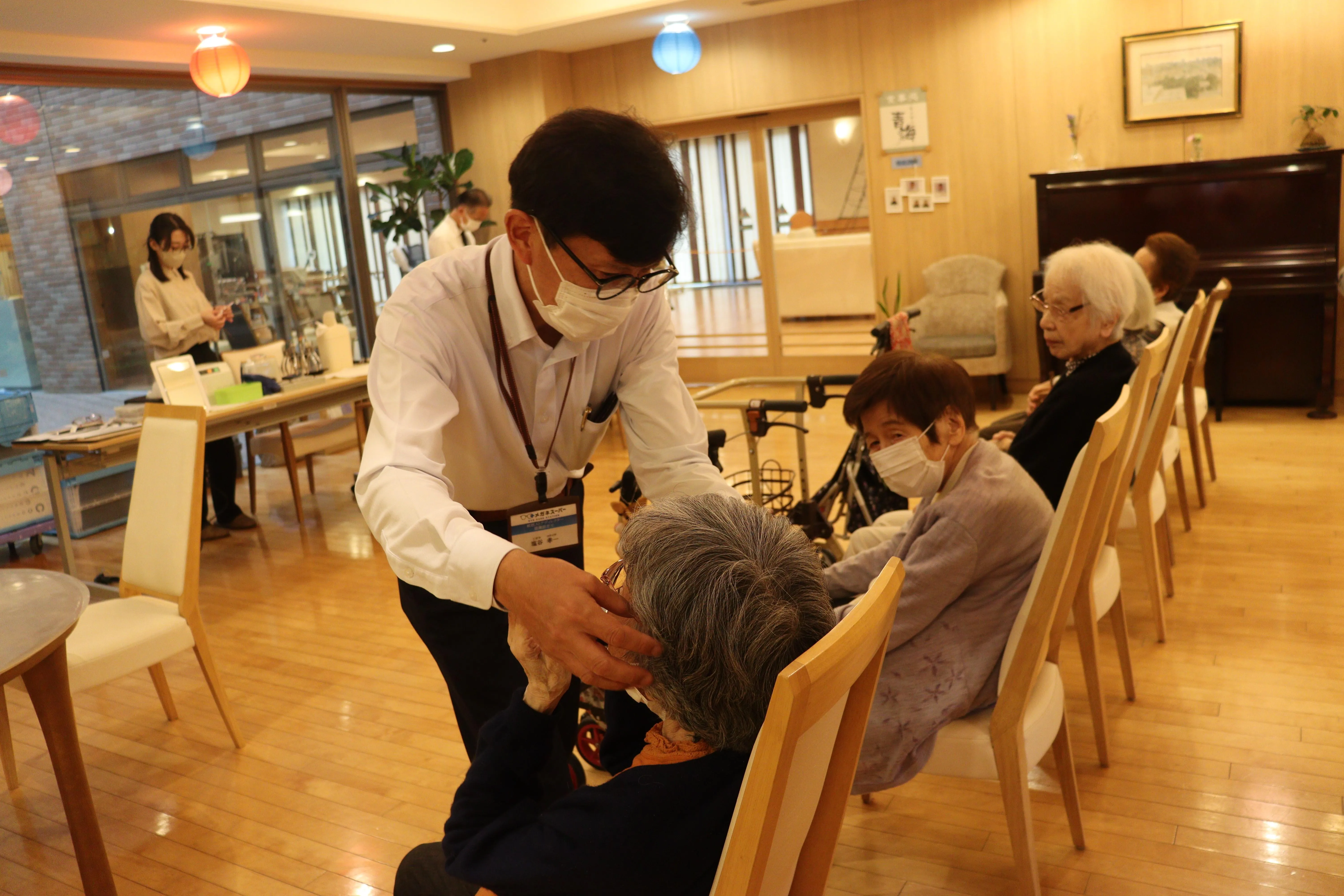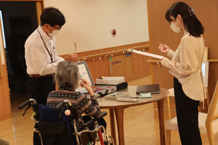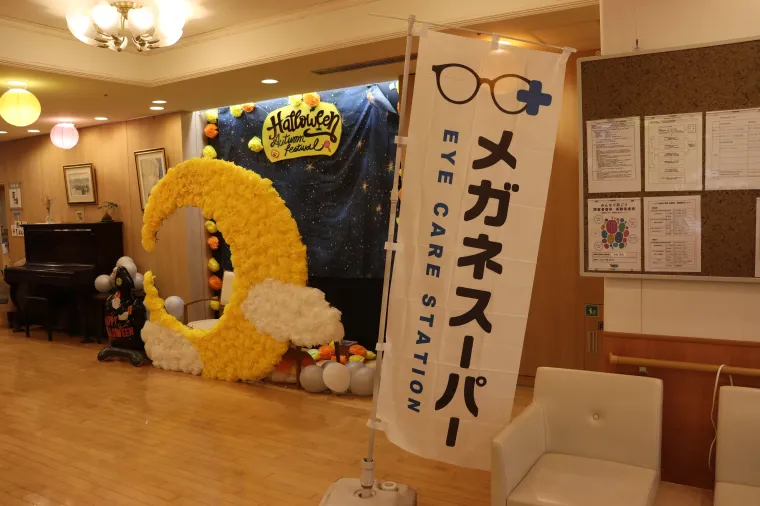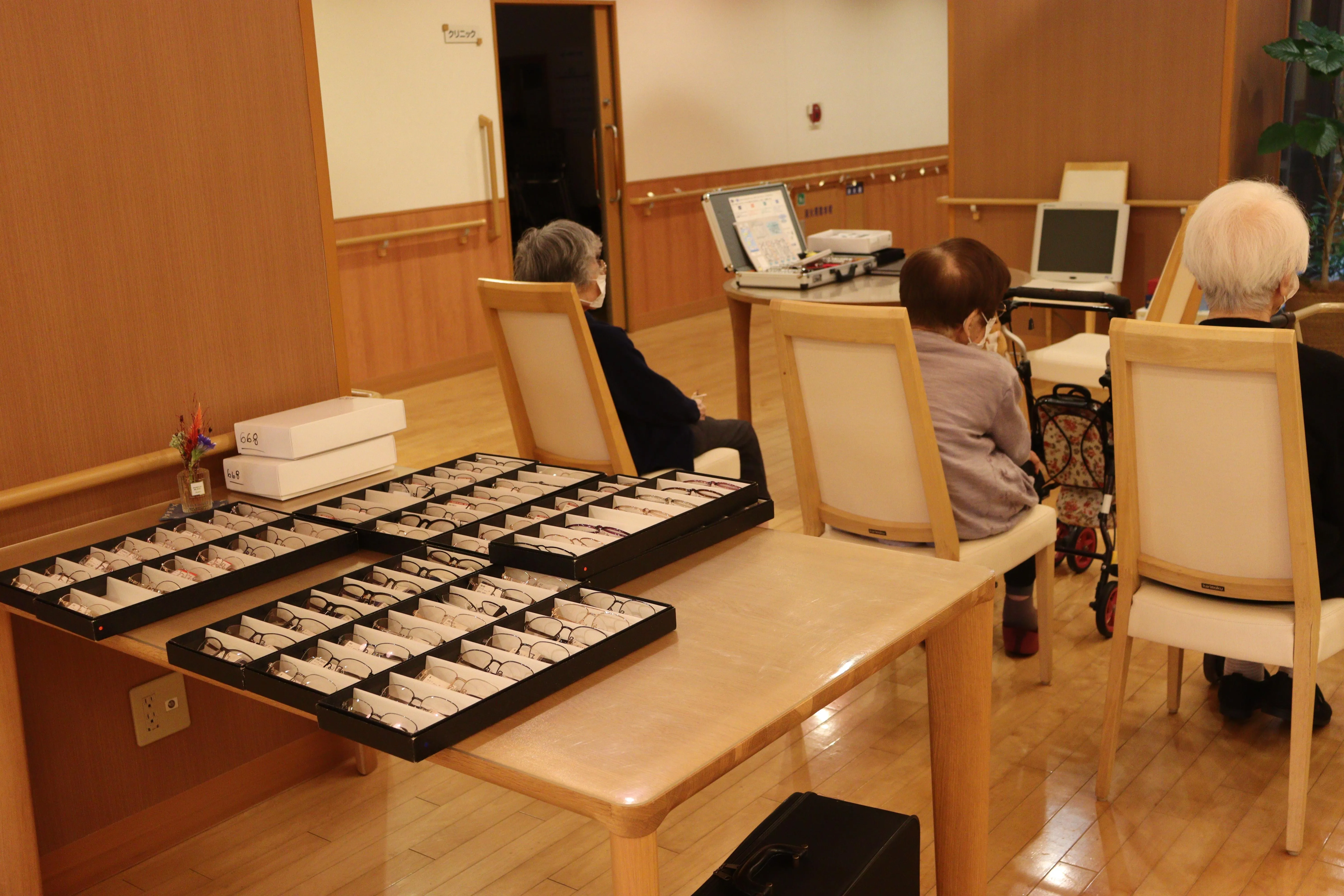ツクイ・サンシャイン町田東館では毎月眼科の往診がございますが、目のご病気ではなく日頃のメガネの見え方の相談などちょっとした心配事を聞いて頂ける機会として年に数回程「メガネスーパー」さんがいらしています。ここではメガネの購入はもちろん、メガネのクリーニングやねじの調整なども無料で行って頂けるんです。補聴器のお掃除や聴こえの相談にものって下さいます。