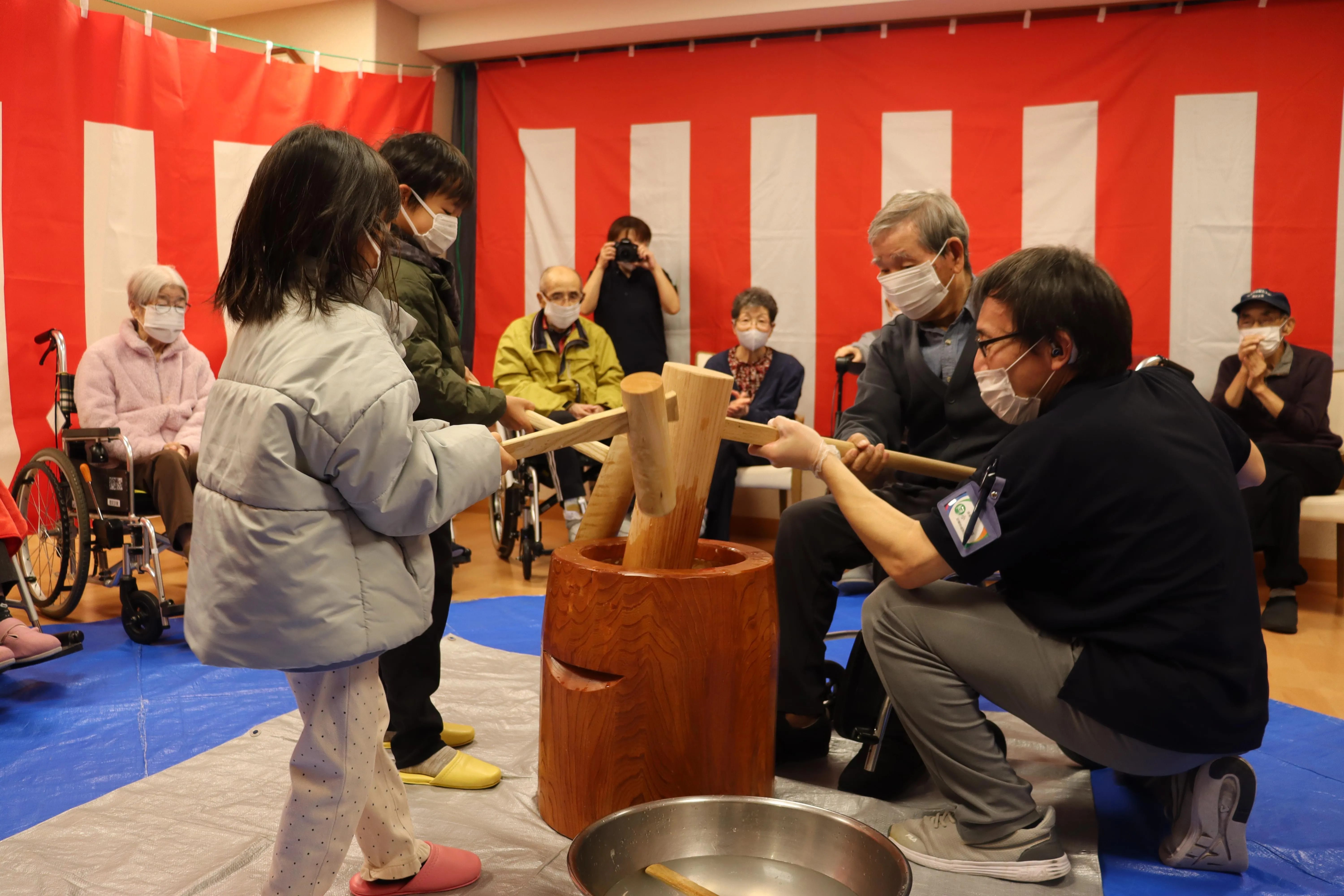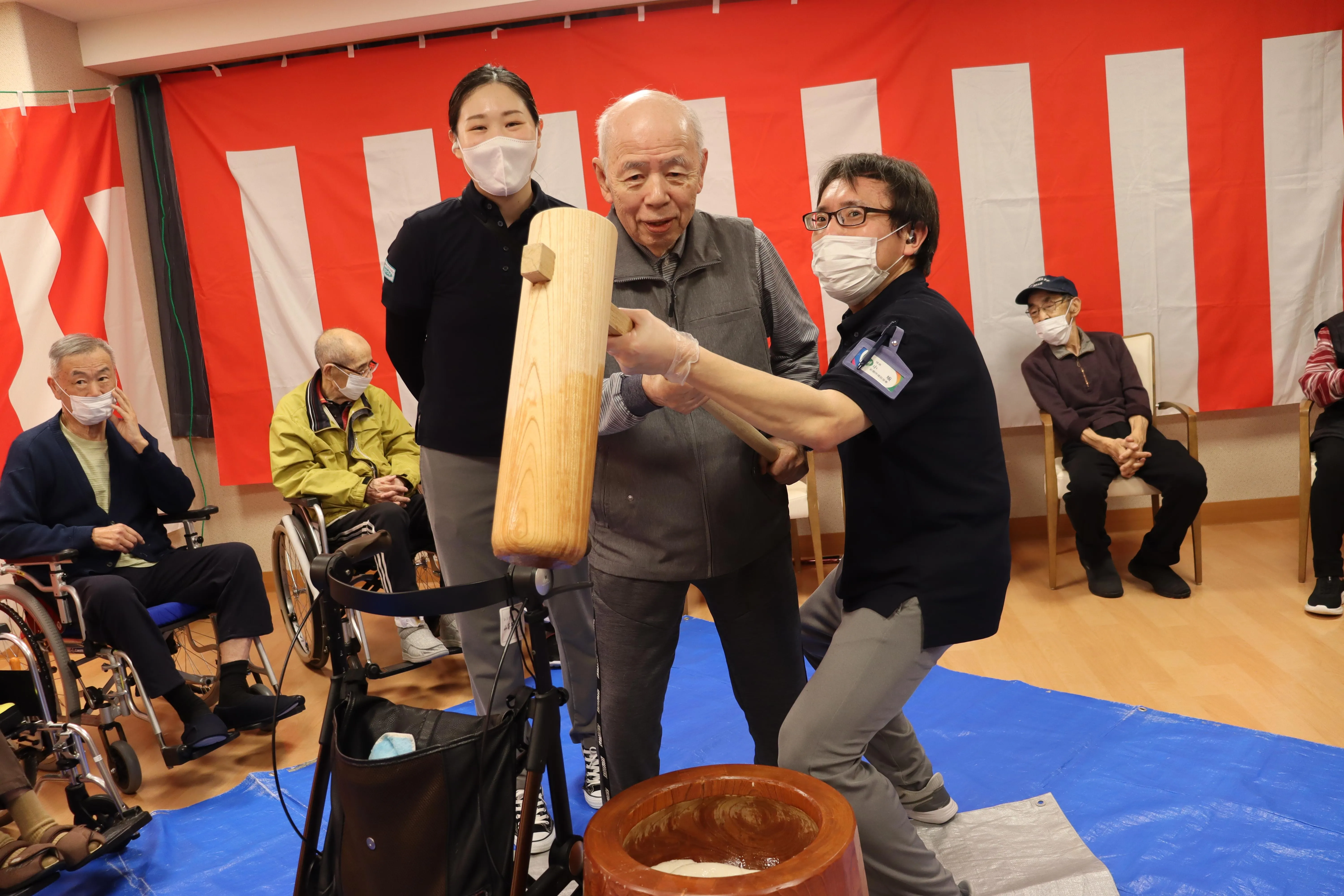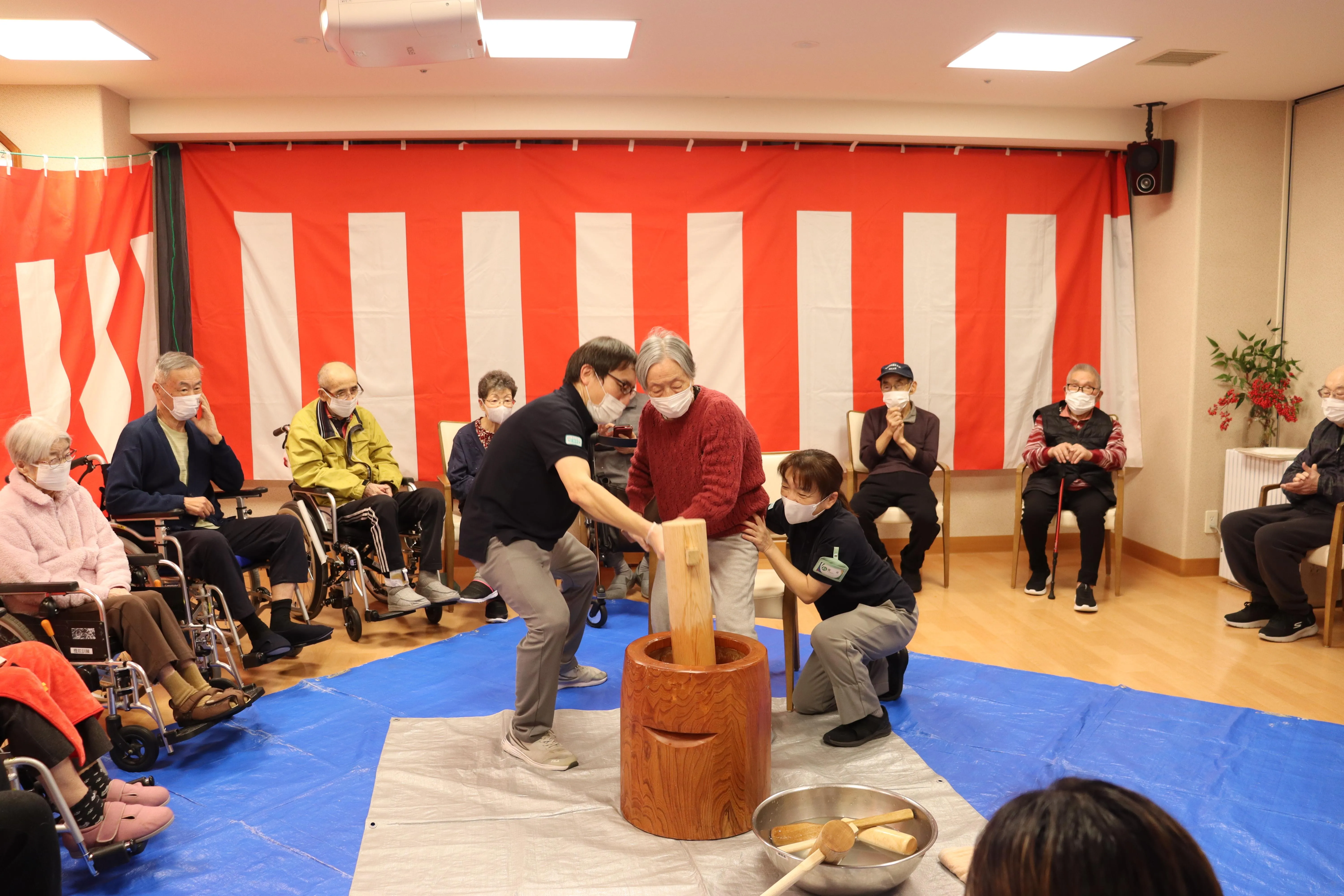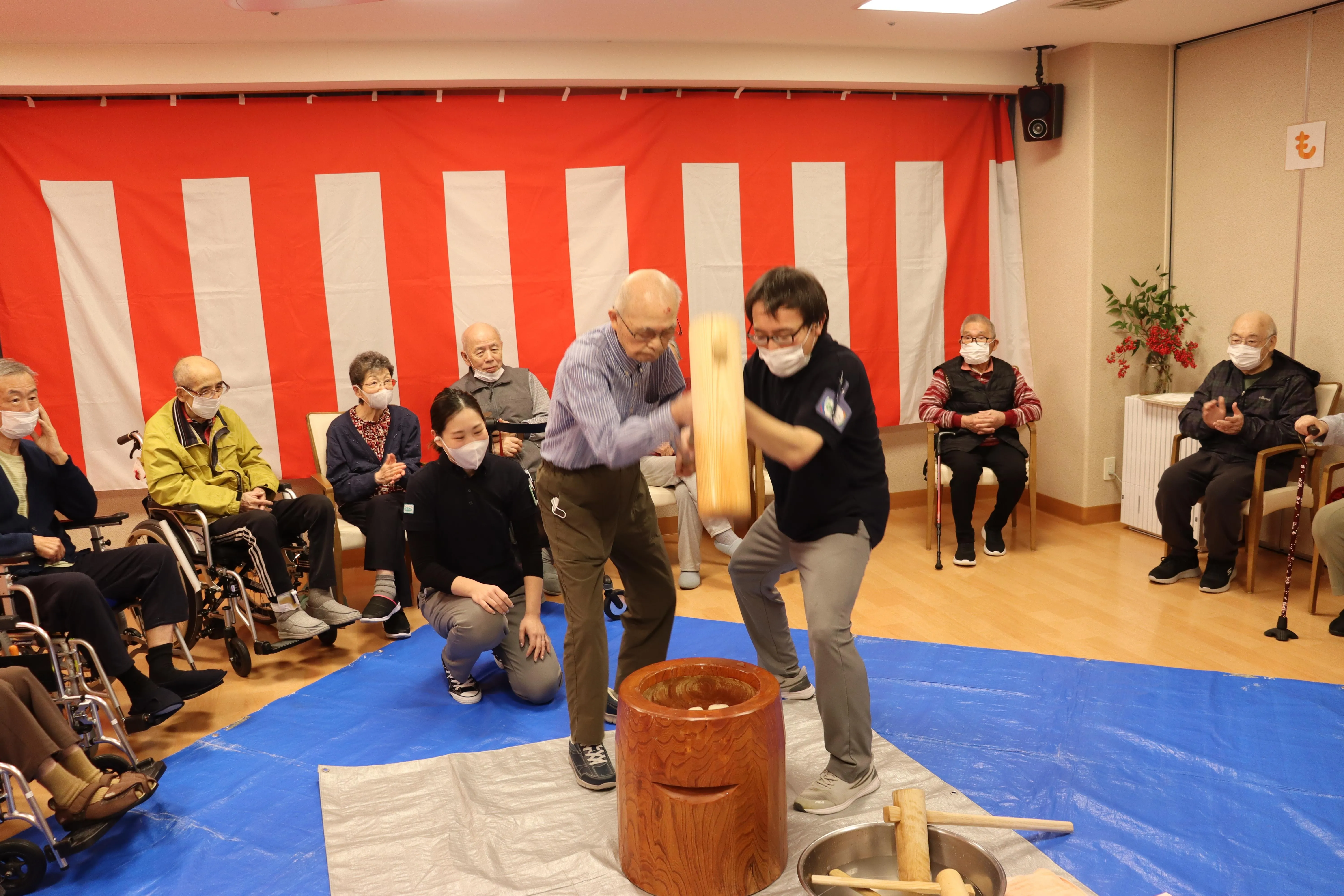 昨年末、恒例のもちつき大会を行いました。昔ながらの臼と杵を使ってのおもちつき。懐かしさとスタッフの掛け声とともに、たくさんのお客様に頑張ってついていただきました。