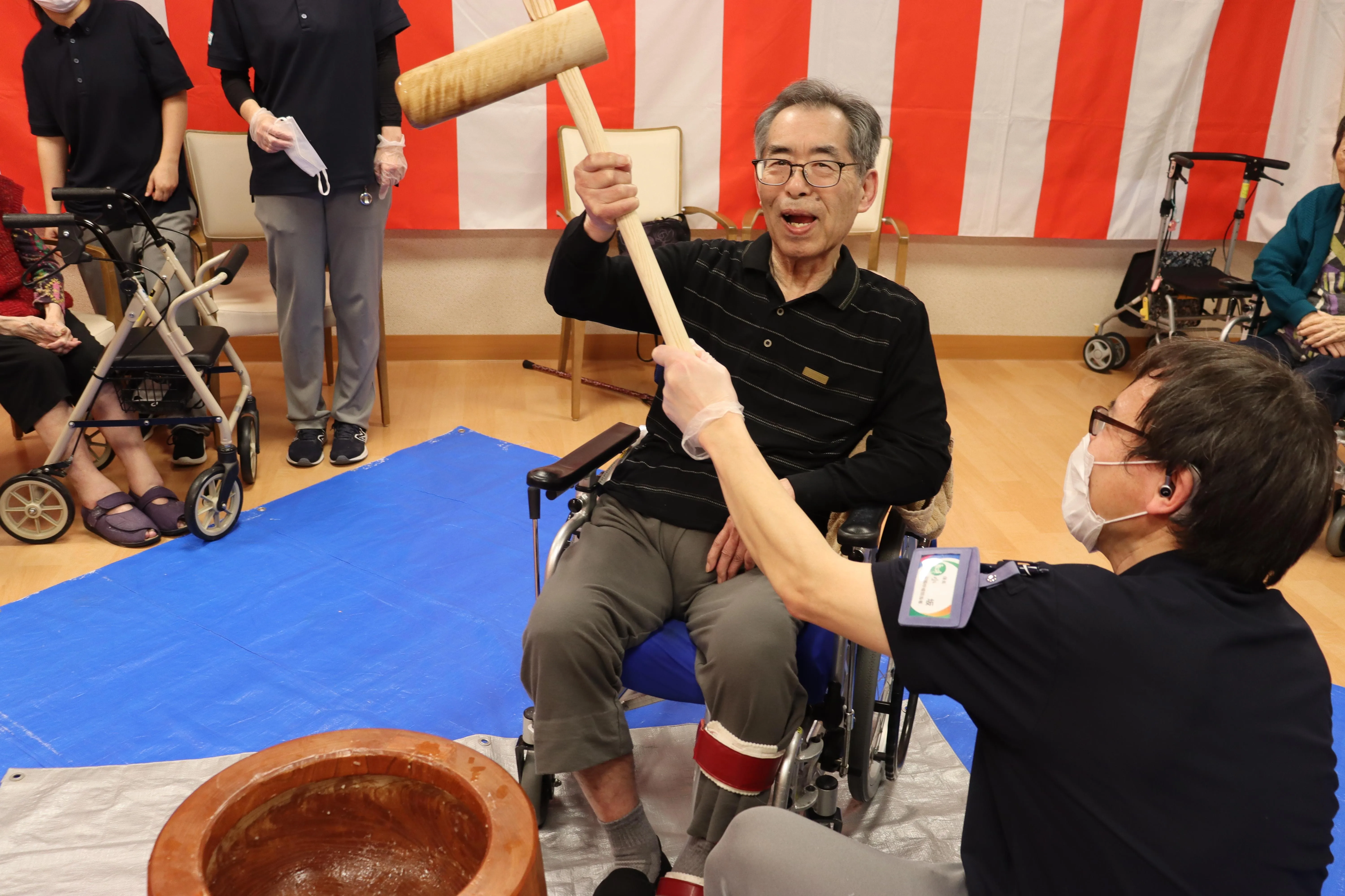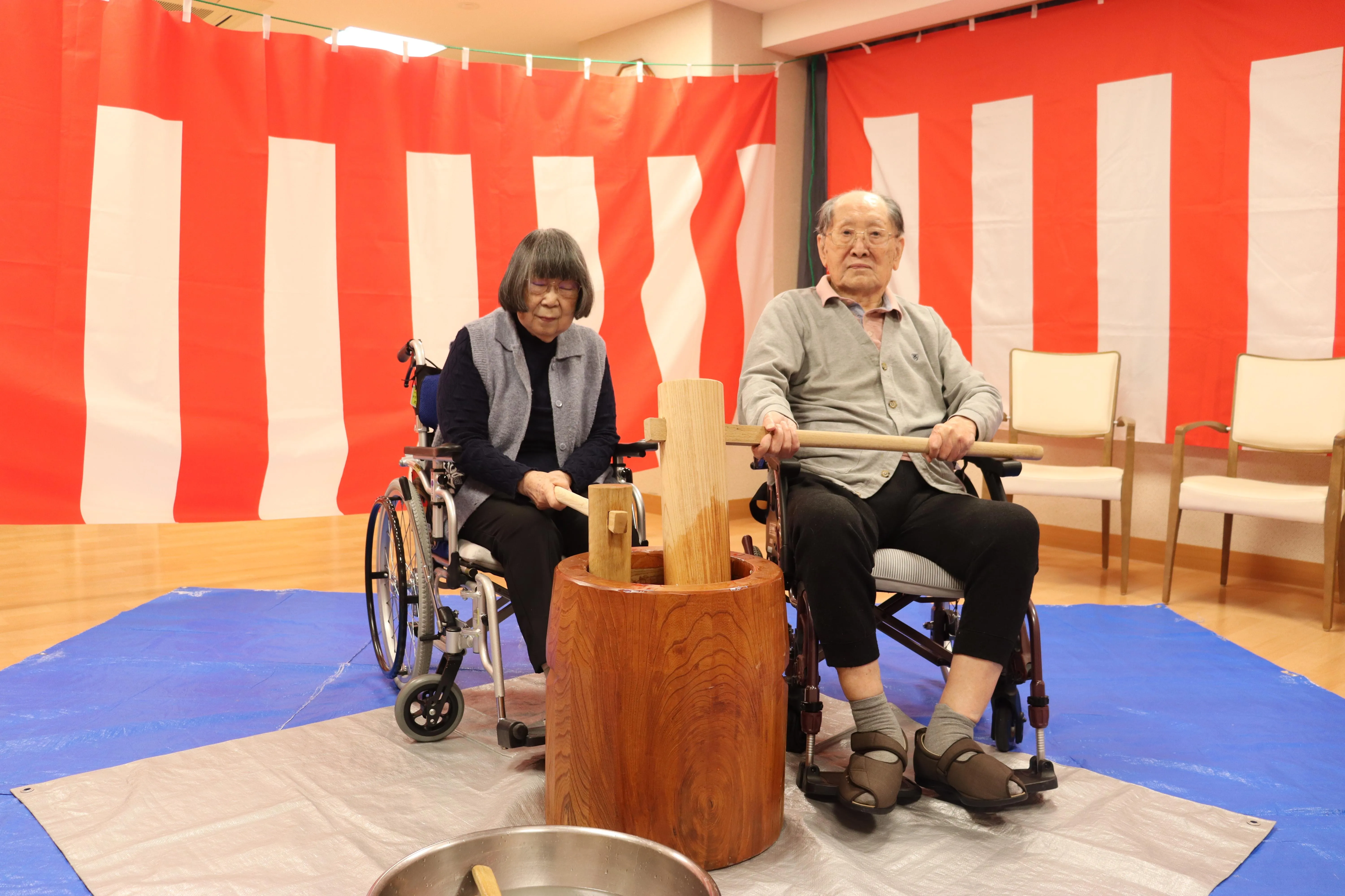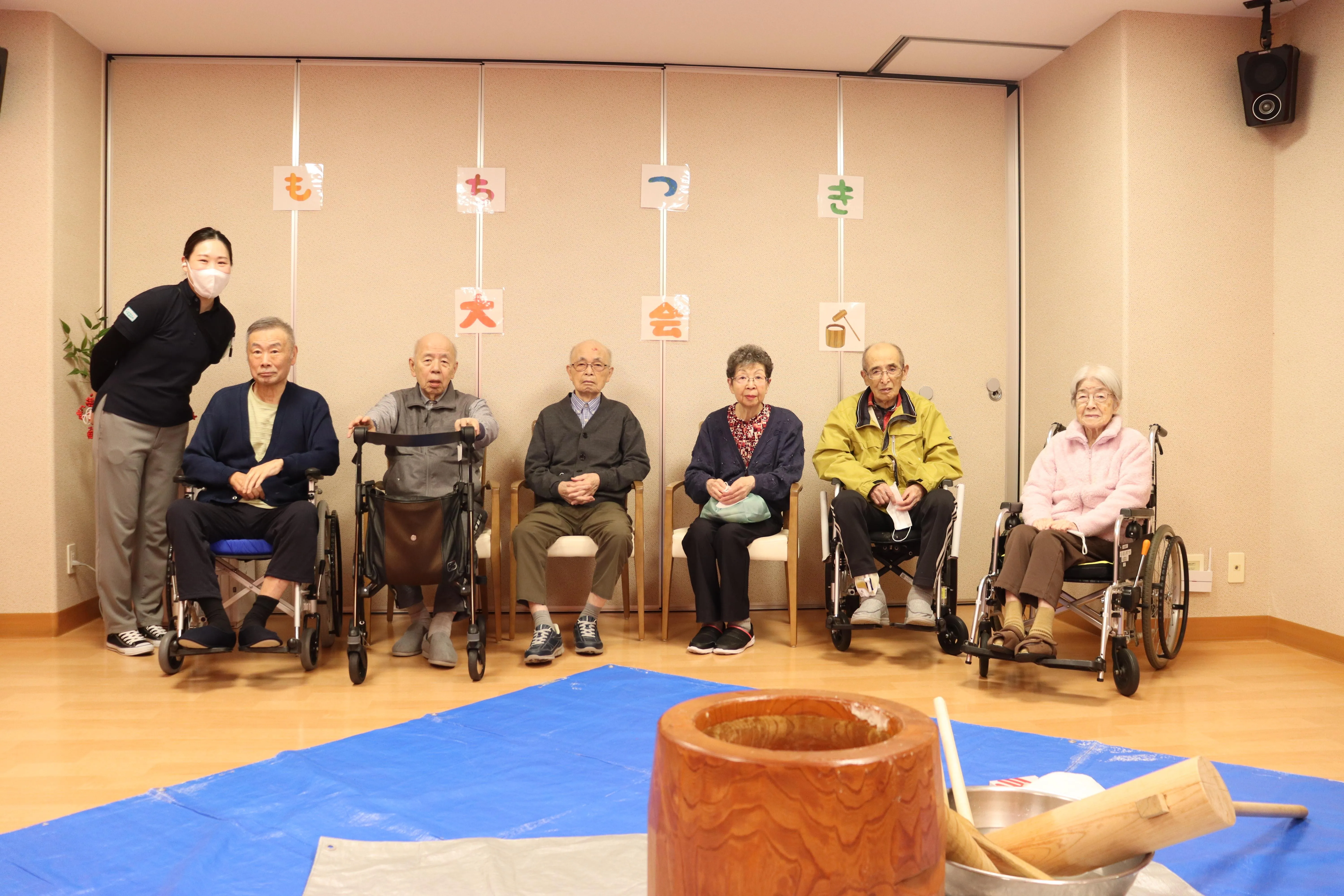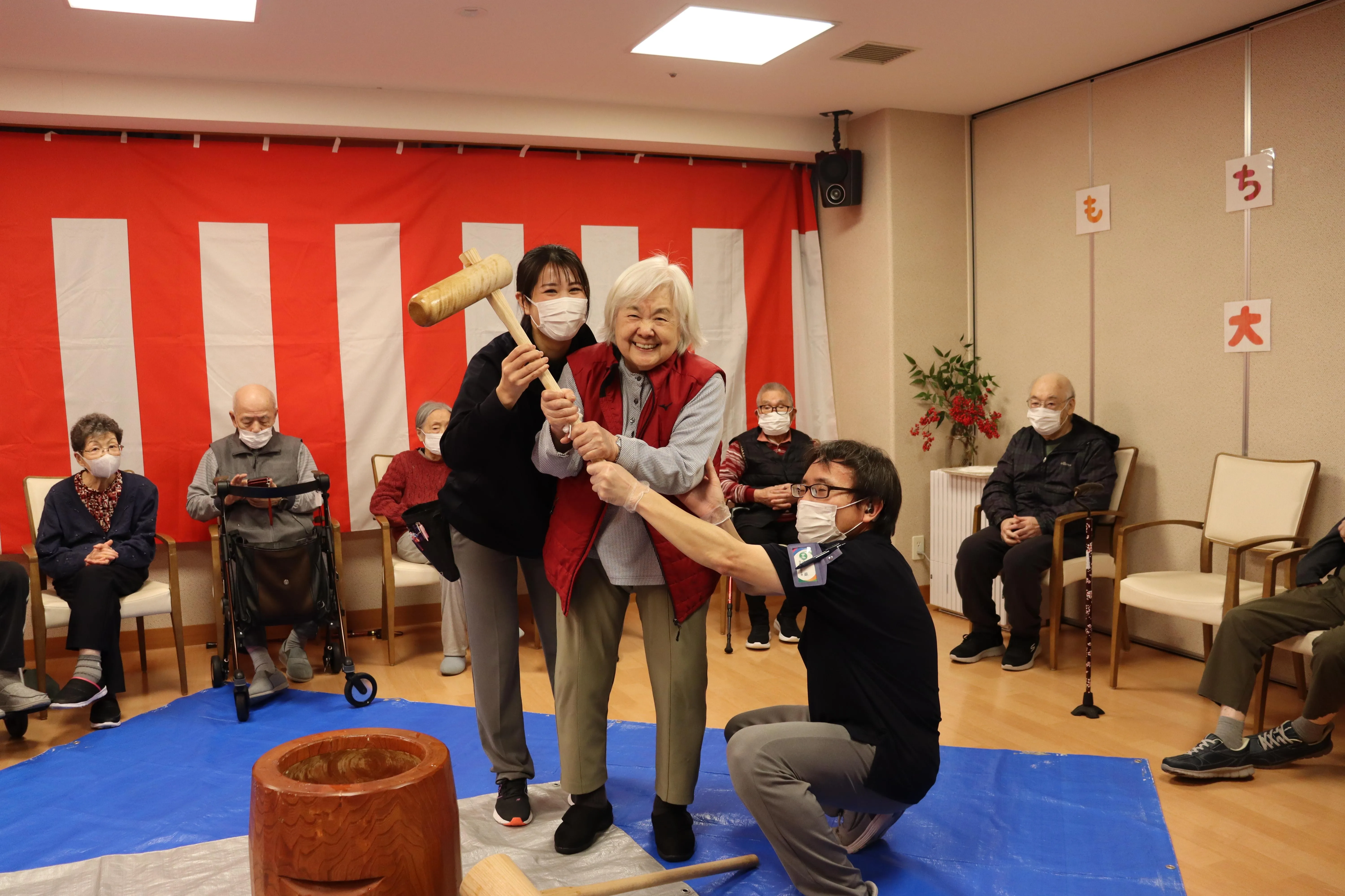 昨年末、恒例のもちつき大会を行いました。昔ながらの臼と杵を使ってのおもちつき。懐かしさとスタッフの掛け声とともに、たくさんのお客様に頑張ってついていただきました。