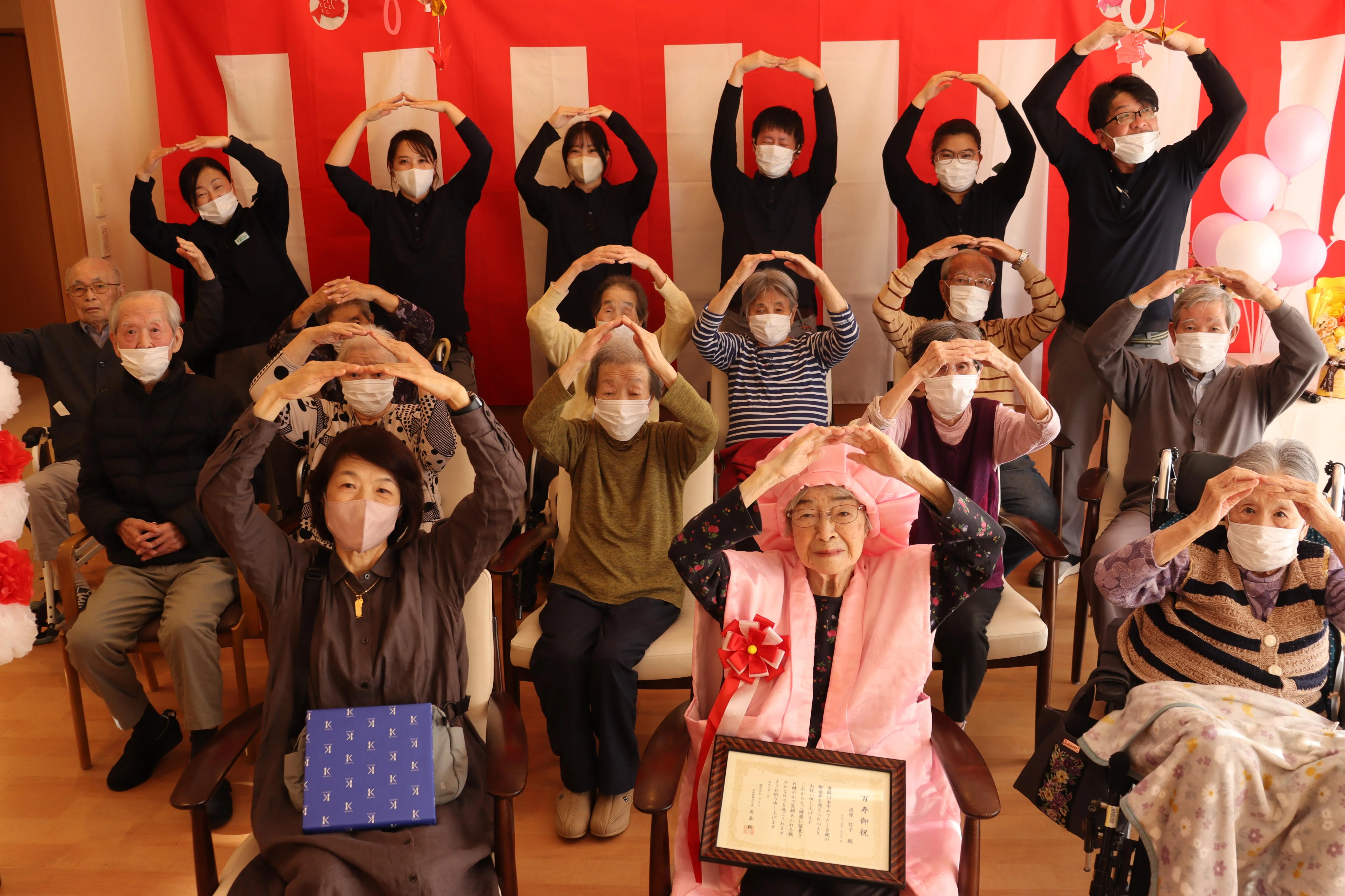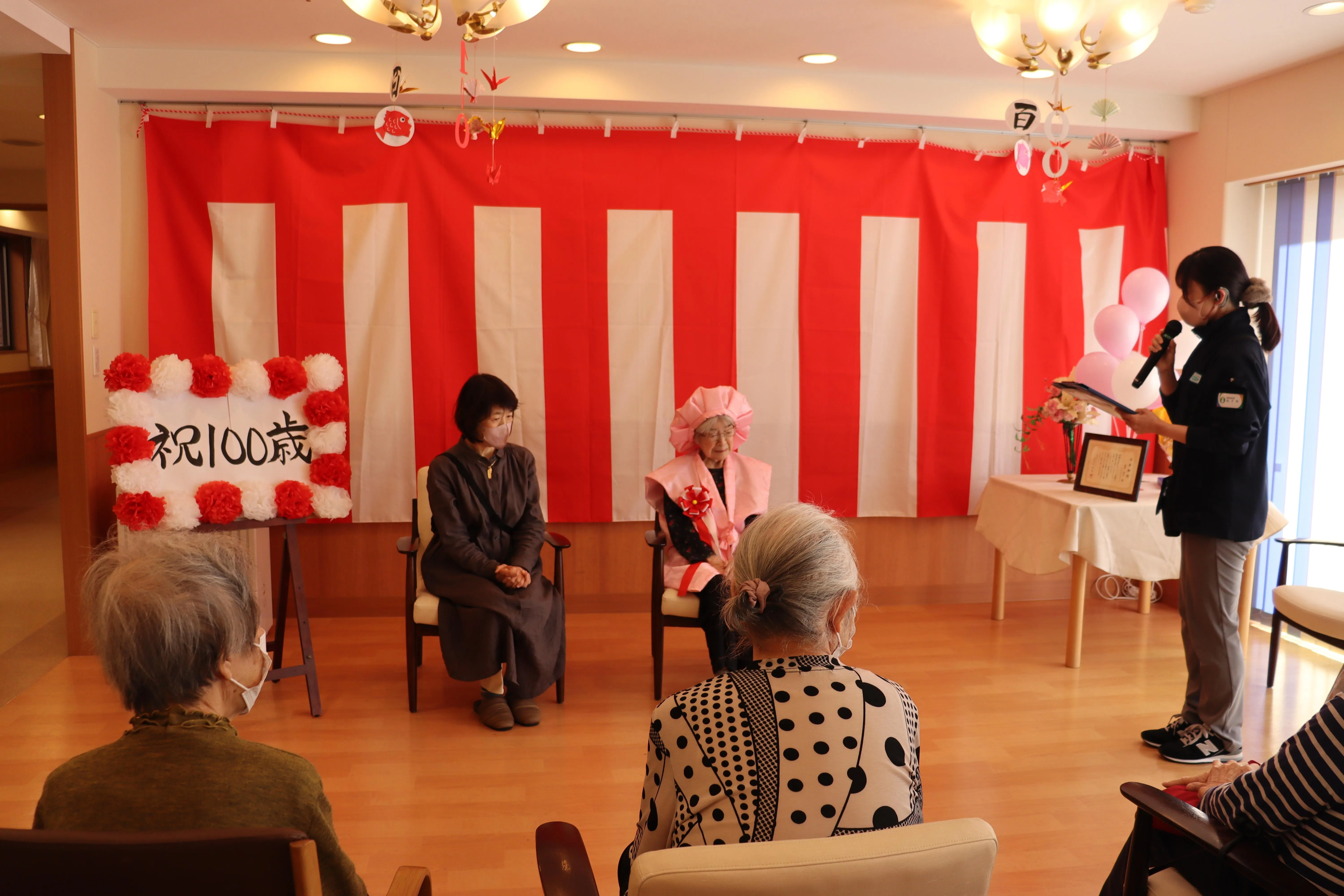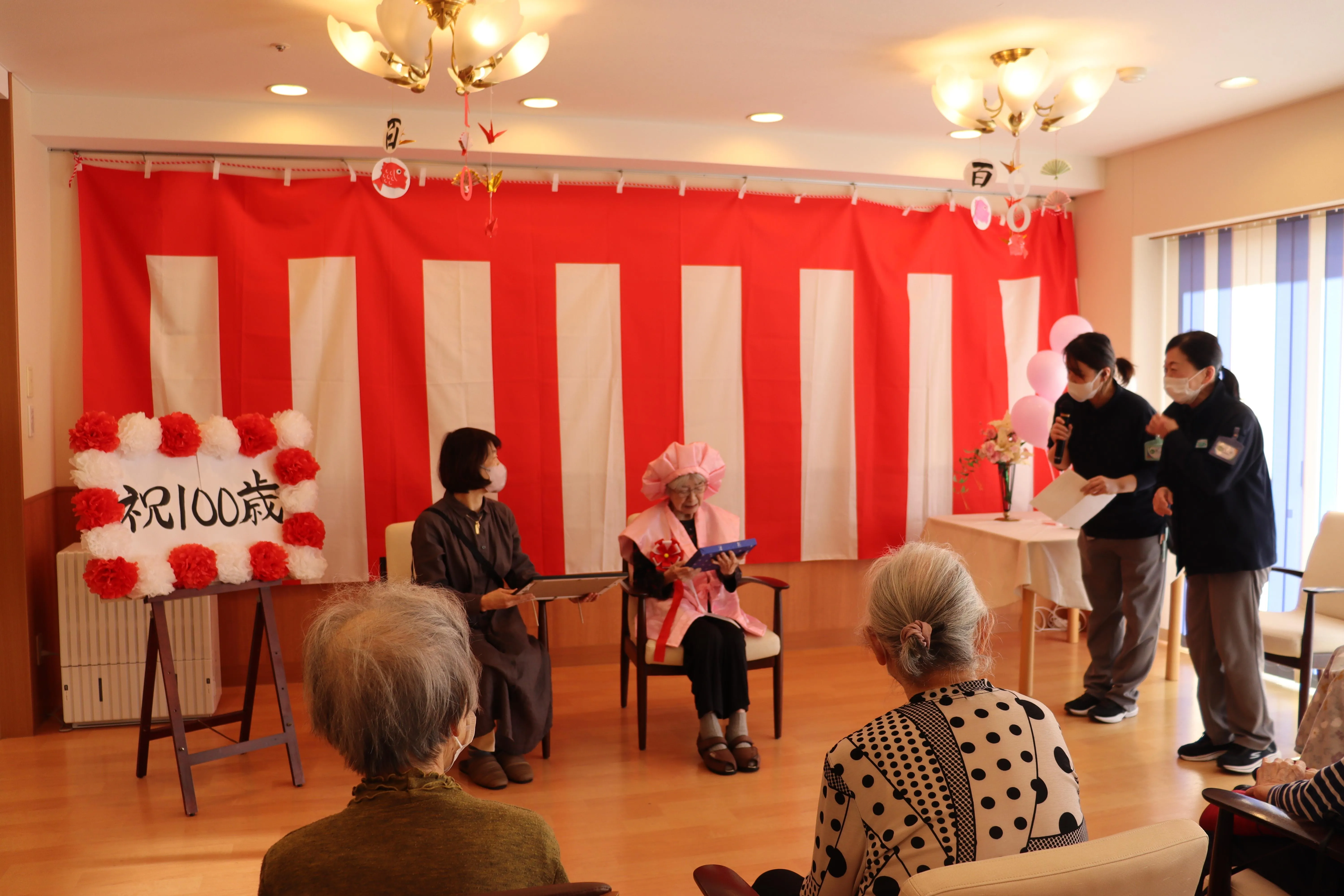 新年早々、めでたく100歳を迎えたお客様のお祝いの会を開催いたしました。昨年は体調を崩されることもあったお客様。受診の付添の際にはお客様が若い頃に足繫く通われた美味しいお魚が売っているお店をこっそり教えて頂いたり、お仕事に励まれていた頃の思い出を沢山聞かせて頂きました。こうしてお祝い出来たことスタッフ一同大変嬉しく思います。お客様のお部屋には若い頃のお写真が飾られているのですが、100年=1世紀というお客様が歩んでこられた歴史の重みを感じます。お客様がこれからも、ツクイ・サンシャイン町田東館で新たな歴史を紡いでいかれることを心より願っております。