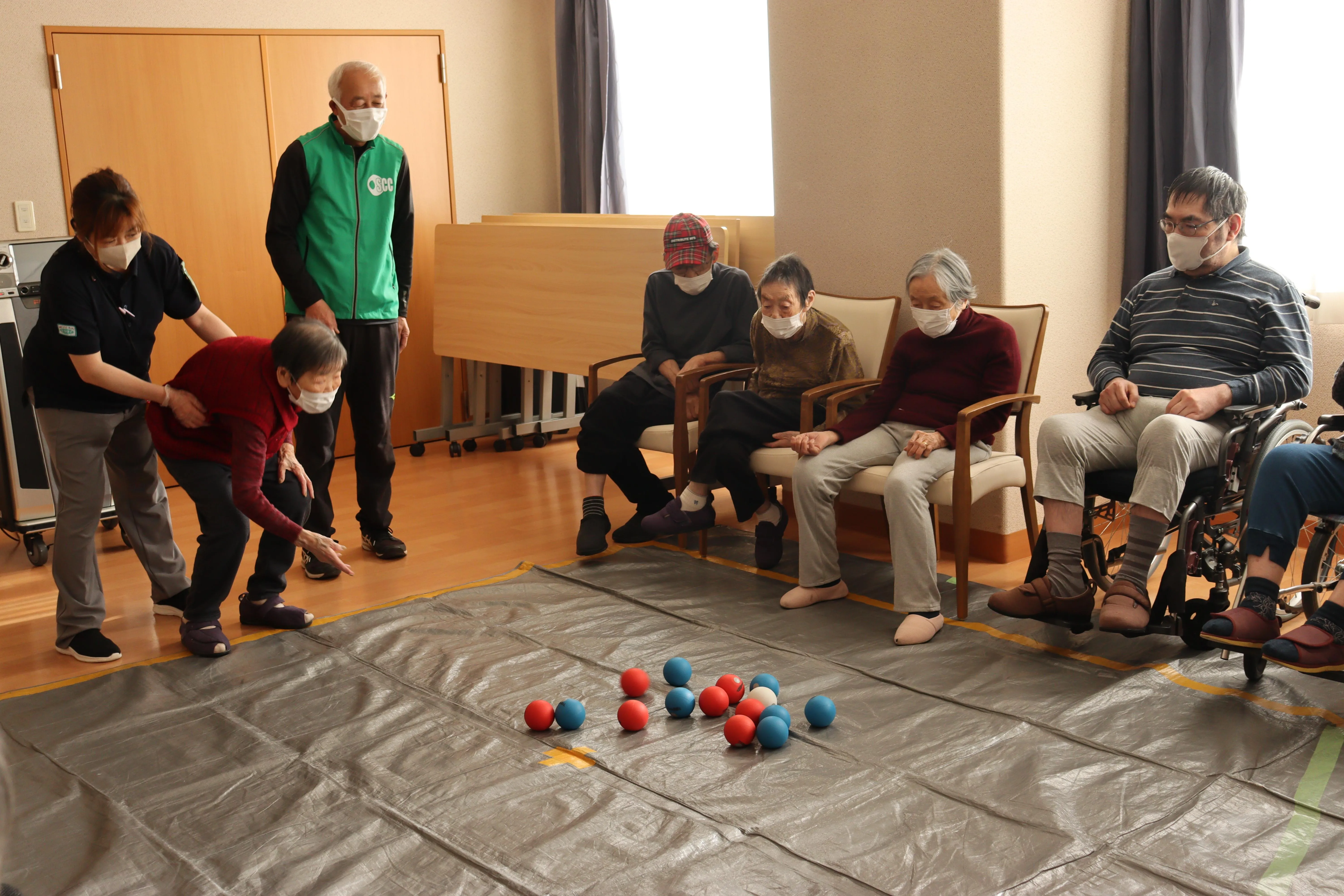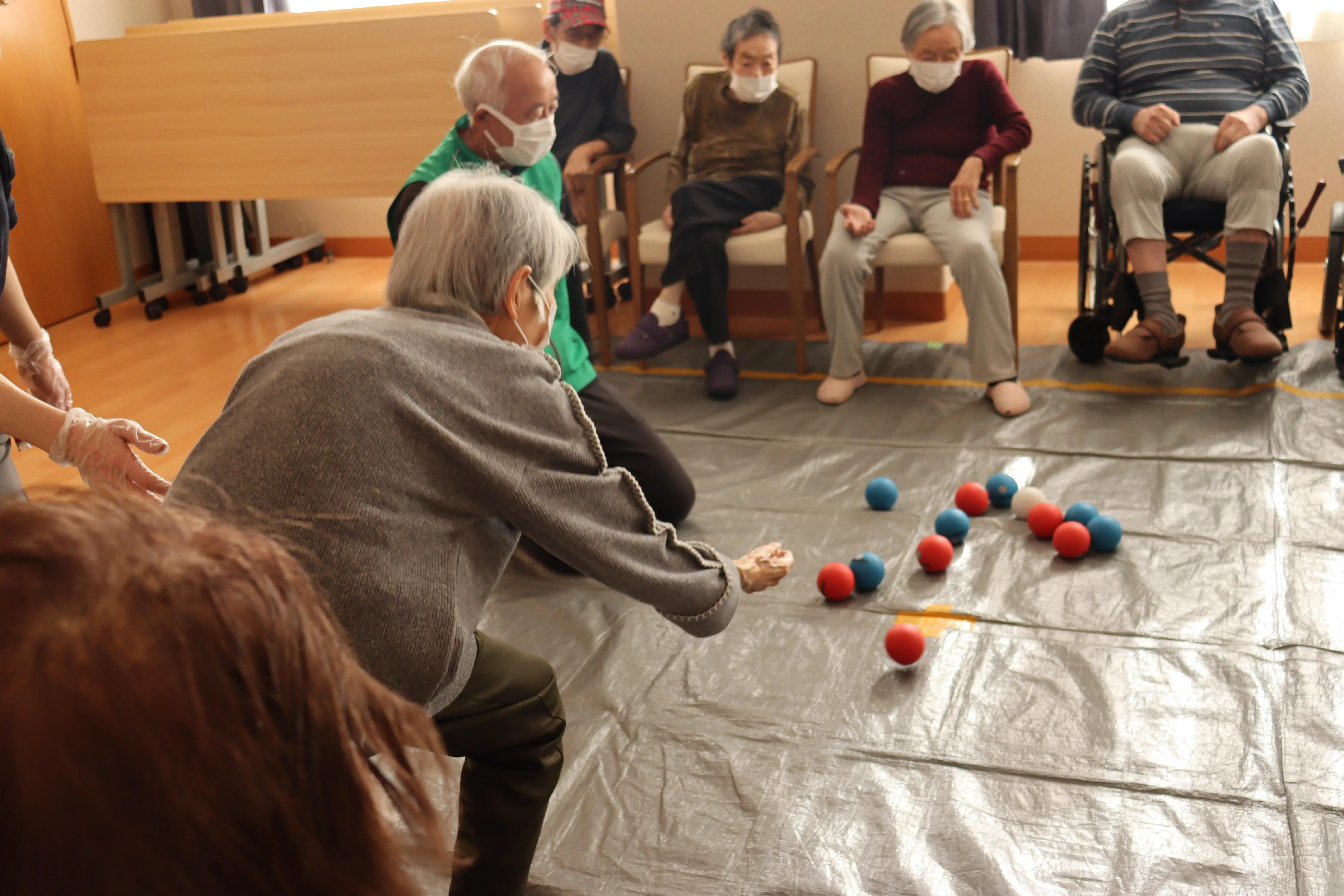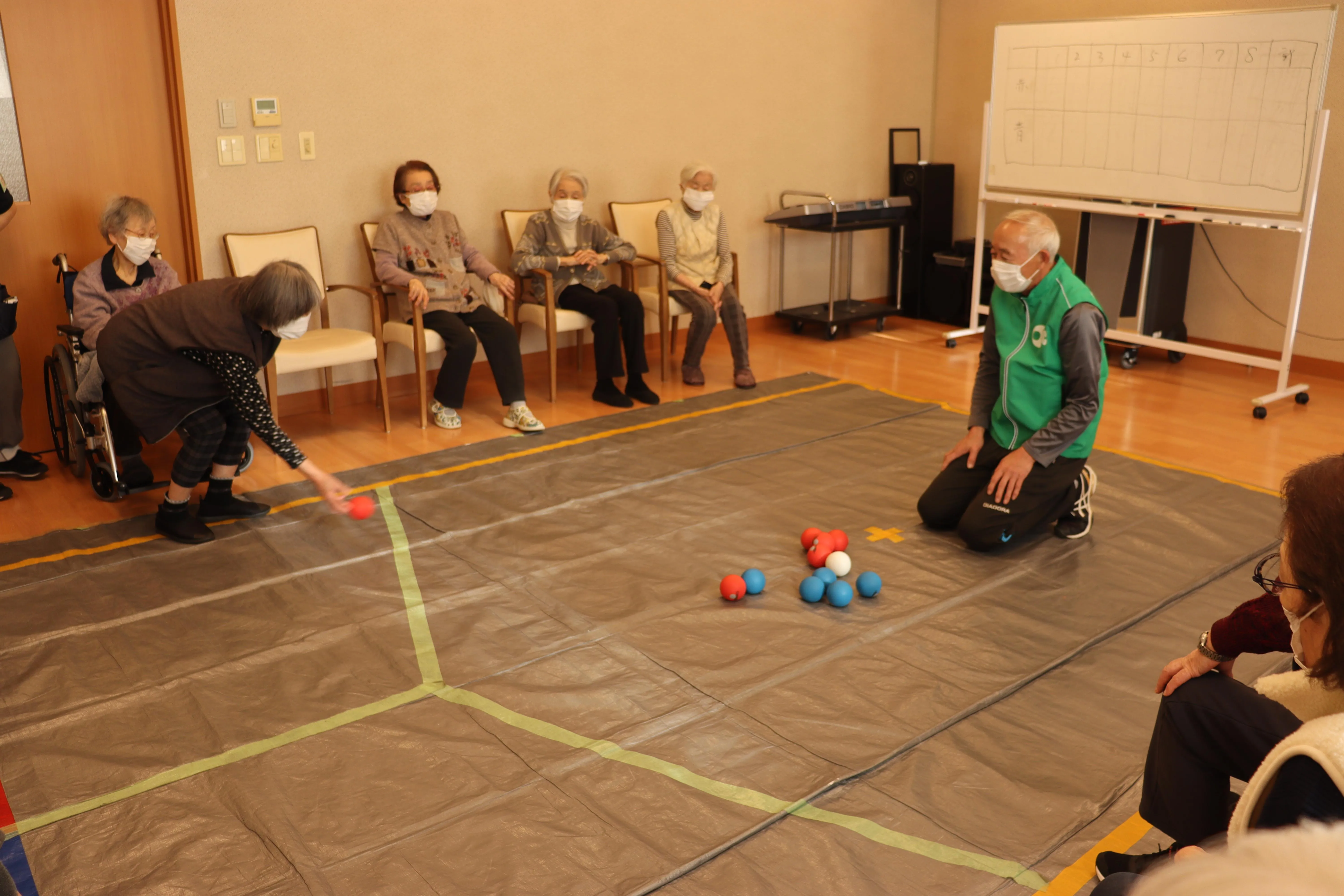 ボッチャといえば障害者のスポーツとして広まってきておりますが、ここツクイ・サンシャイン町田東館では、レクリエーションのひとつとして皆様に楽しんで頂いています。入居して初めて専用のボールを触ったお客様も回を重ねるごと、だんだんと上手になっていくのが分かります。