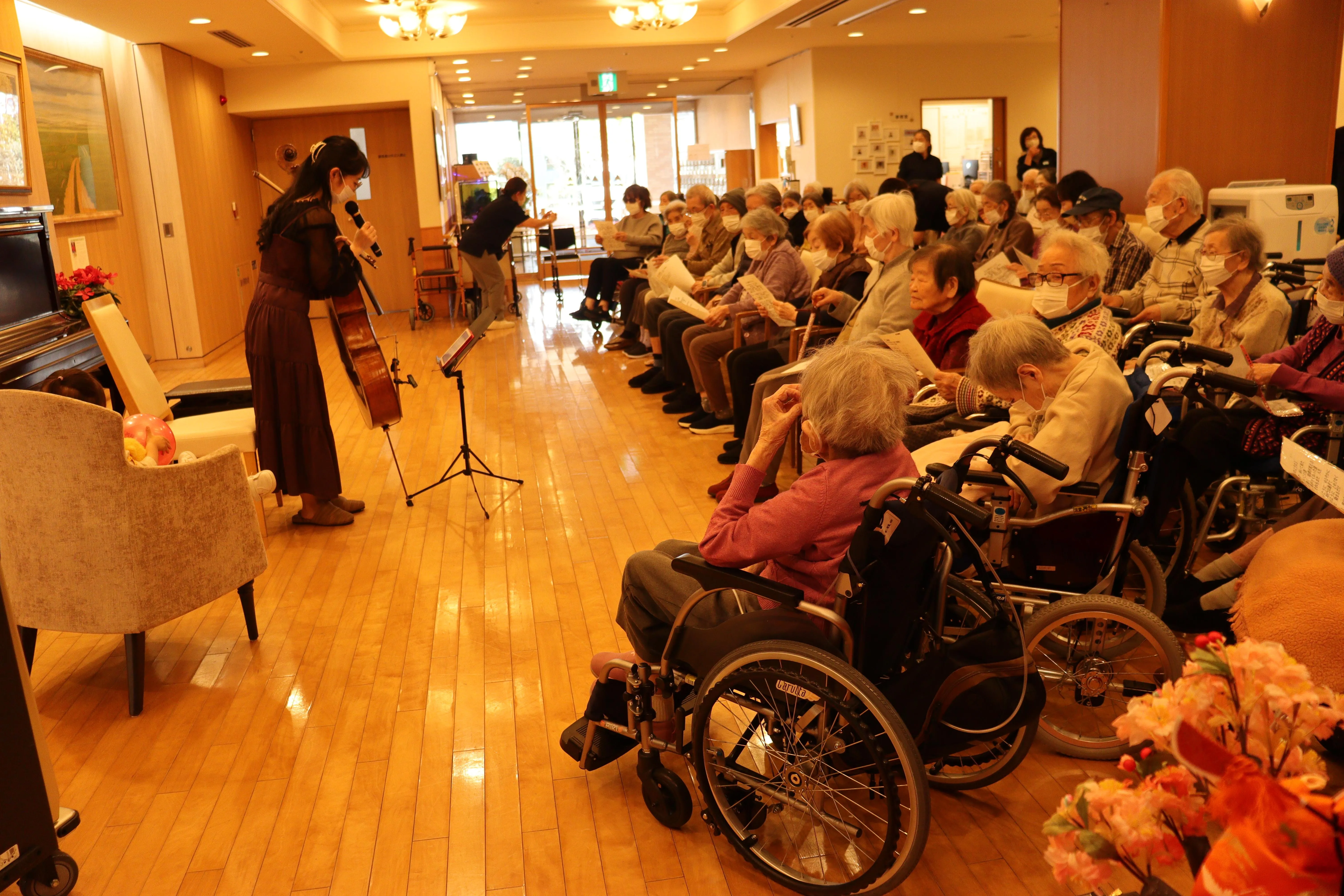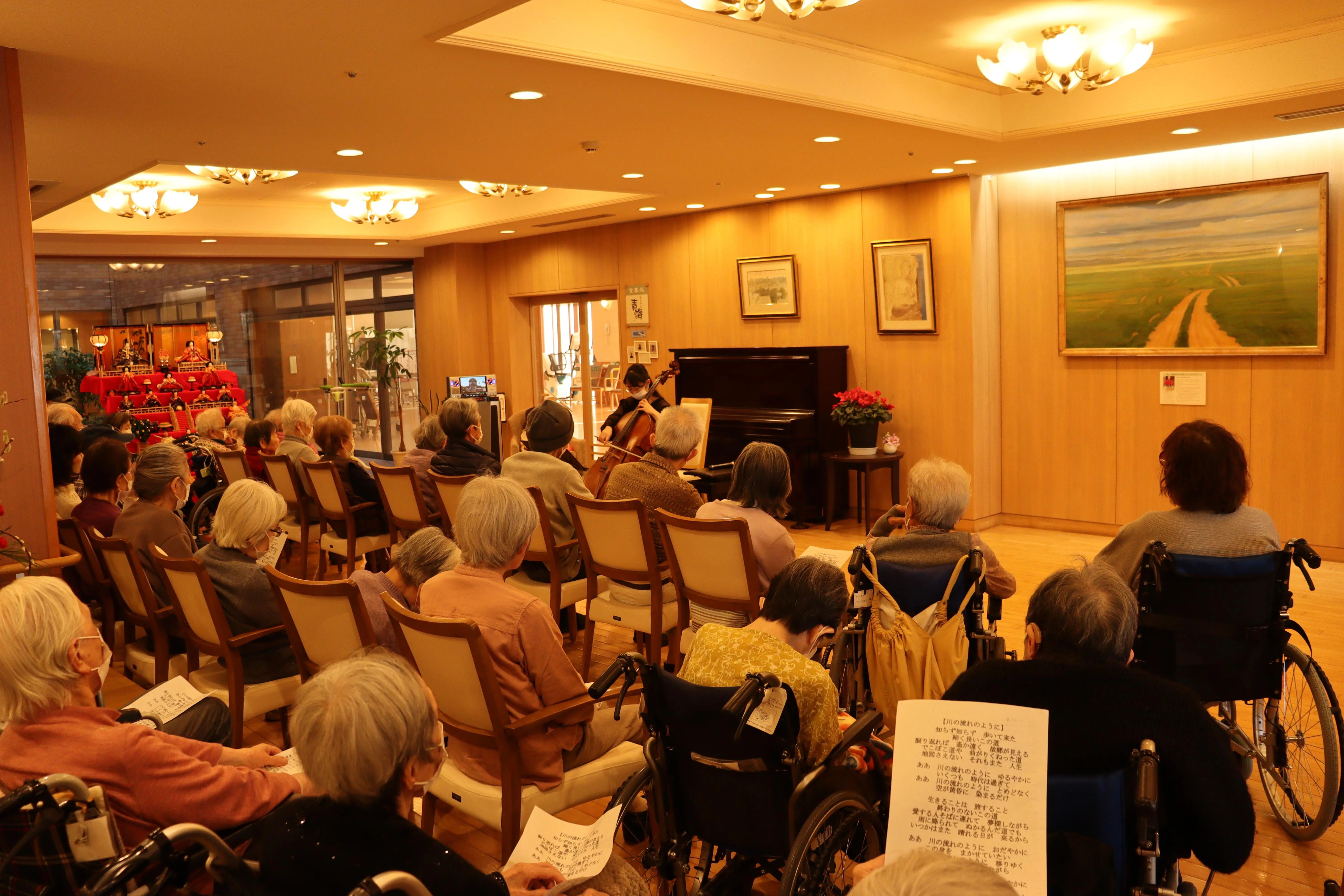 チェロの優雅な音色に、春を感じながらのコンサート。素敵な午後のひとときを楽しんで頂きました。もちろん歌のコーナーもございました。チェロに合わせて昭和歌謡を皆様で大合唱。そんな体験も施設ならではですね。3月は唱歌のコンサートの予定です。お楽しみに!