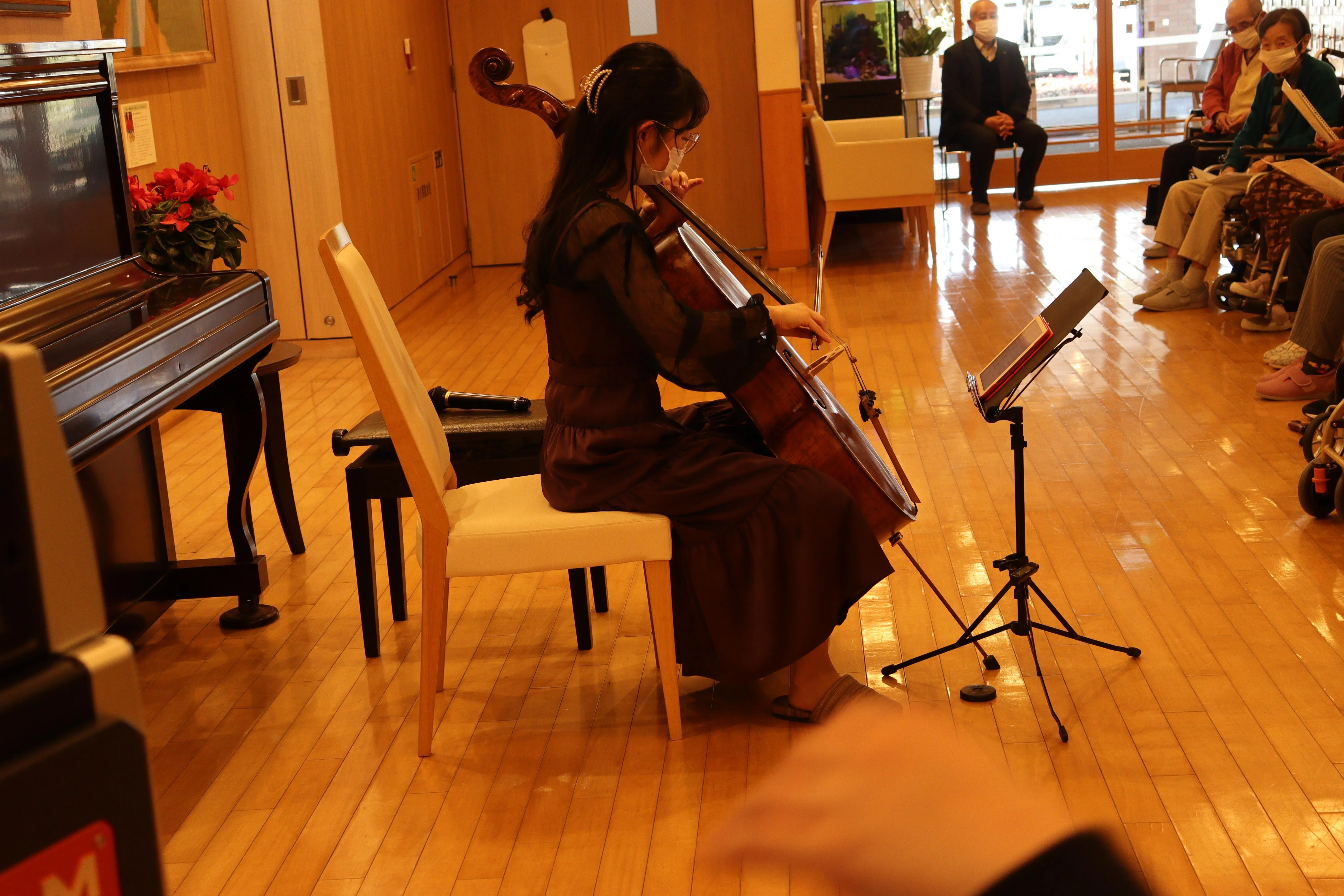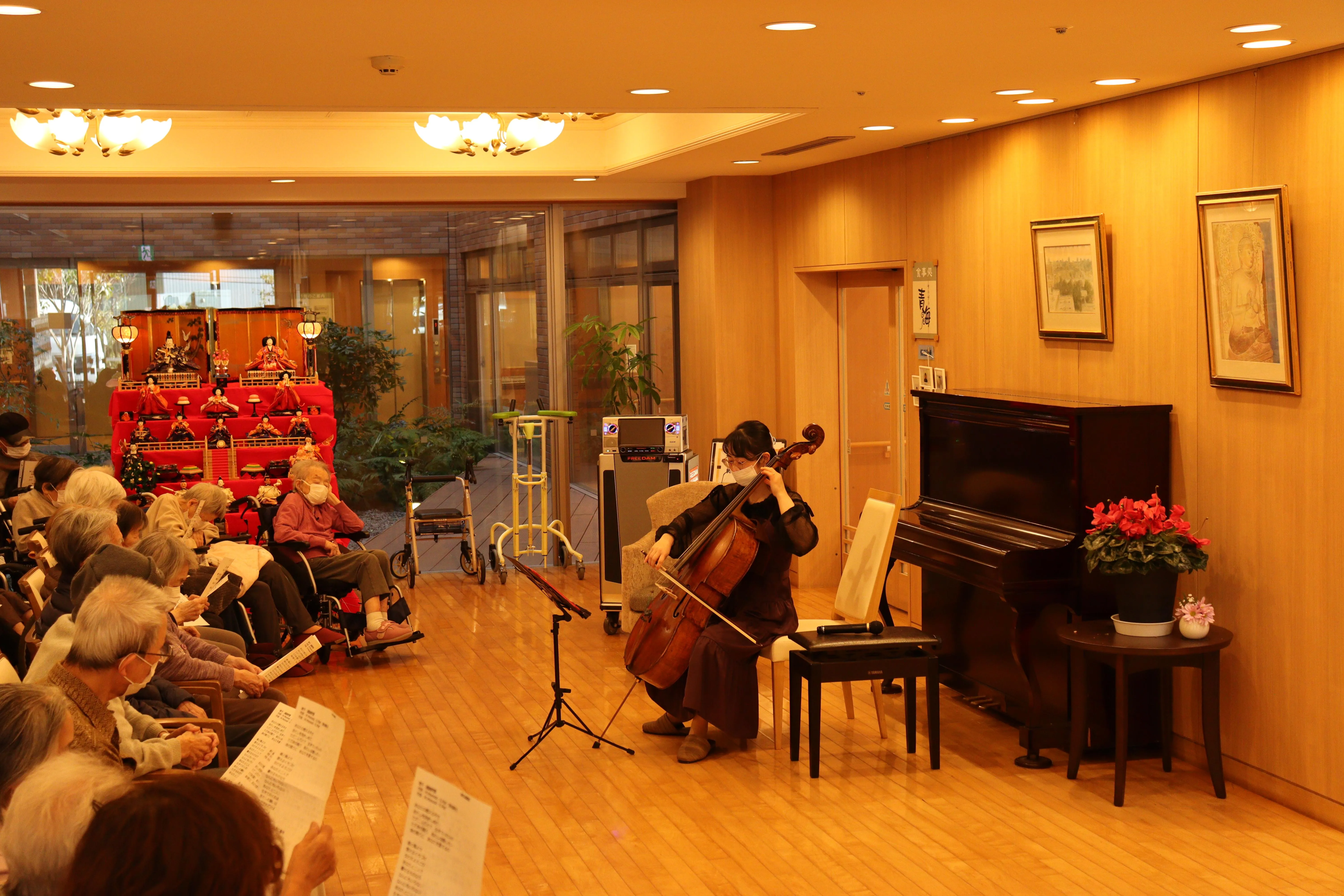 ツクイ・サンシャイン町田東館、恒例のコンサート。普段お目にかかることがなかなかない楽器の生演奏会は、お客様皆様に好評を博しております。2月はチェロのコンサート。お雛様も見守るエントランスで、春のコンサートを楽しんで頂きました。