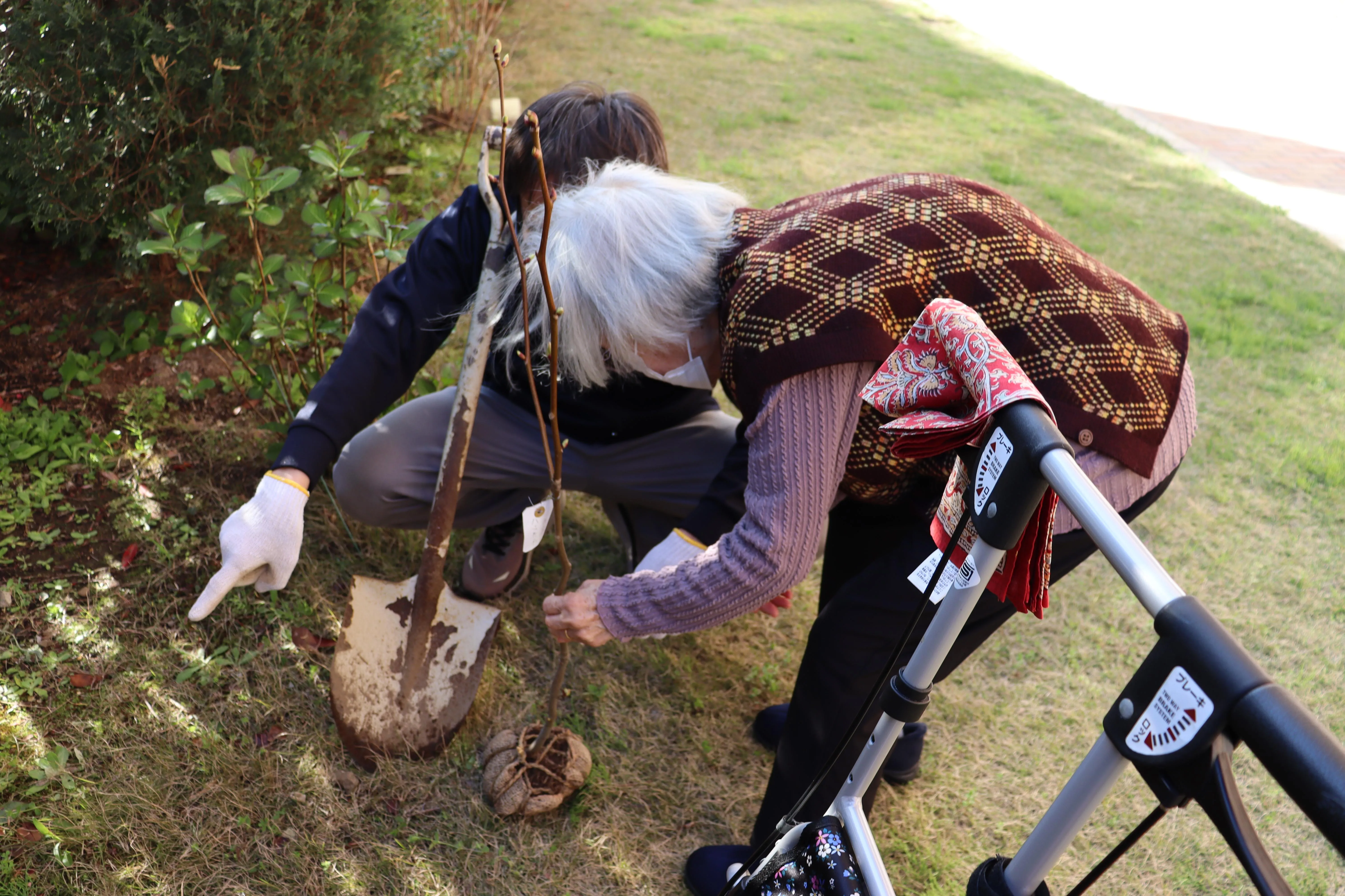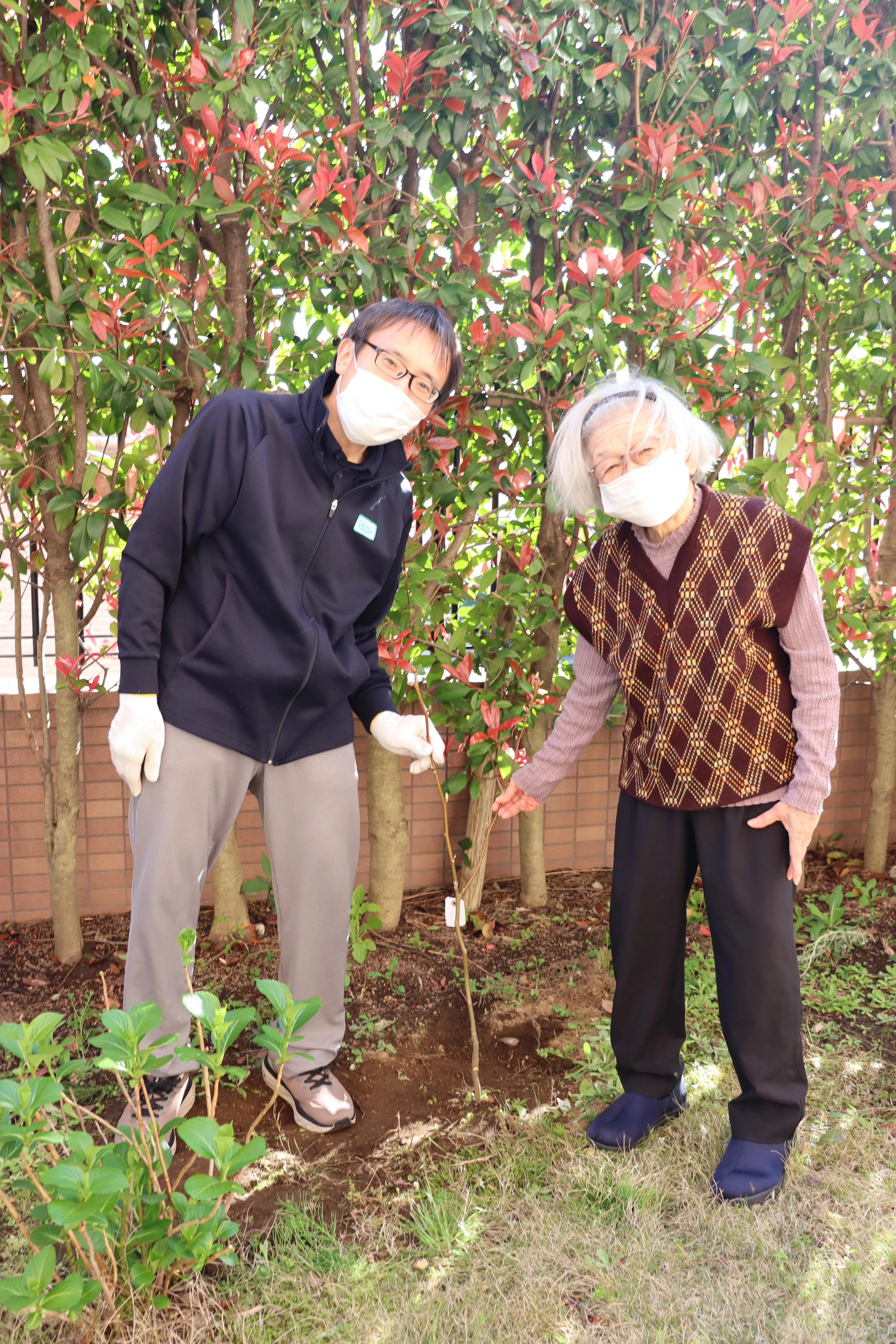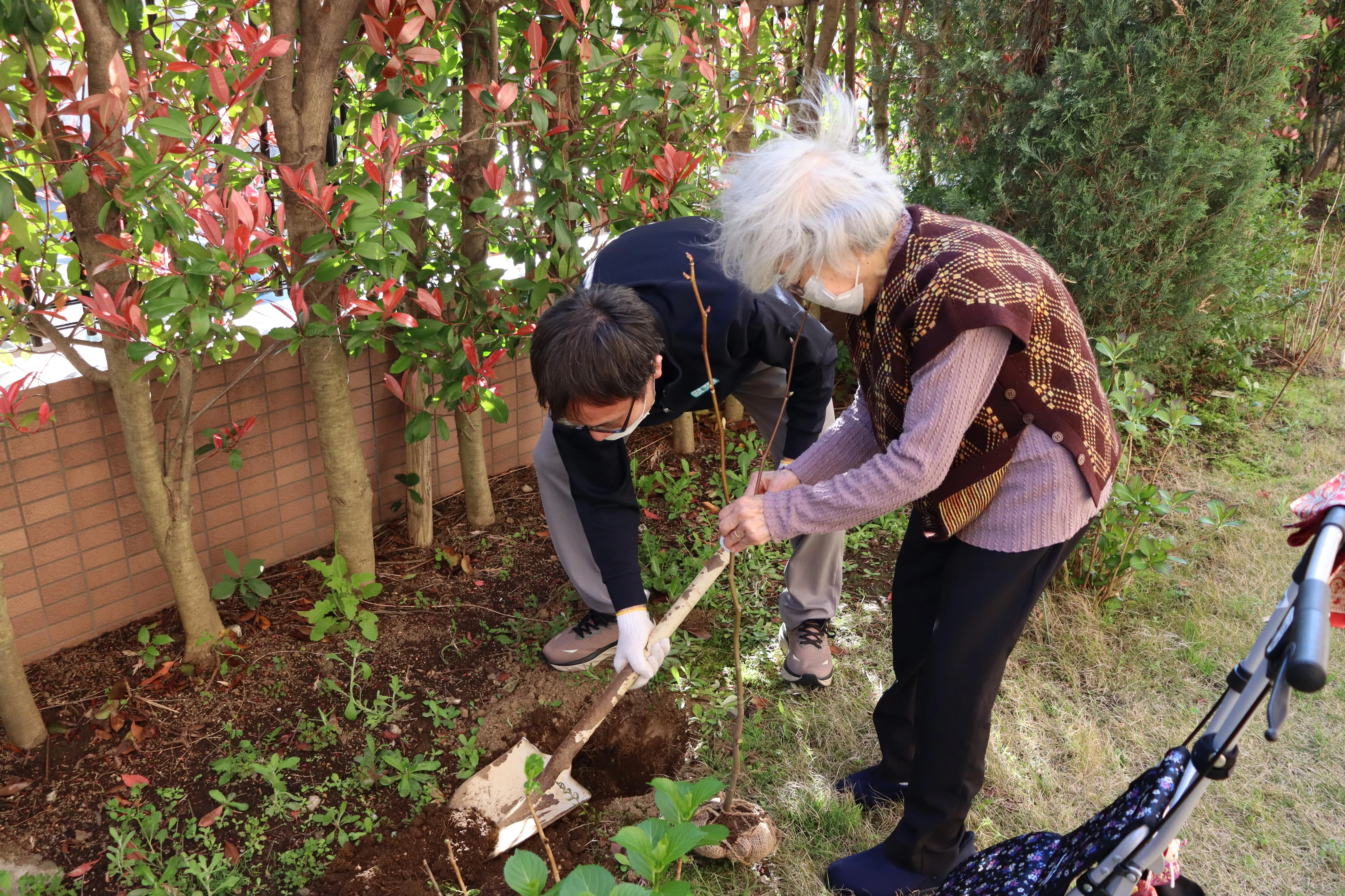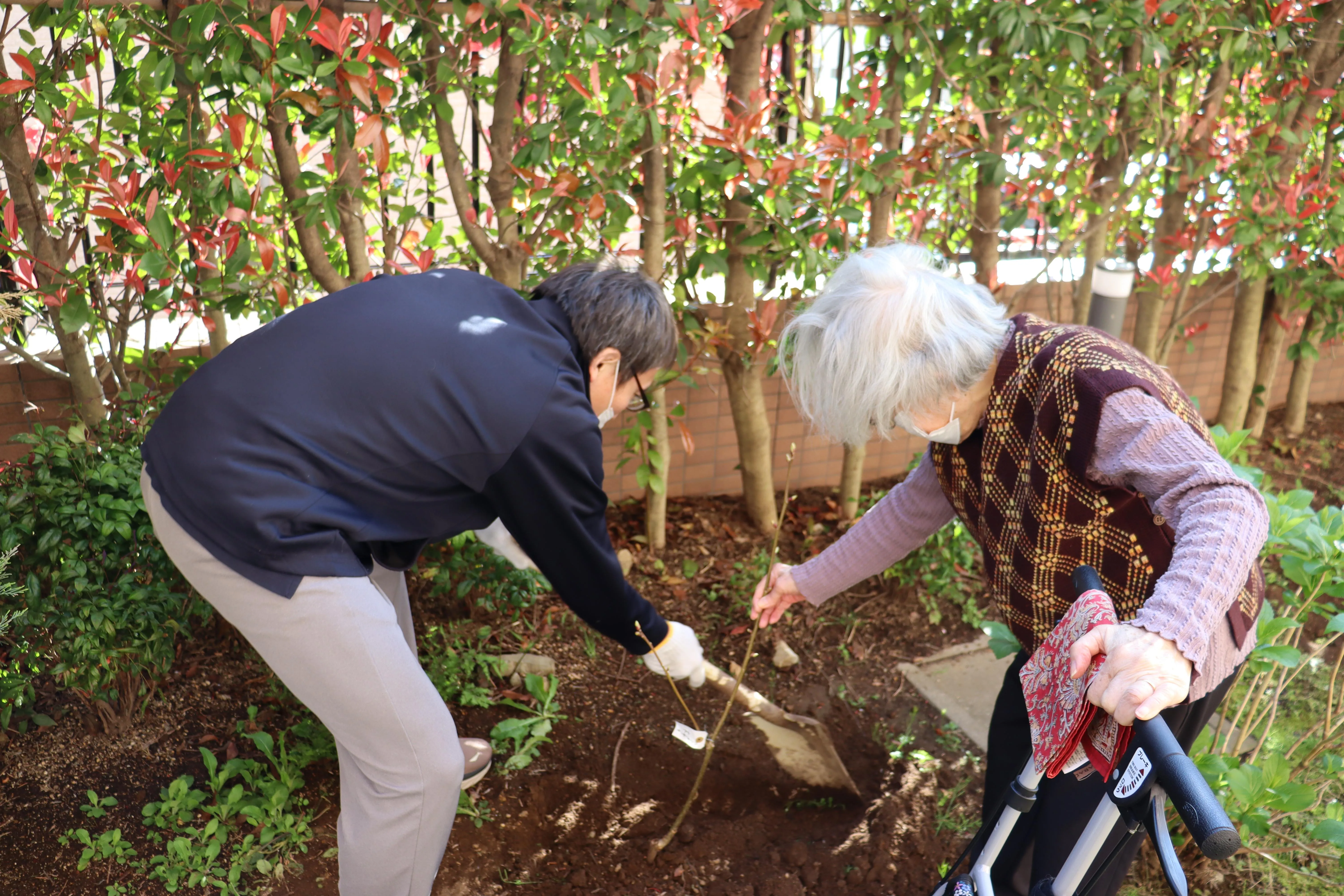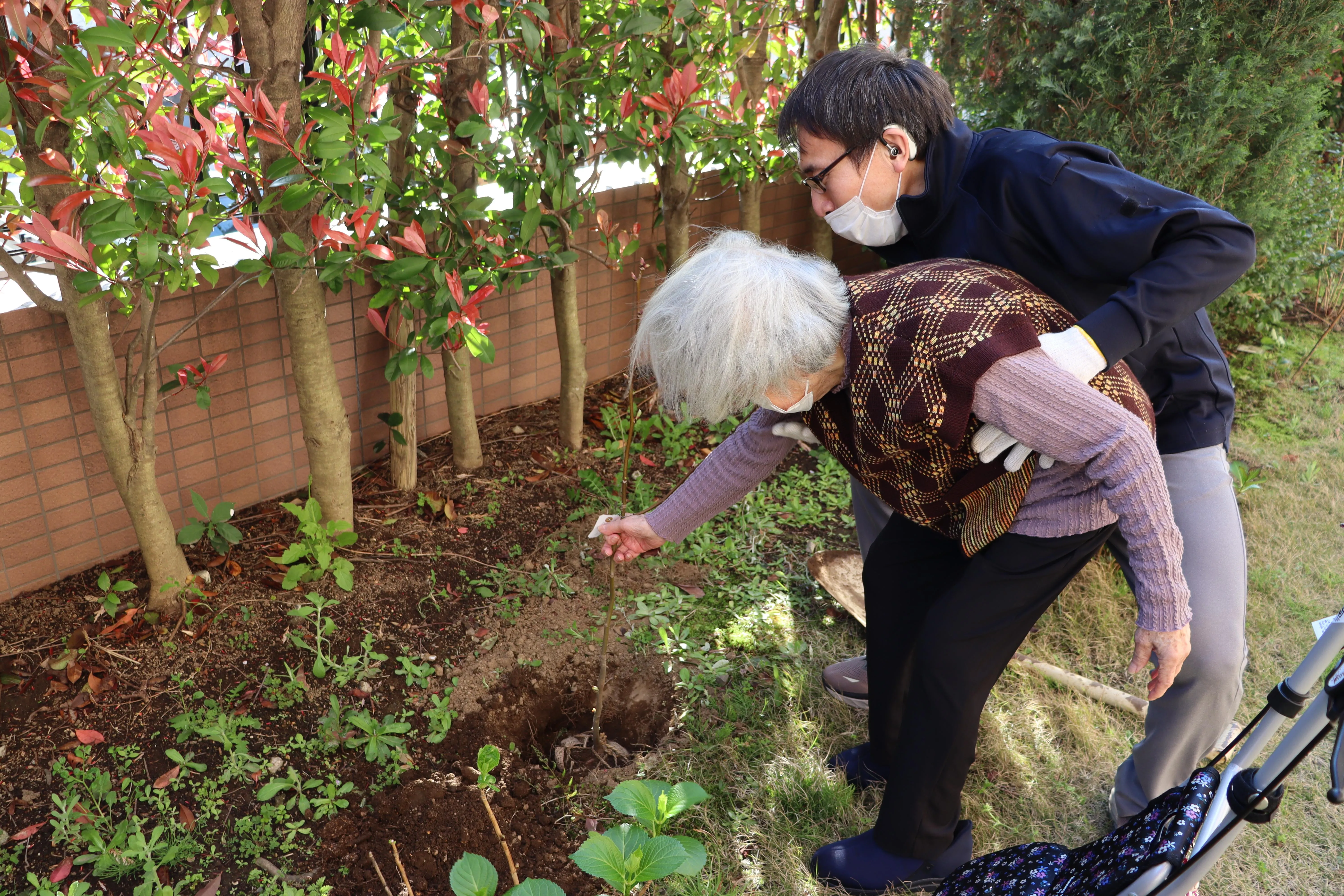 お客様よりハンカチノキの苗を頂き、一緒に植樹を致しました。植樹はスタッフが行い、お客様には作業を見守って頂こうと思っておりました。穴を掘り植える段階で「私の方がよくわかってるから」とお客様自らスコップを持ち、苗を結んでいる麻紐の切る位置もご指導いただき、無事町田東館の庭に植えることができました。