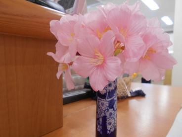 今年はお外へお花見、というのが難しいので、館内で春を感じていただこうと、飾り付けをしております。