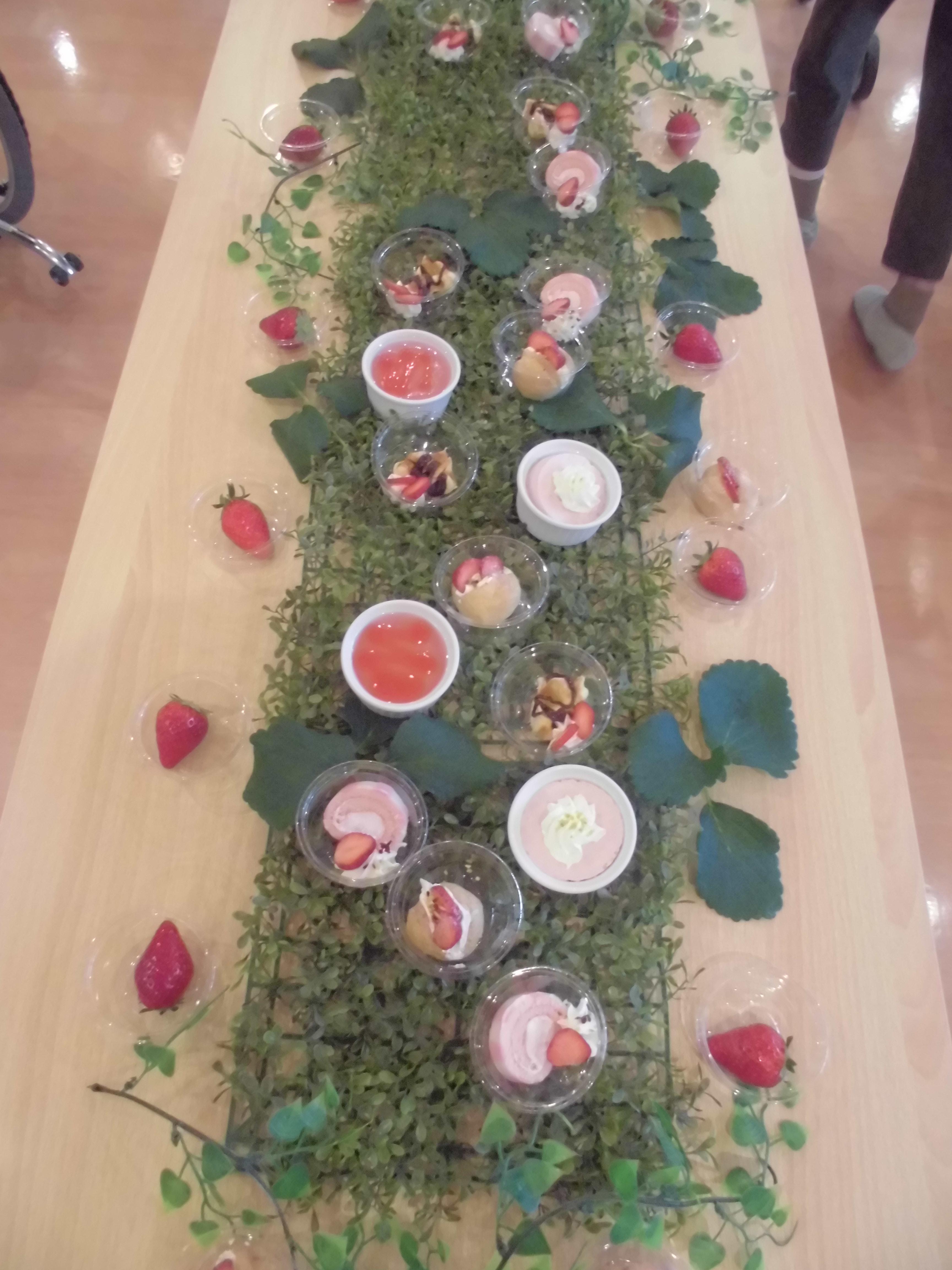 いちご園に朝どれいちごを買いに行き、いちごの葉っぱもわけてもらい、厨房スタッフ力作のイチゴデザートを飾りつけ、楽しんで頂きました。