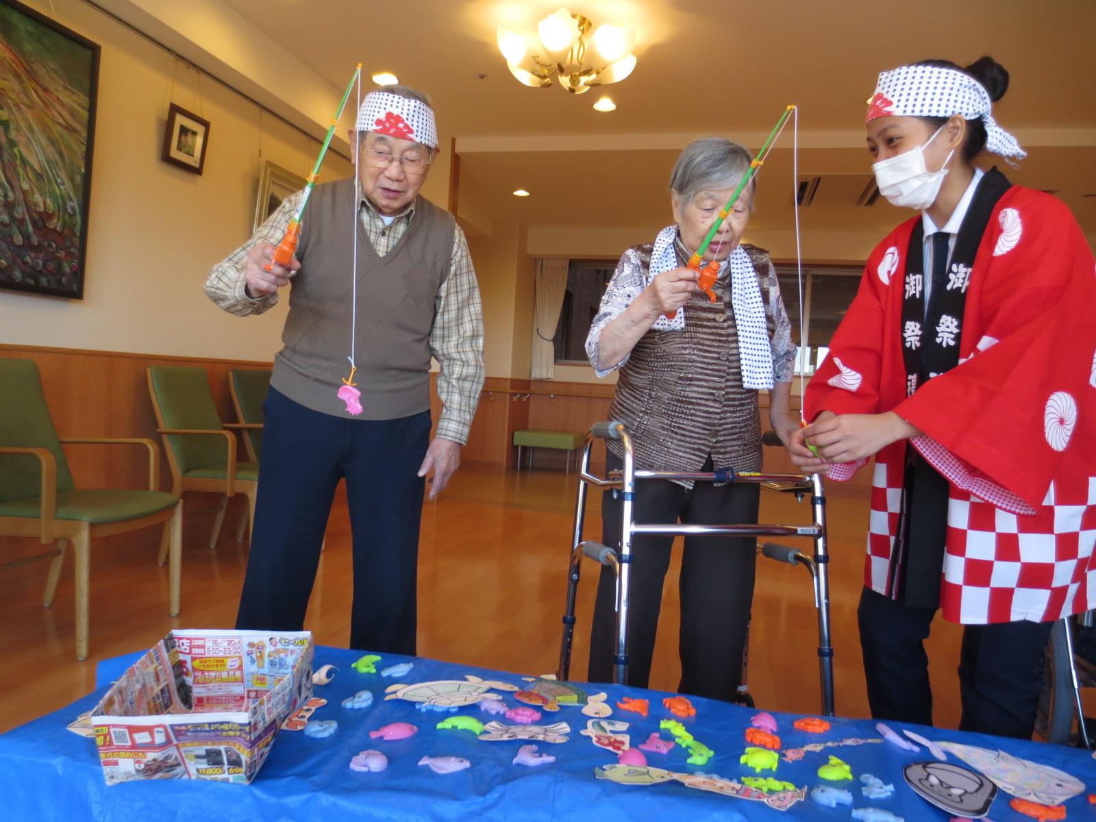 2Fフロアは魚釣りをしました。皆さん、いっぱい釣れていました。1F食堂に移動して出店にも並んで、お好きな物を選び、2F食堂でみんなで美味しく召し上がりました。
