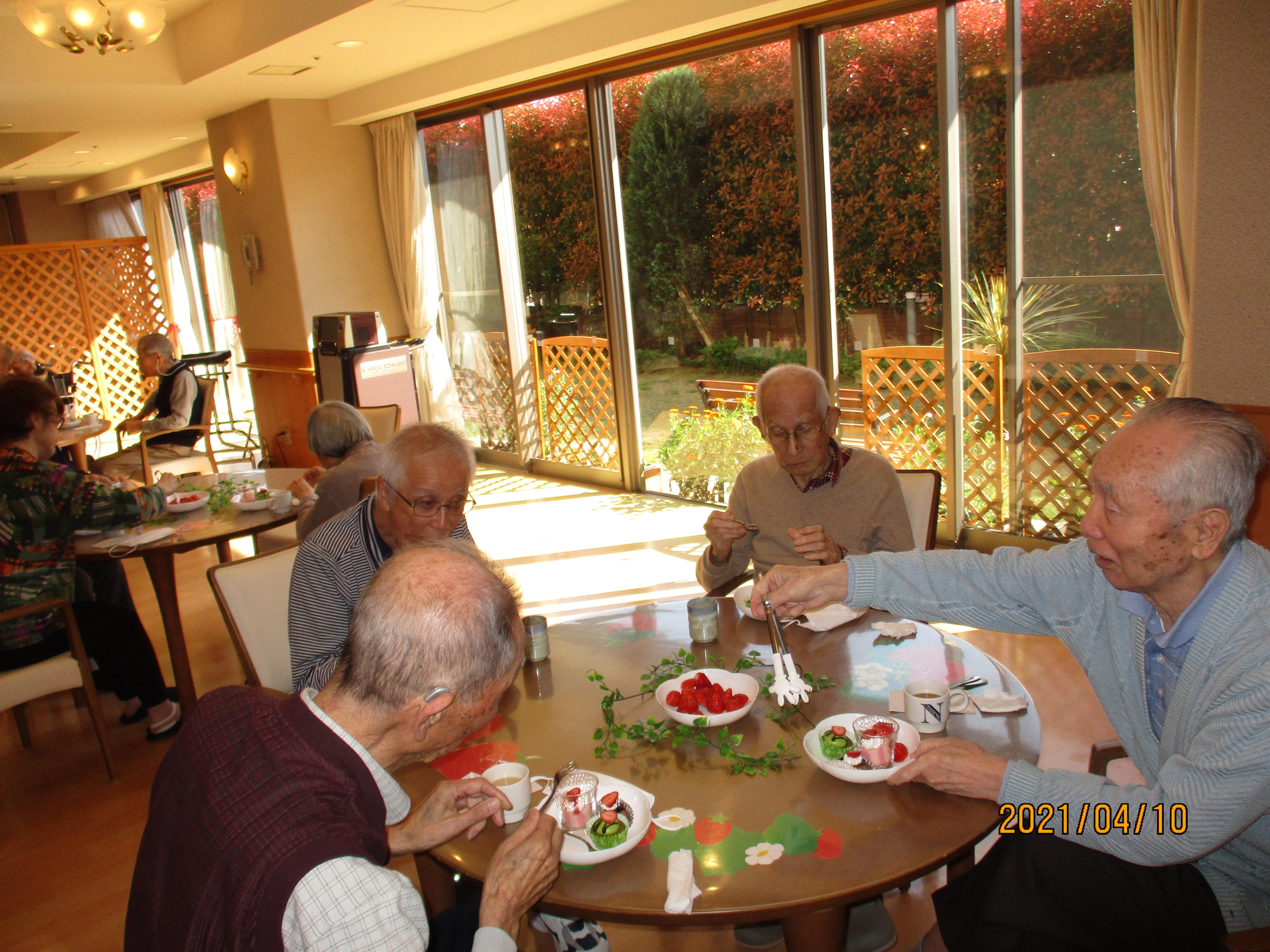 厨房スタッフ力作のイチゴデザートを飾りつけて、各々好きなドリンクを選んでいただき、提供させて頂きました。