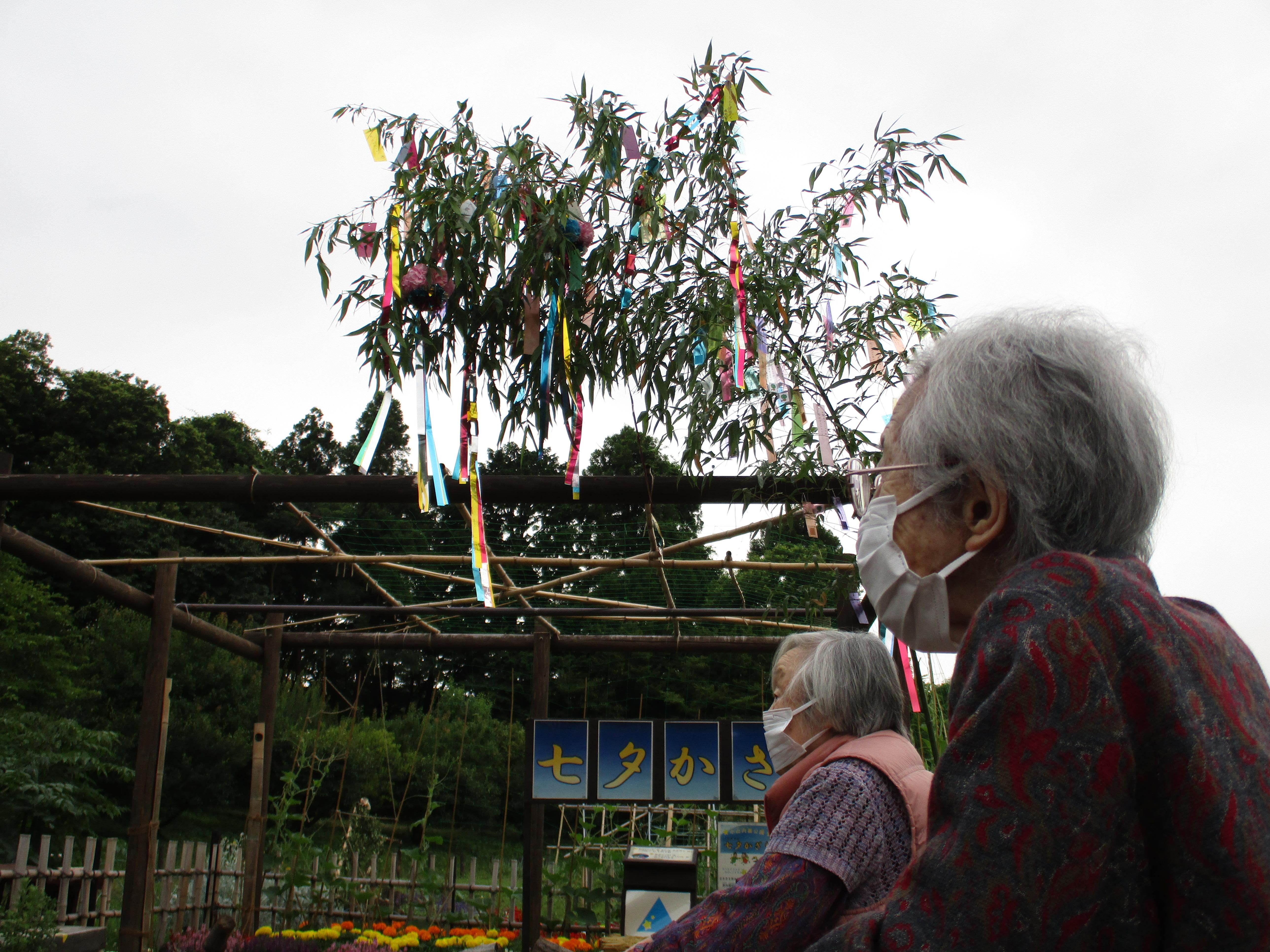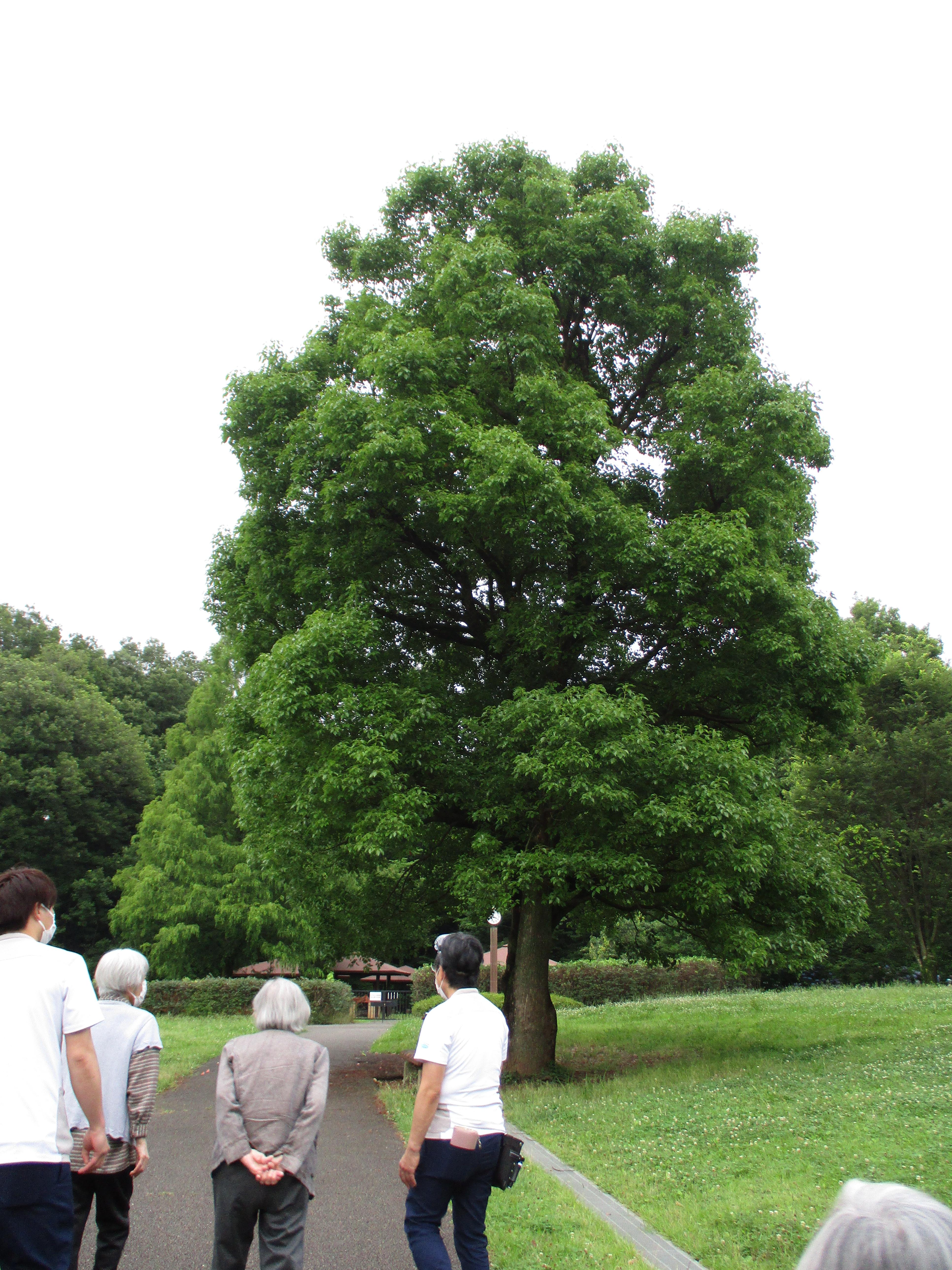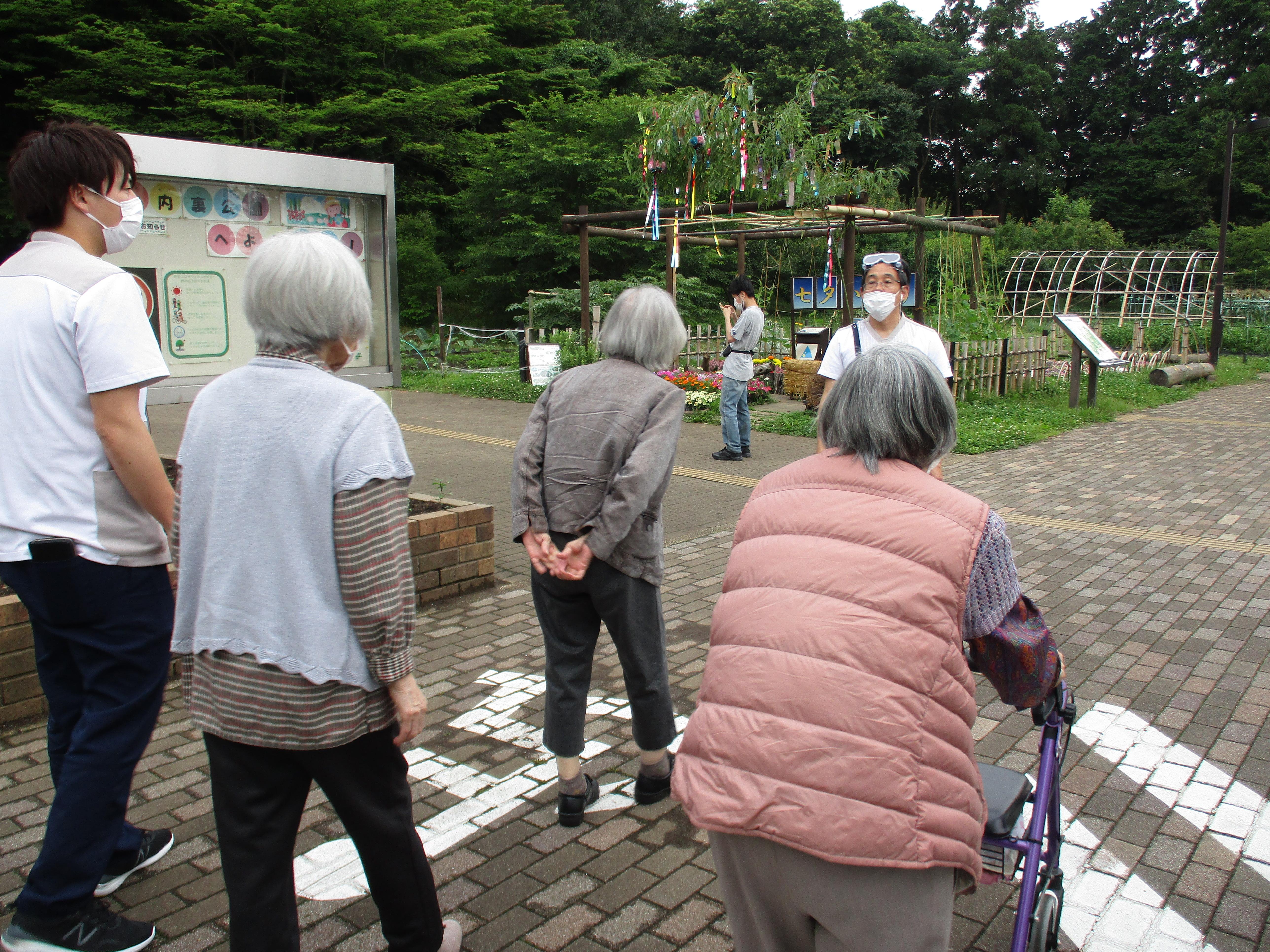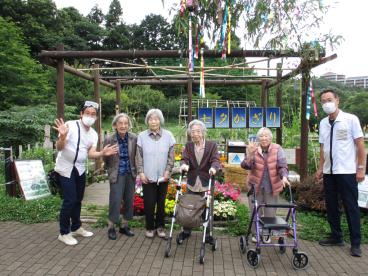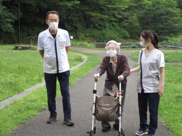 歩行訓練のため、機能訓練指導員がお客様4名を近くの公園にお連れしました。