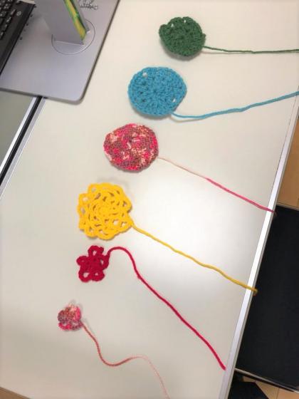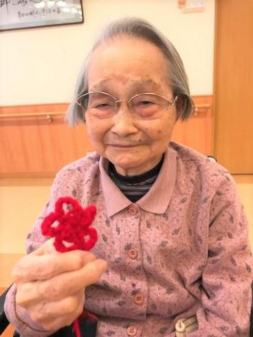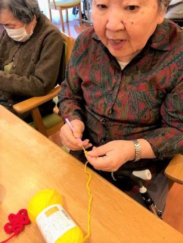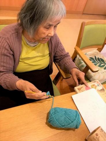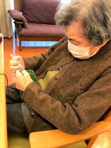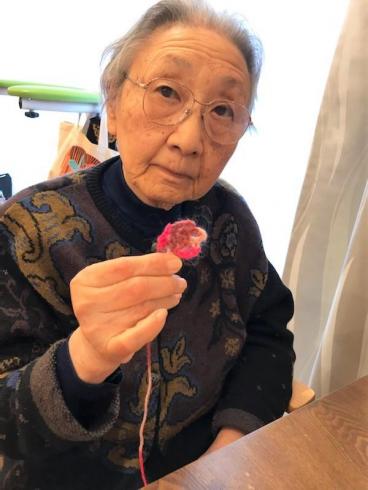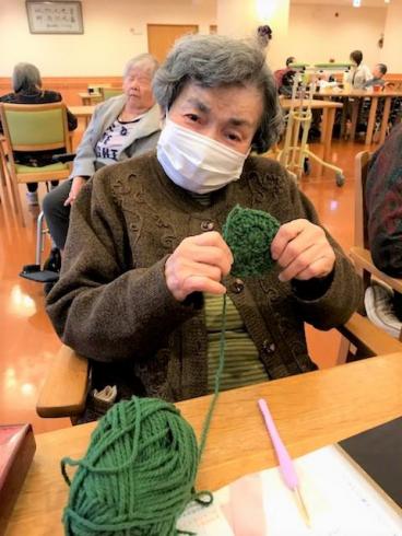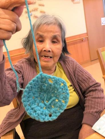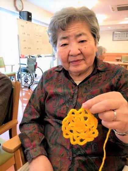 今回の編み物飾りは、頭の体操と手の運動などとあわせ、意欲向上、達成感など、「自分で出来るんだ」という肯定感など、お客様の意識への働きかけをも目的としています。