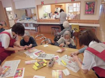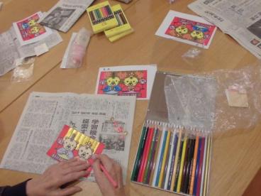 お手本を参考に塗り絵を行い、その後はフォトスタンドの飾りつけです。