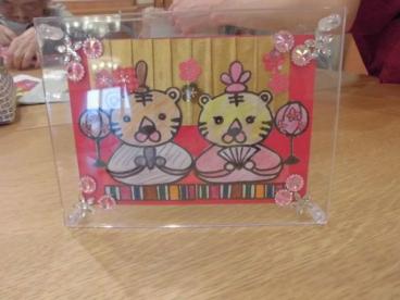 今月の手芸クラブでは、虎のお雛様の可愛らしいフォトスタンドを作成しました。