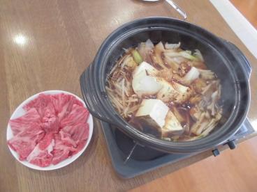 すき焼き鍋の中にお肉を入れると、甘く美味しい匂いが漂ってきました。