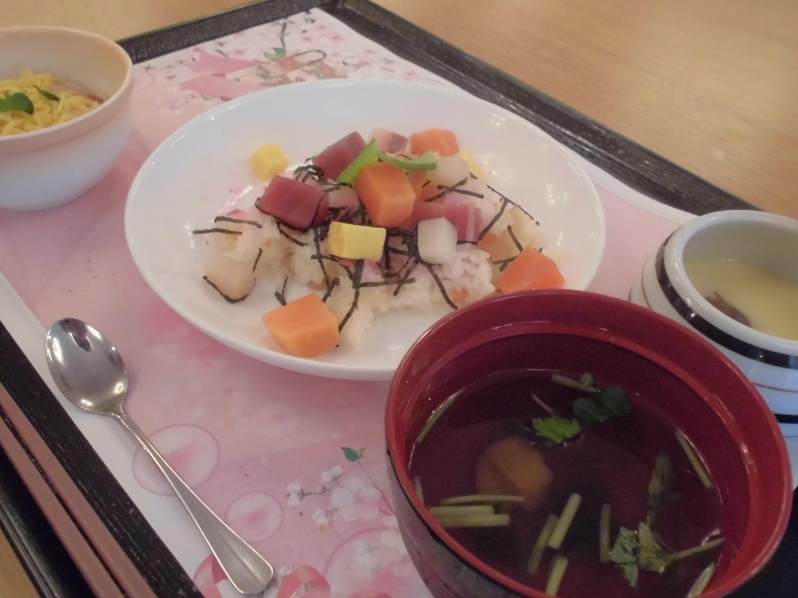 ちらし寿司と蛤のお吸い物、そして桜そば・桜の花の塩漬けをのせた、茶わん蒸しをご用意しました。
