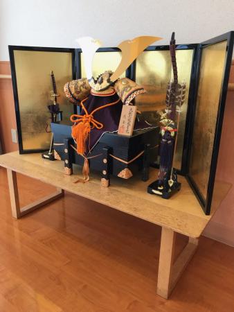 御寄附でいただいた立派な武者飾りはロビーに、兜飾りは面会ブースのある食堂に飾らせて頂いています。ご覧になったご家族もいらっしゃるのではないでしょうか?