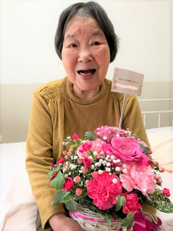 カードを読み上げながら、「大好きな旦那さまからのお花ですよ」と伝えると、『わぁー!!』と笑顔がこぼれたお客様も。(この中にいらっしゃいます)
