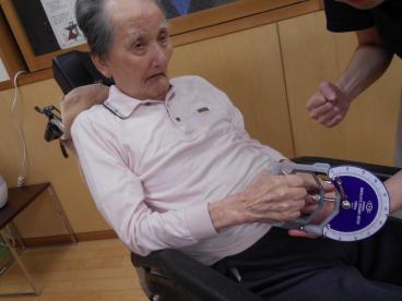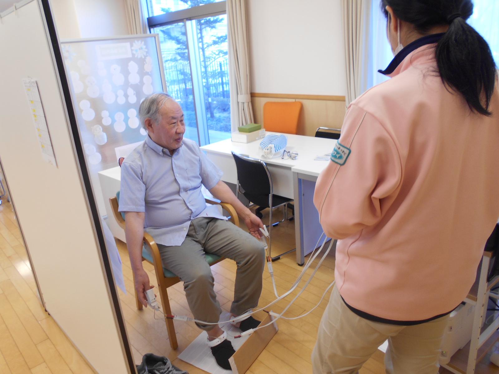 立ちあがり・座りのテストや、歩行速度のチェック・握力なども測定します。