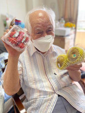 「歩いて自分で買い物に行きたいね。」と仰りながら、注文された果物を持ってポーズをとってくださいました!