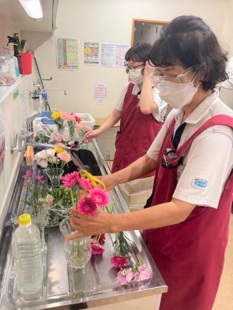 居心地の良い空間を…と、クリーンサポートのスタッフが綺麗に活けて整え、そして飾っています。ロビーやエントランス、トイレや食堂と働く私たちも癒されています。