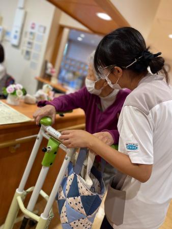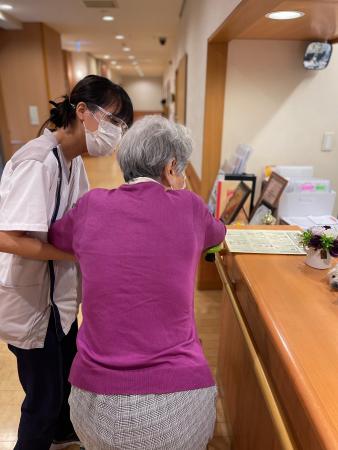 機能訓練指導員が担当階のお客様と一階に、お散歩に来ました。