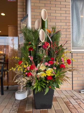 いつもお願いしているフラワーアレンジメントの先生がスタッフさんと共に来設し、寒風吹きさぶ中、玄関前にて現場でお花を調整しながら設置してくださいました!