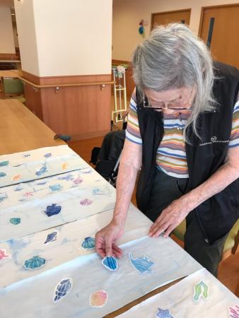 お客様参加型の変わり風呂の制作は、機能訓練を楽しみながら脳の活性化、手先の運動、協力作業などの生活リハビリも兼ねていたようです。暖簾制作を楽しみながら参加され、お客様の変わり風呂への思い入れも強くなったようです。