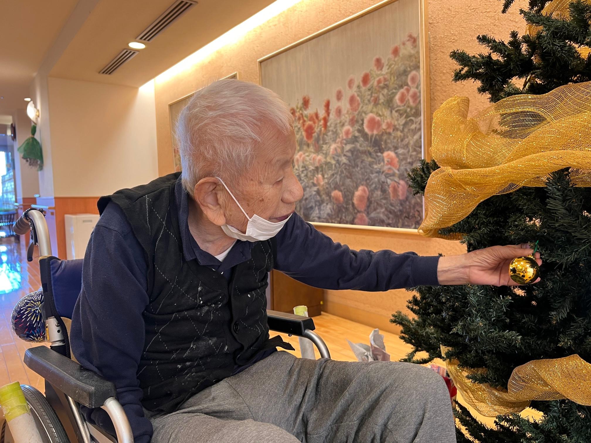 その日、3階のお客様が機能訓練指導員と共に、機能訓練の散歩を兼ねて降りてこられていました。ツリーの大きさにお客様も感嘆の声を上げ、普段より歩行訓練がはかどっていたようです。何よりも楽しまれている様子に、スタッフも一緒に笑顔に。