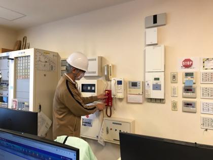 事務所に設置されている防災監視盤の確認方法や、消防署に直接繋がる赤い色の火災通報専用電話(通報によって消防署から直接折り返しがあり、やり取りが出来ます)についての説明と使用方法の確認をします。